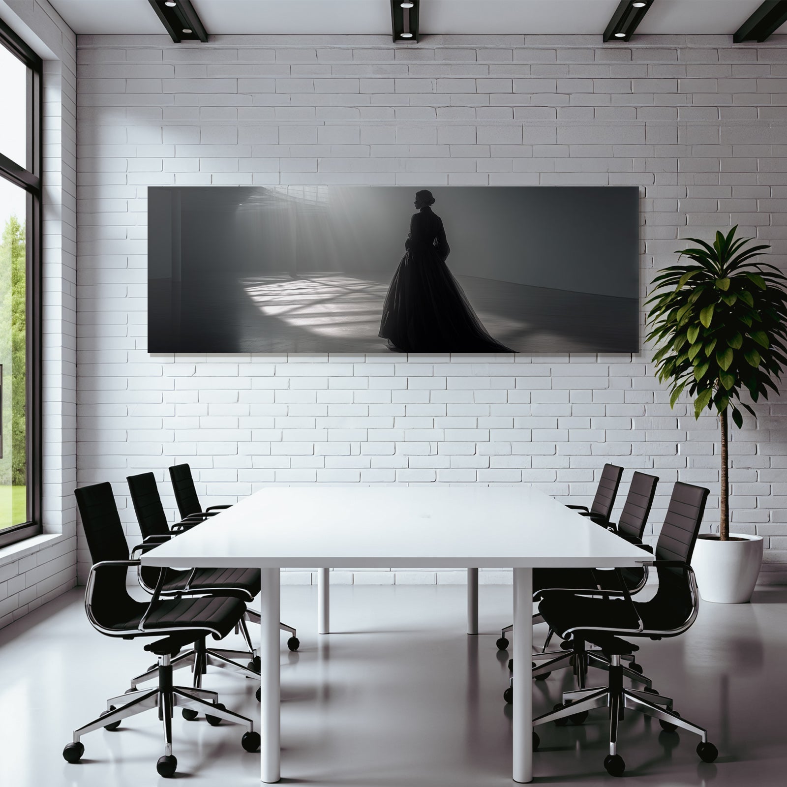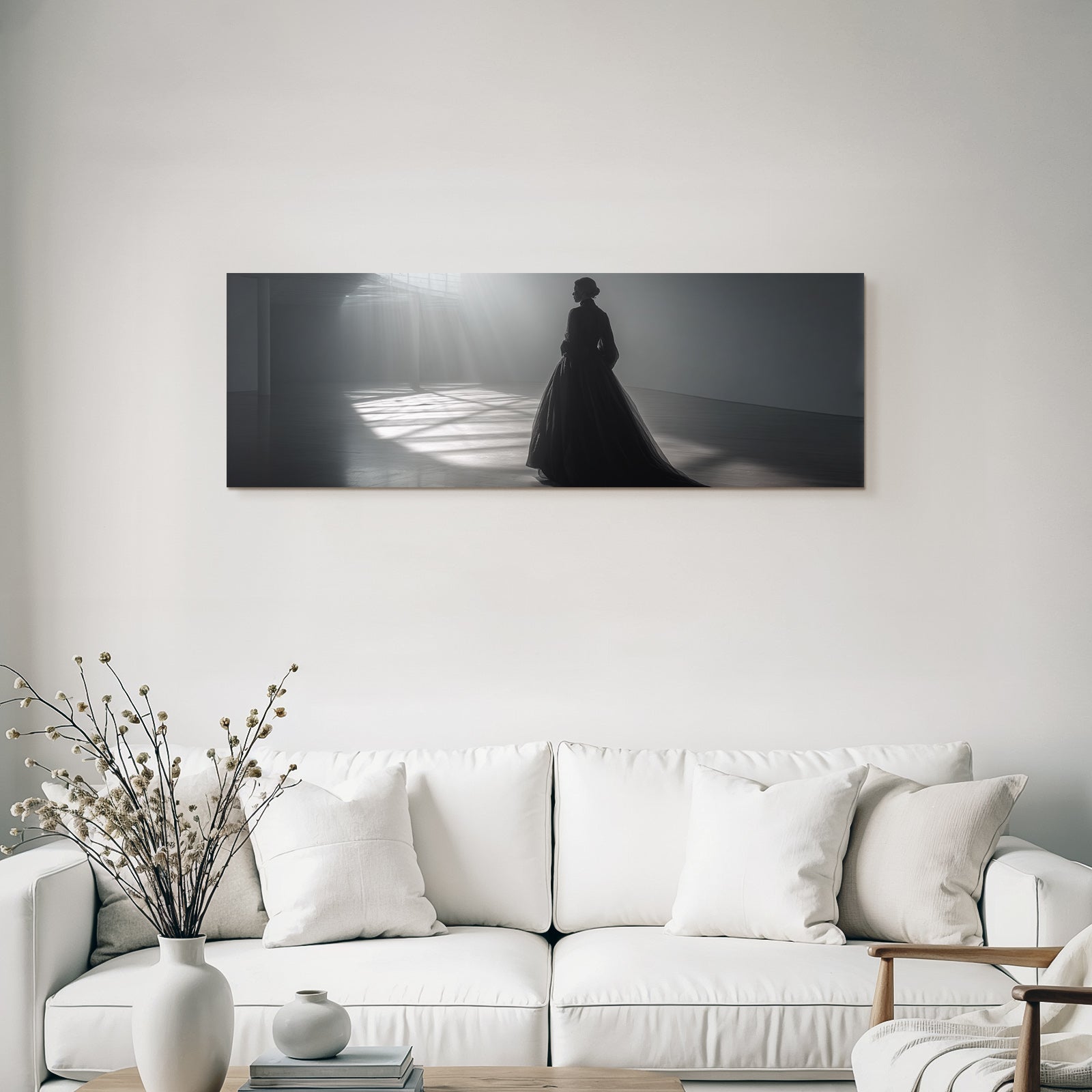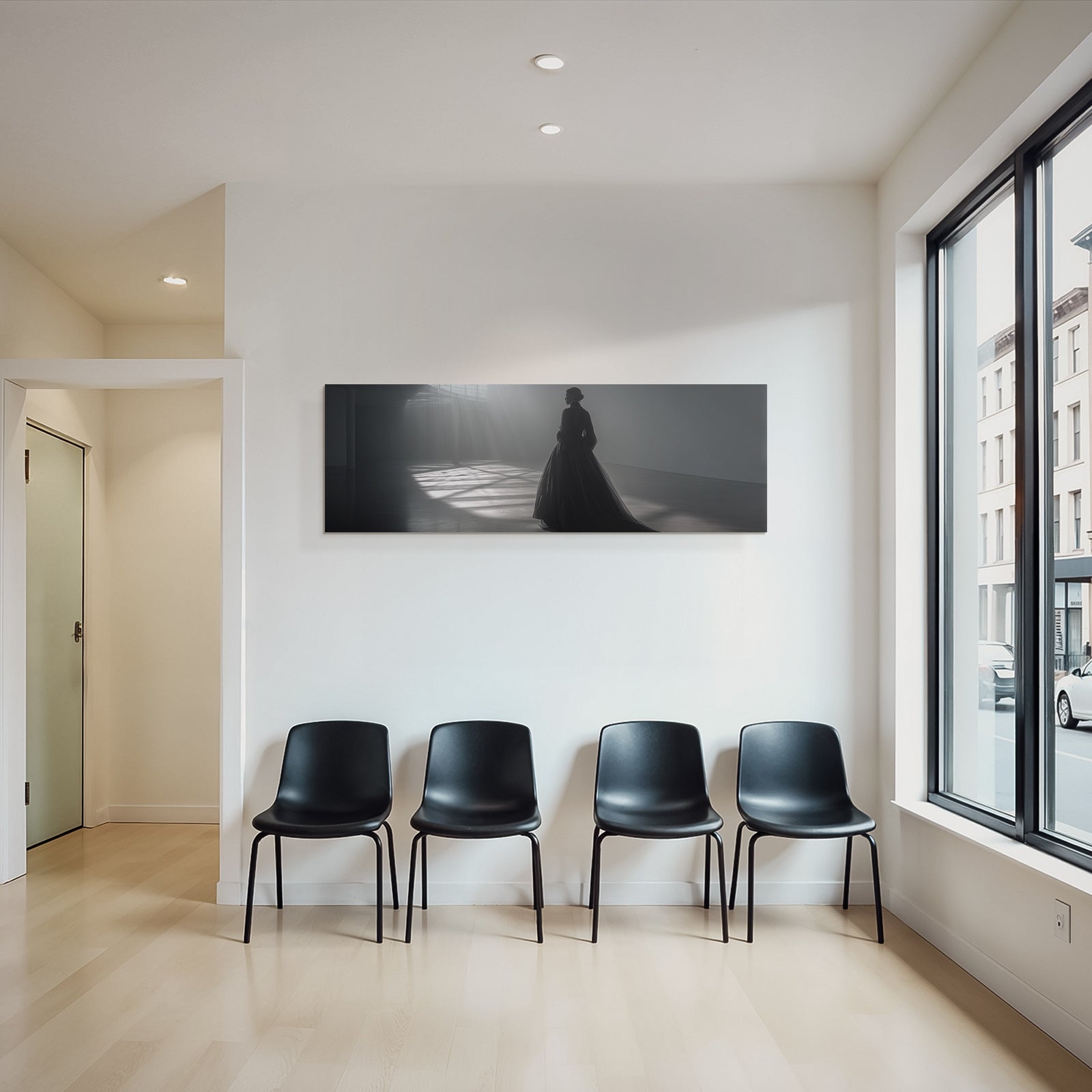 Modern, stilvoll, individuell: „„Frau Im Abendlicht In Leerer Halle““ im Stil Fotografie überzeugt im hochwertigen FameFrame durch klare Formen und starke Farben.