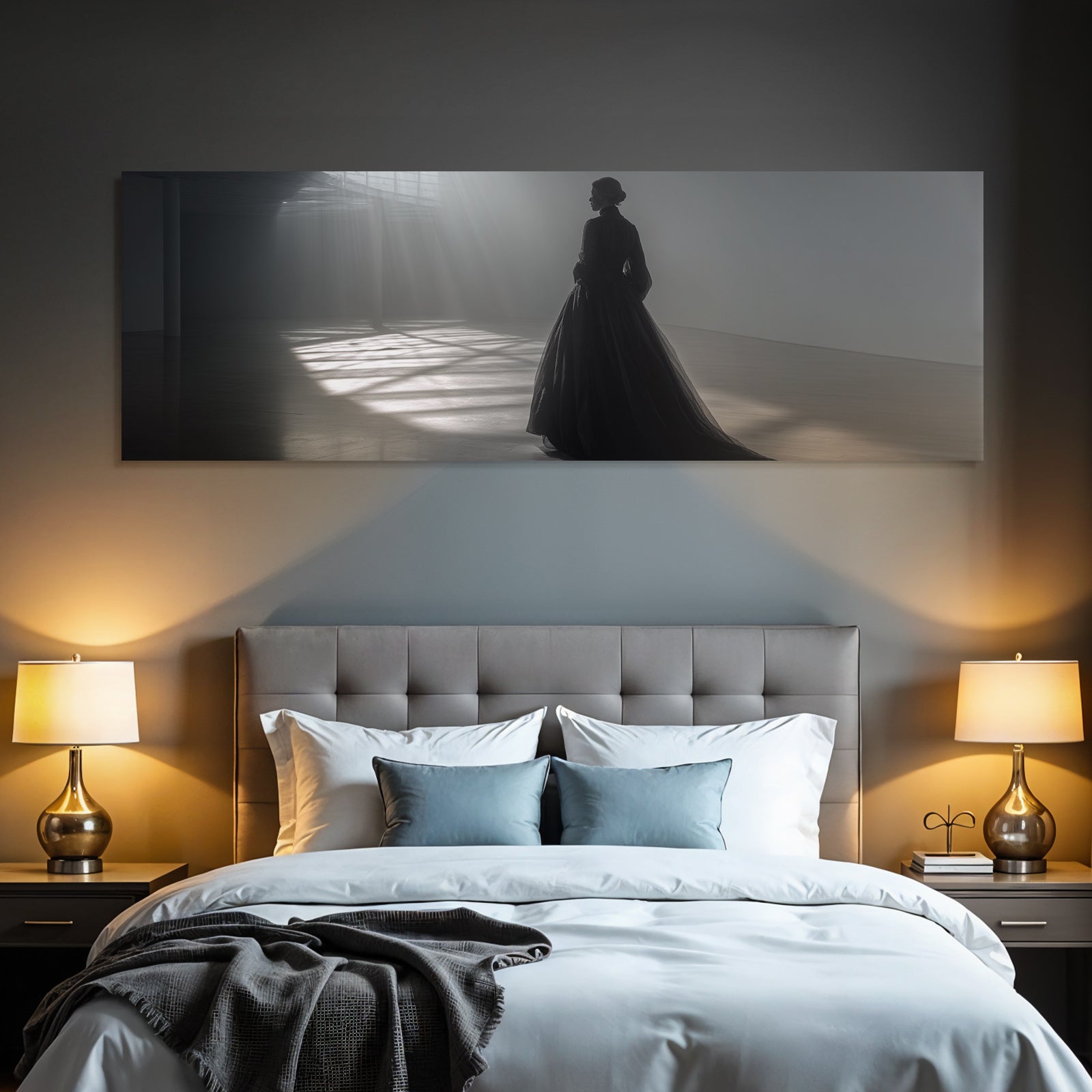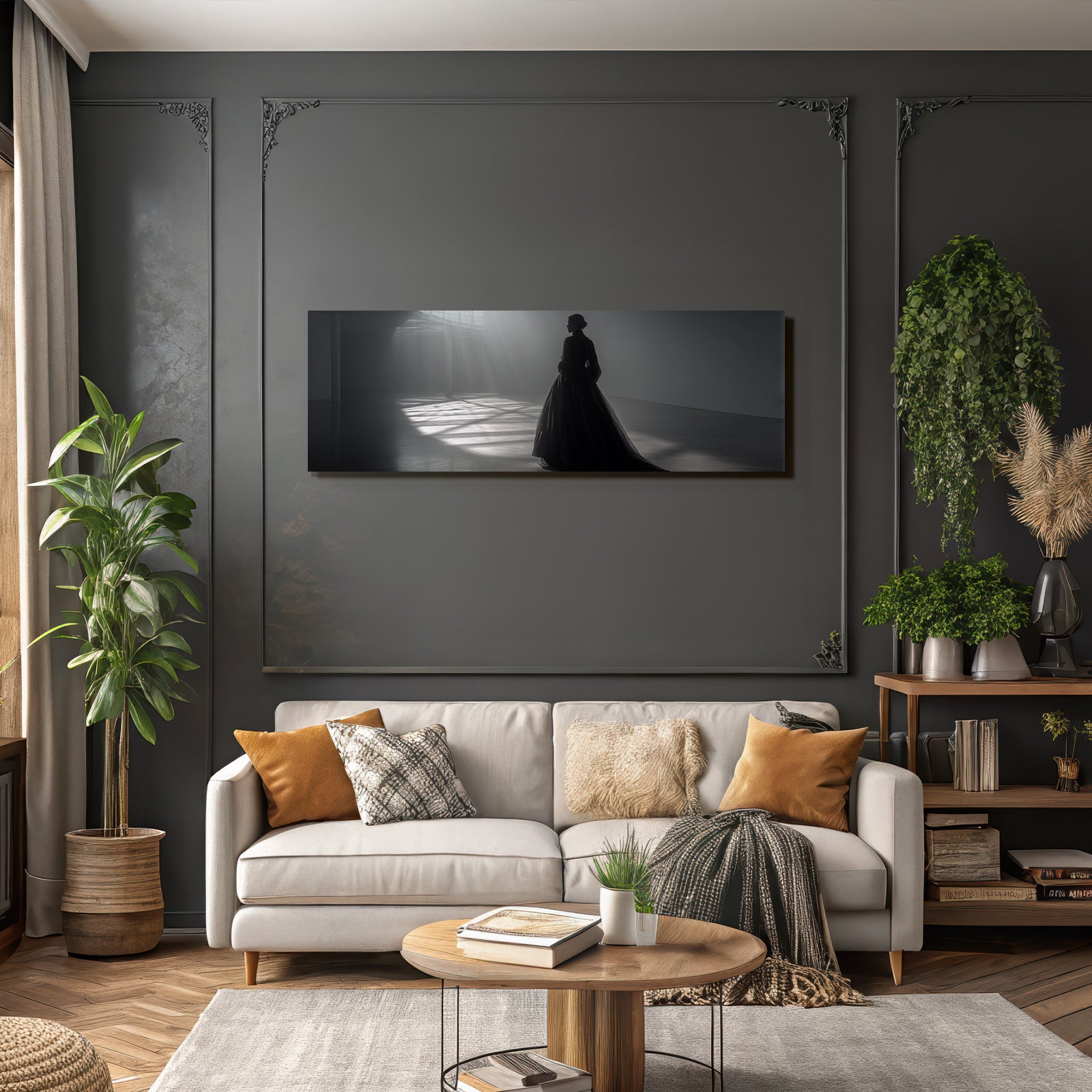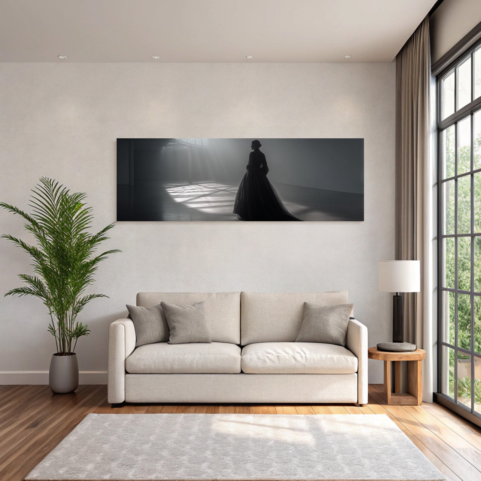 Modern, stilvoll, individuell: „„Frau Im Abendlicht In Leerer Halle““ im Stil Fotografie überzeugt im hochwertigen FameFrame durch klare Formen und starke Farben.