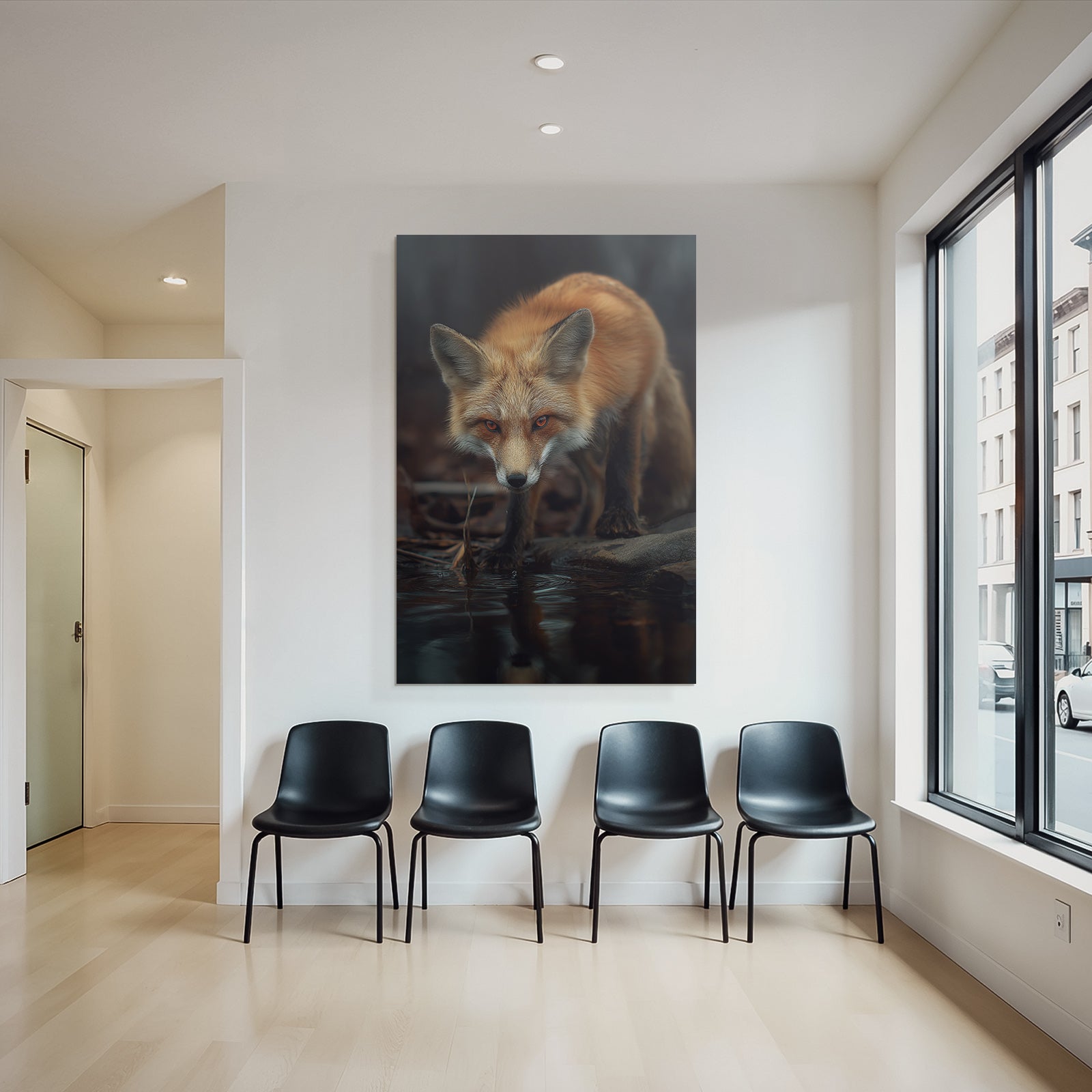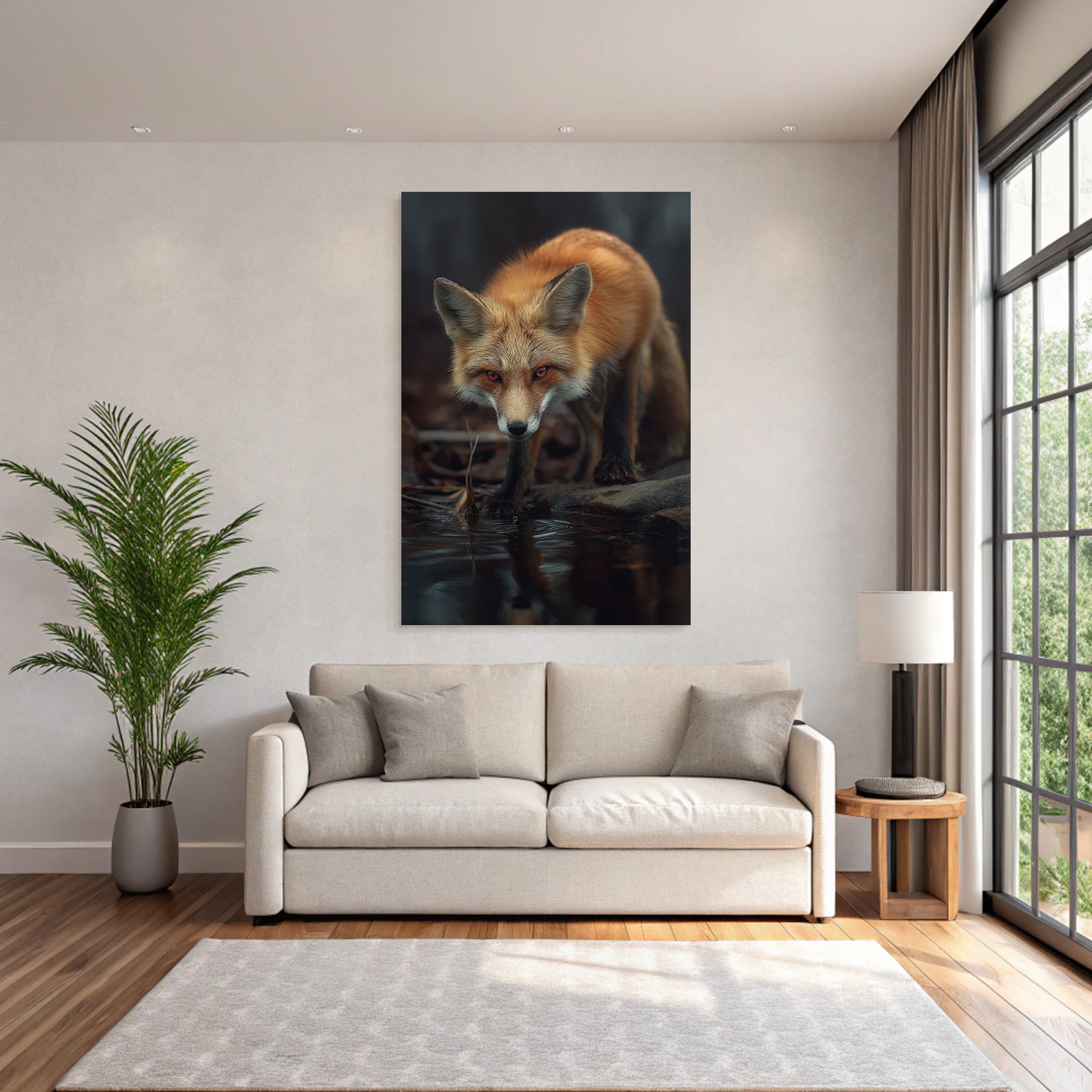 „„Fuchs Gesicht Koerper Wasser Nahe““ im Stil Fotografie sorgt für stilvolle Ruhe im Schlafzimmer oder inspirierende Energie im Büro – perfekt im FameFrame inszeniert.