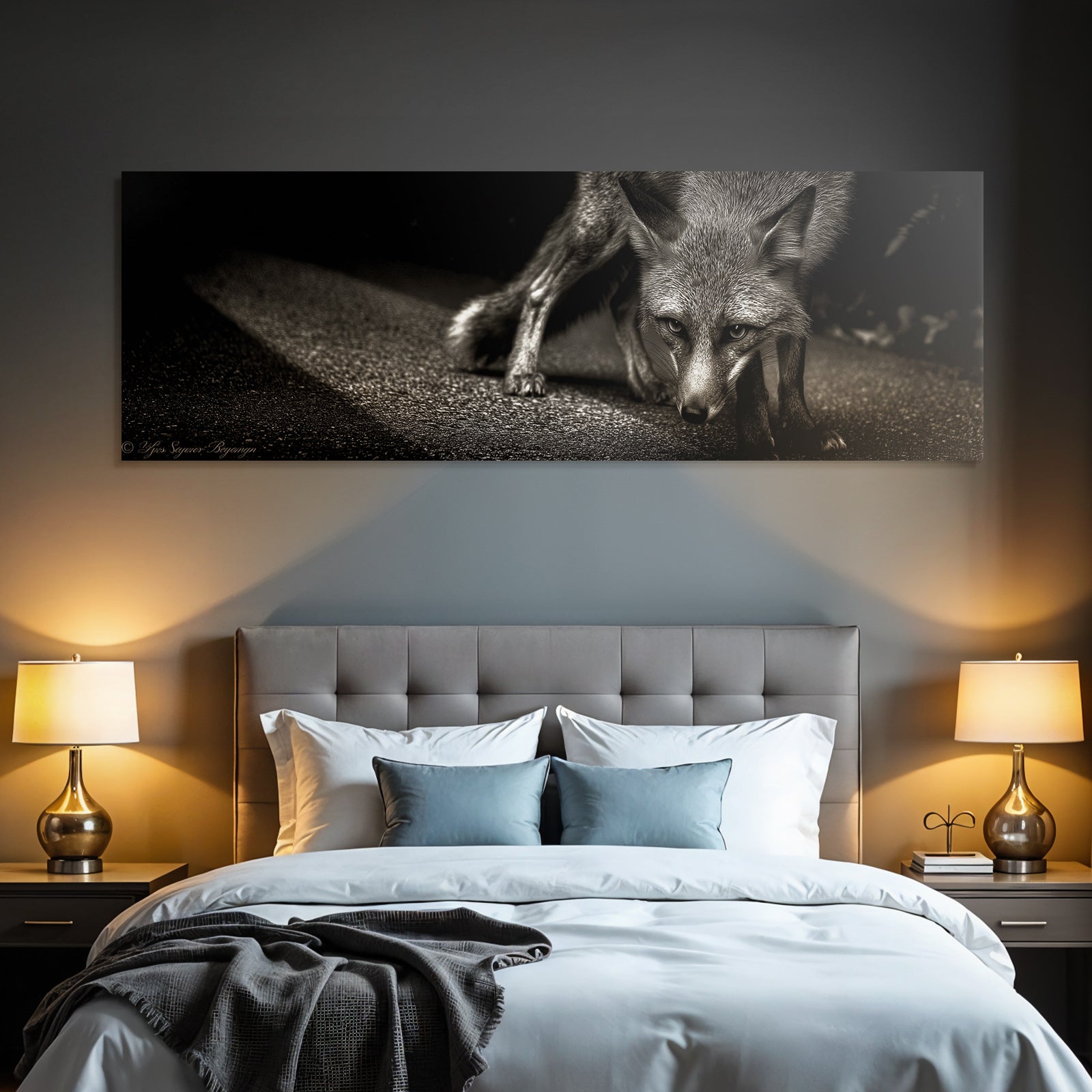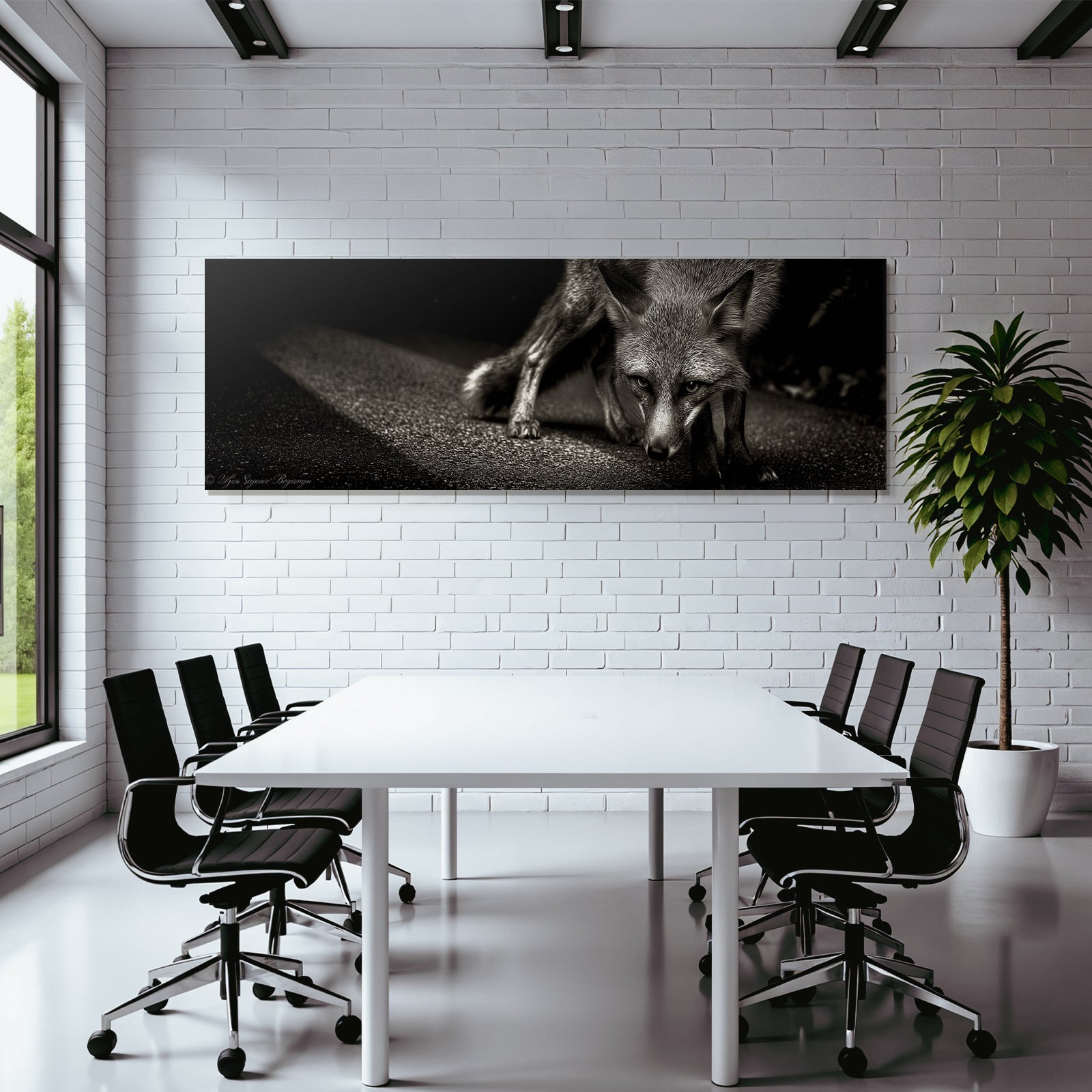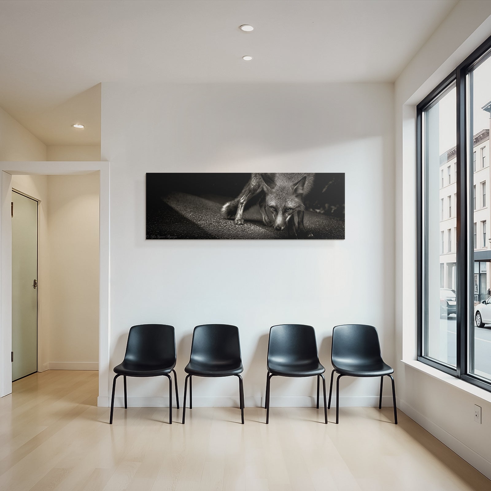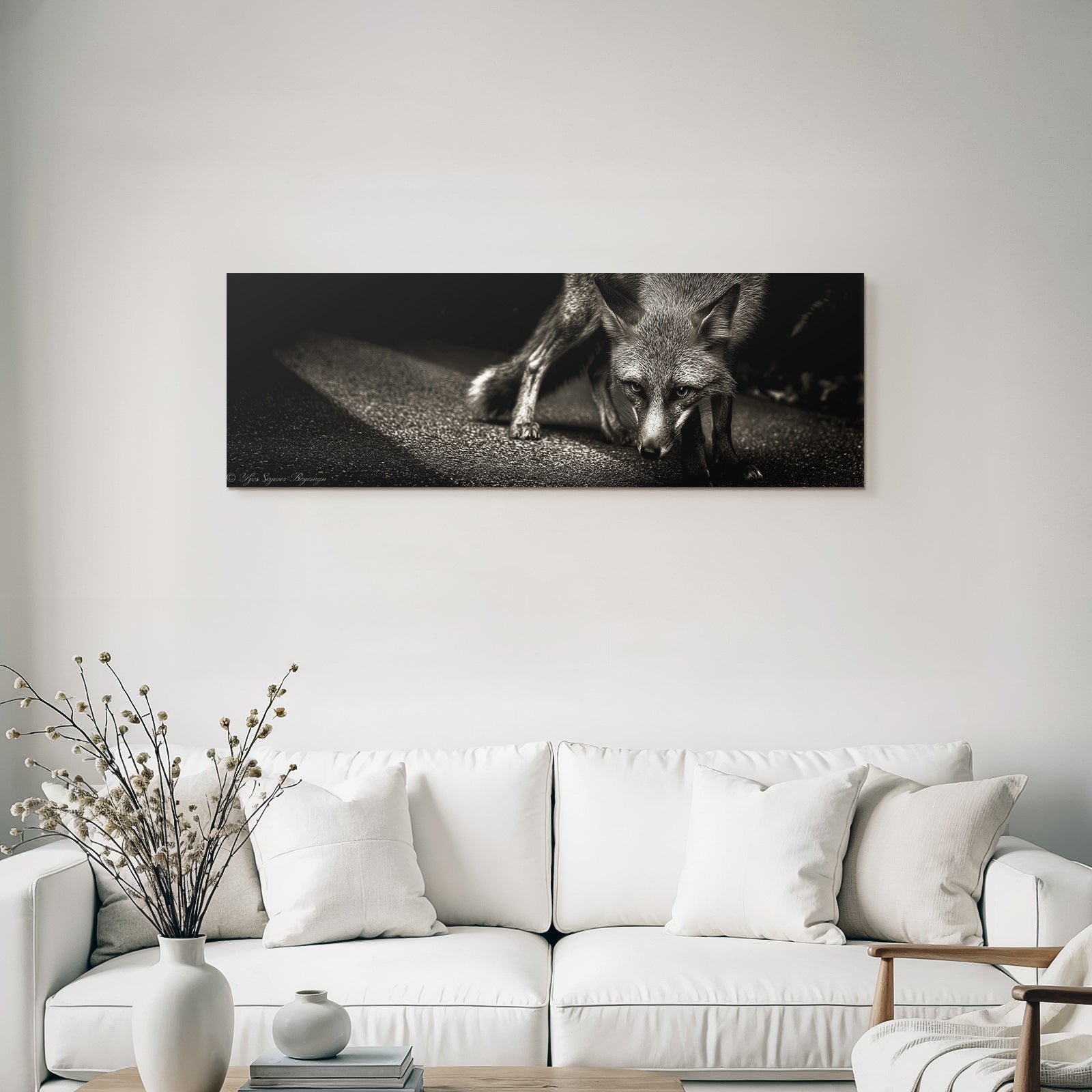 Setze stilvolle Akzente mit Kunst im Look von Fotografie. Das Werk „Fuchs Stilisiert Schwarz Weiß“ entfaltet im edlen FameFrame seine volle Wirkung.