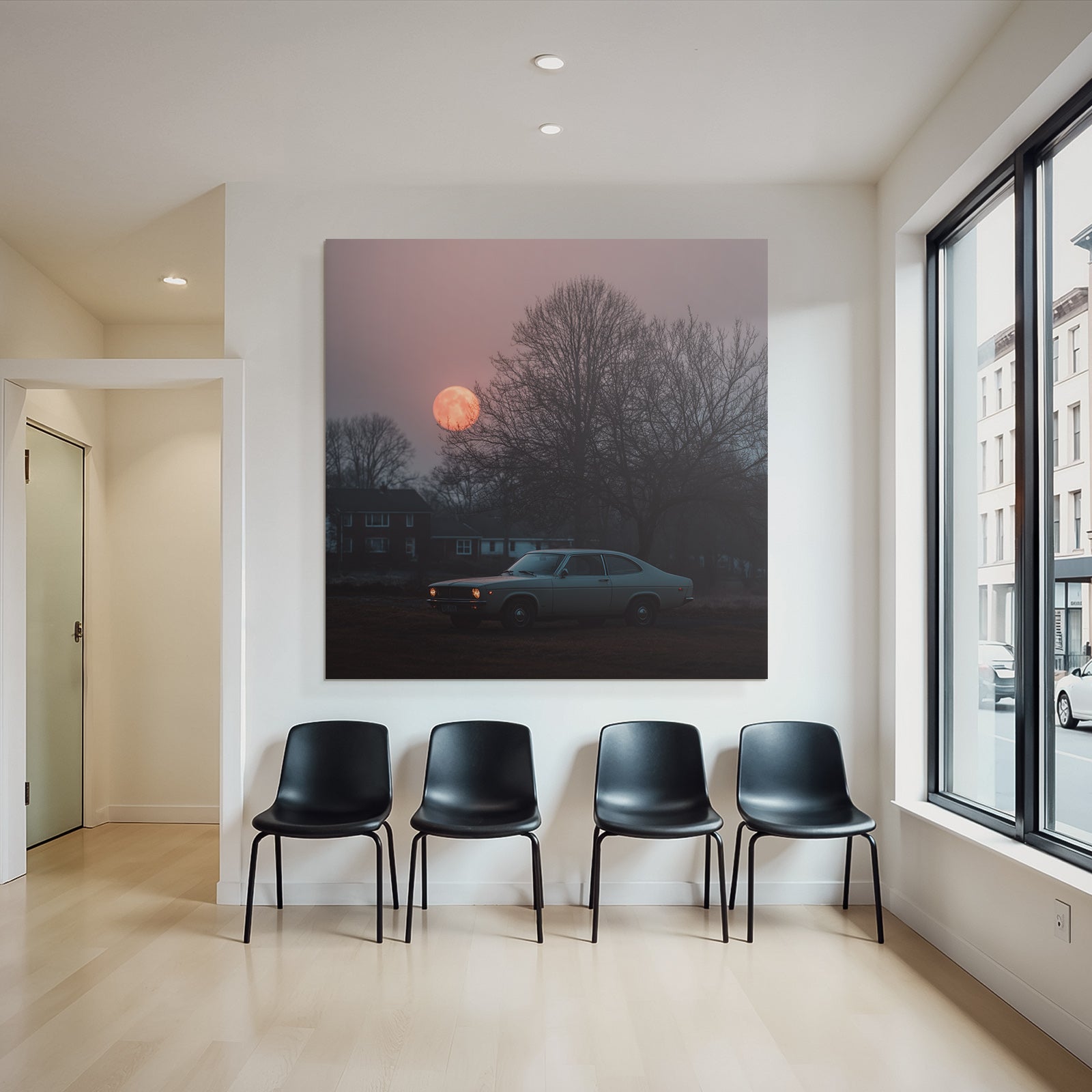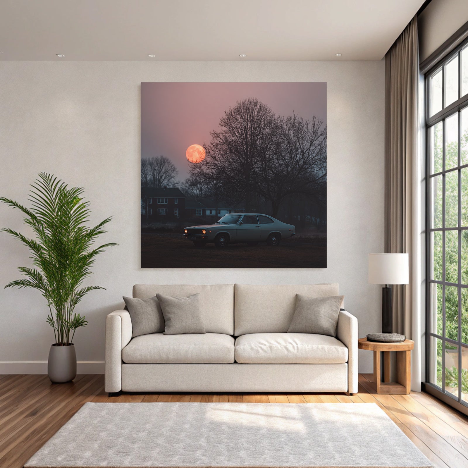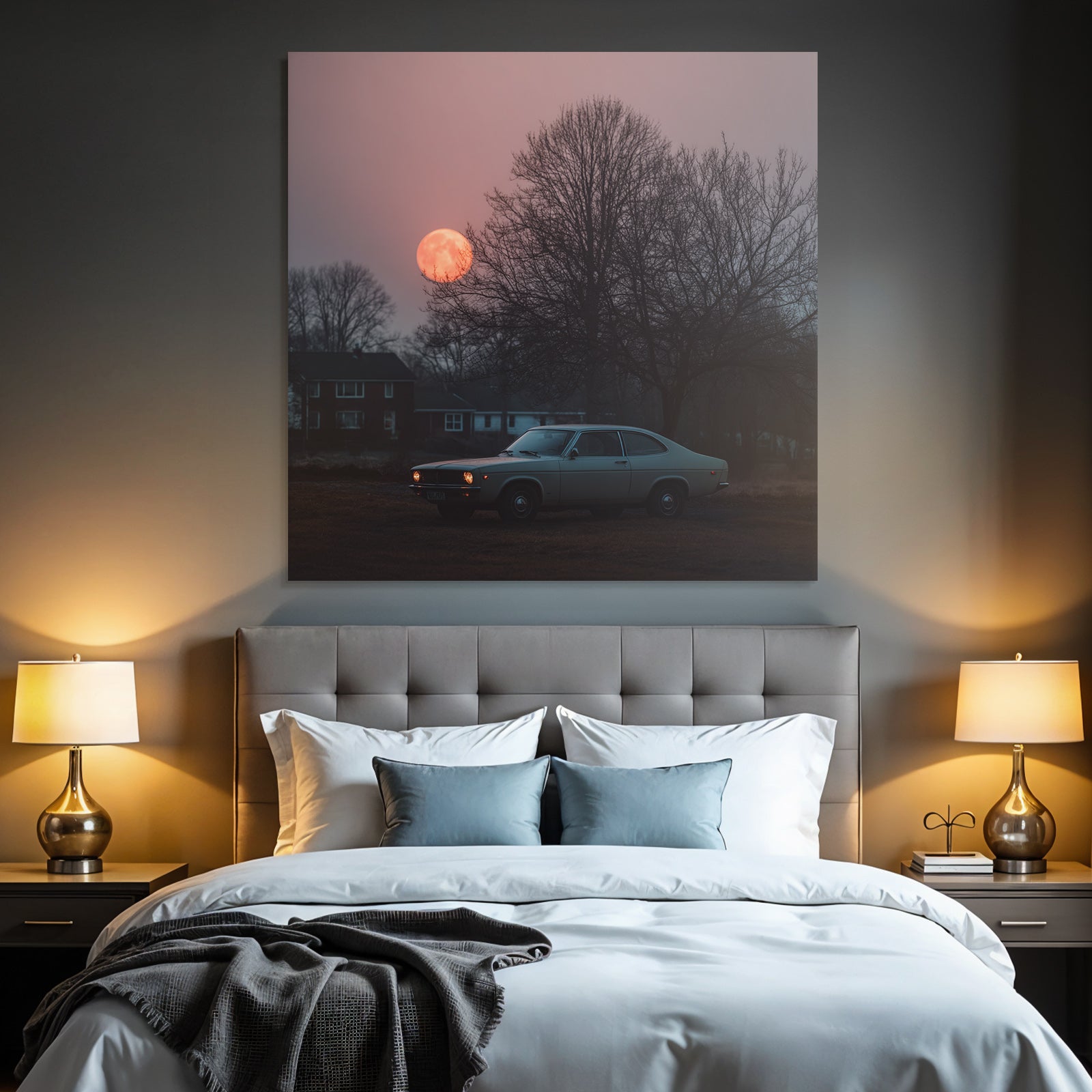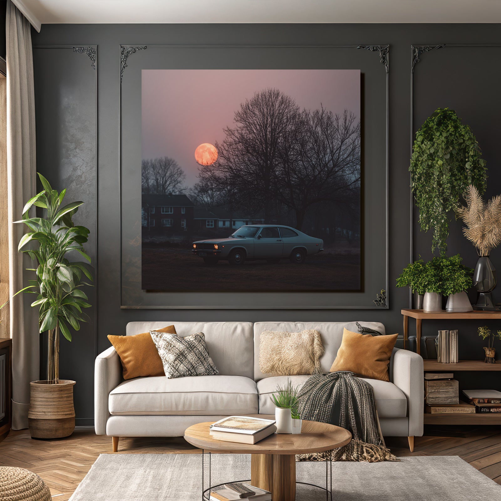 Mit Fotografie-Elementen und klarer Wirkung verleiht „„Klassisches Auto Im Feld Beim Sonnenuntergang““ Deinem Raum Persönlichkeit – eingerahmt im exklusiven FameFrame.