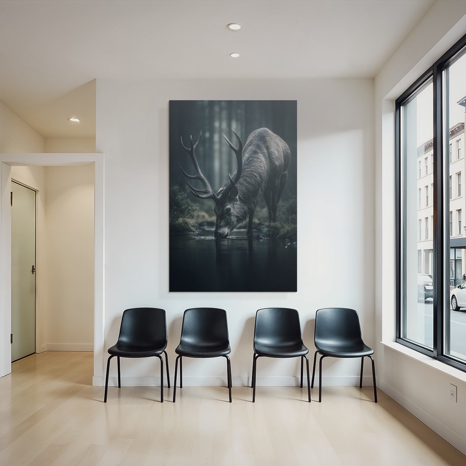 Ideal für Innenräume mit Stil: „„Landscape Reh Trinke Wasser Wald““ im Stil Fotografie zieht im FameFrame die Blicke auf sich – egal ob Zuhause oder im Geschäft.