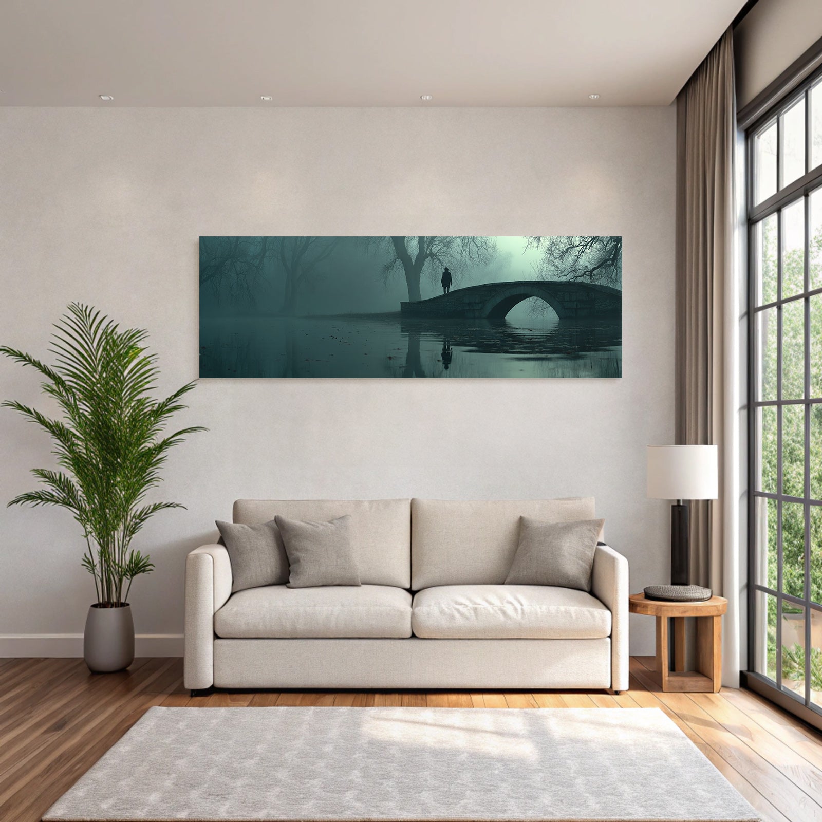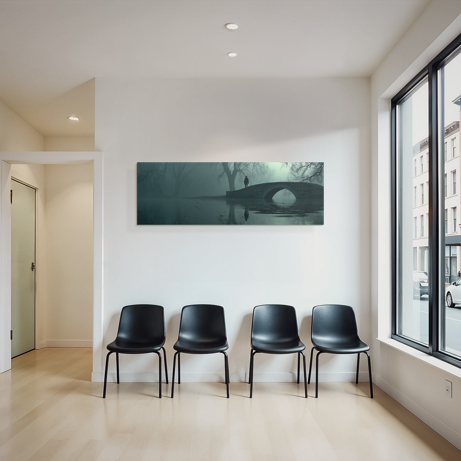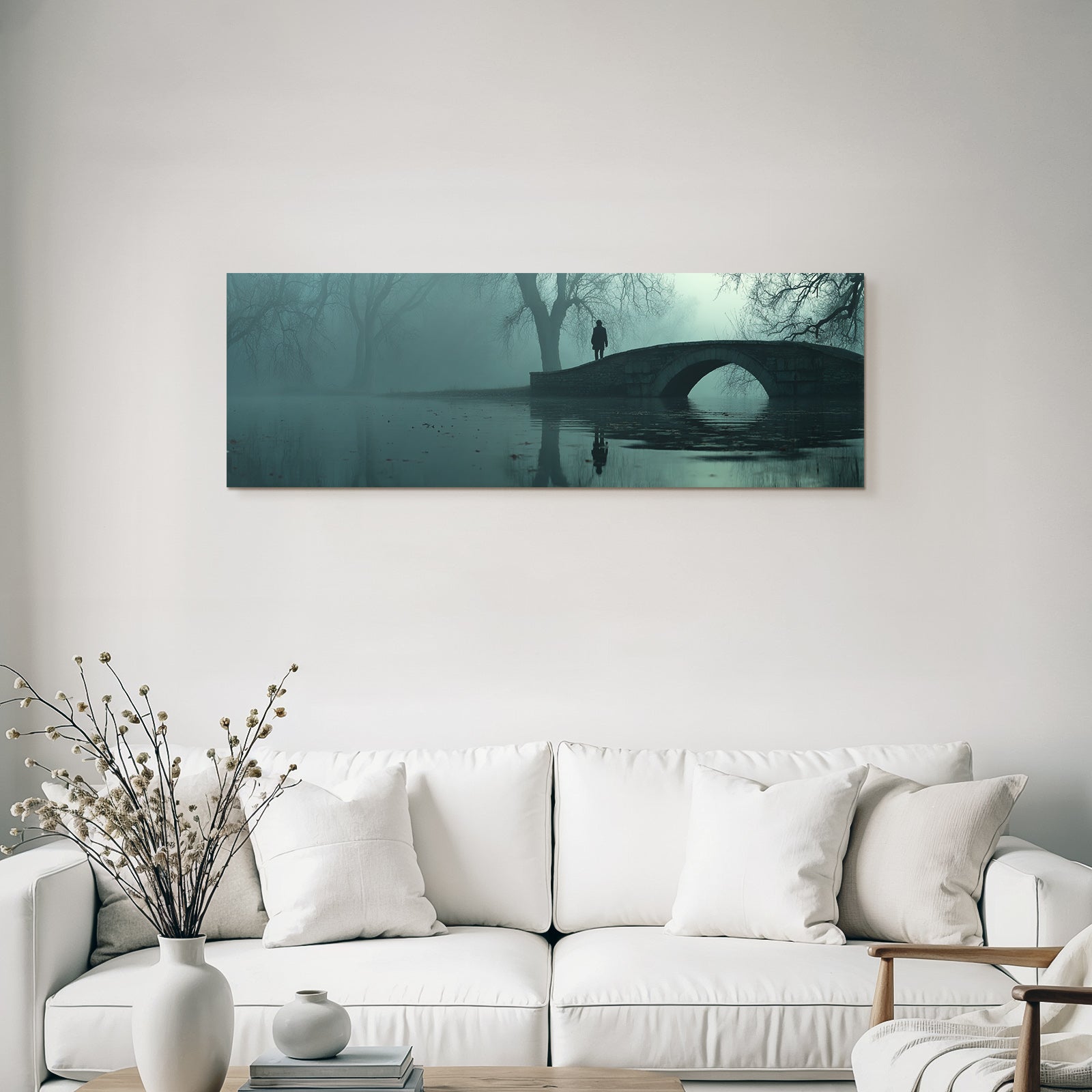 Setze Akzente im Esszimmer, Salon oder Praxisraum mit dem Kunstwerk „Neblige Brücke Im Wald“ im Stil Fotografie – gespannt im edlen FameFrame.