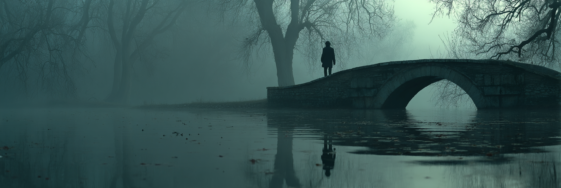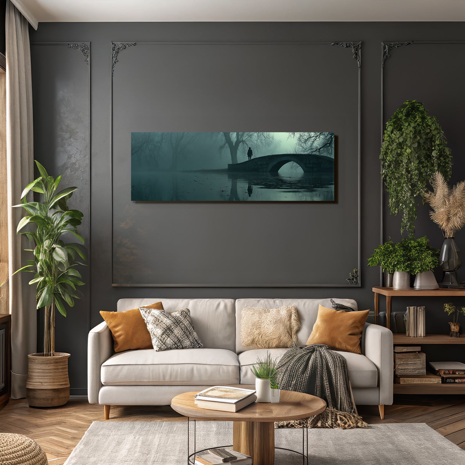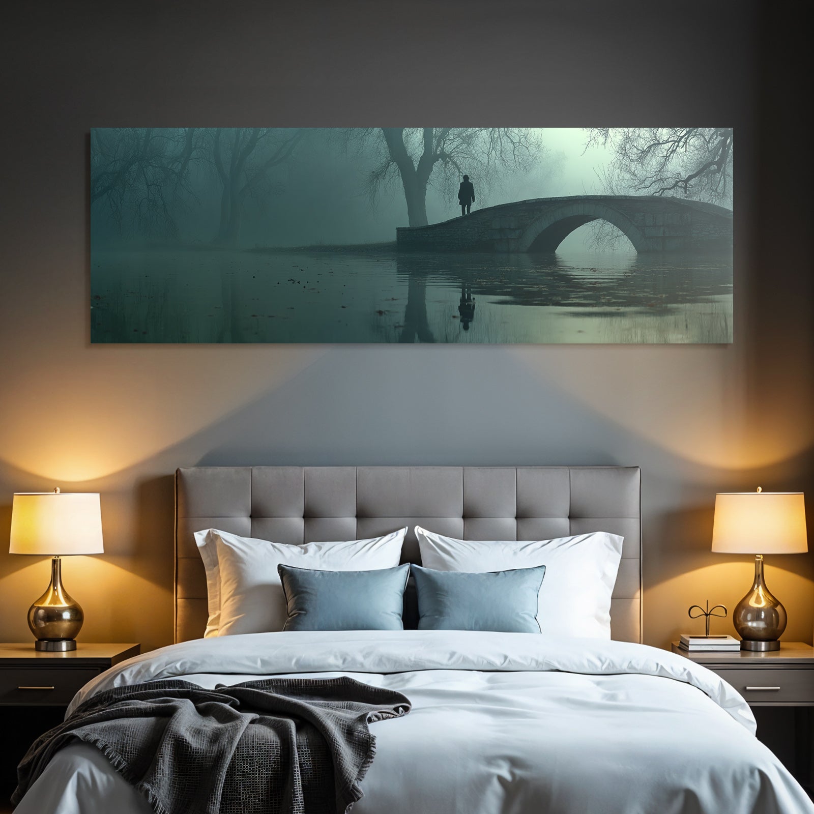Setze Akzente im Esszimmer, Salon oder Praxisraum mit dem Kunstwerk „Neblige Brücke Im Wald“ im Stil Fotografie – gespannt im edlen FameFrame.