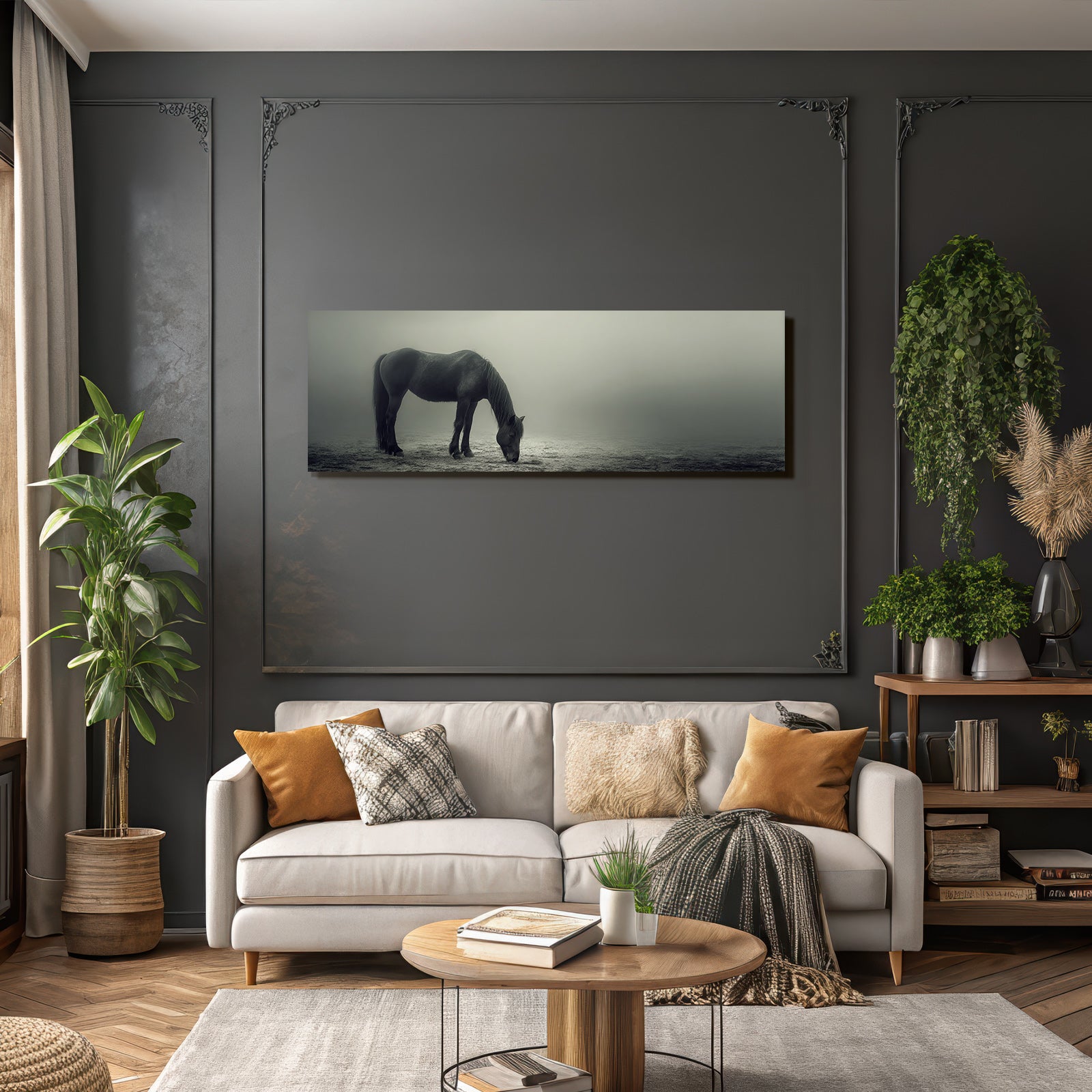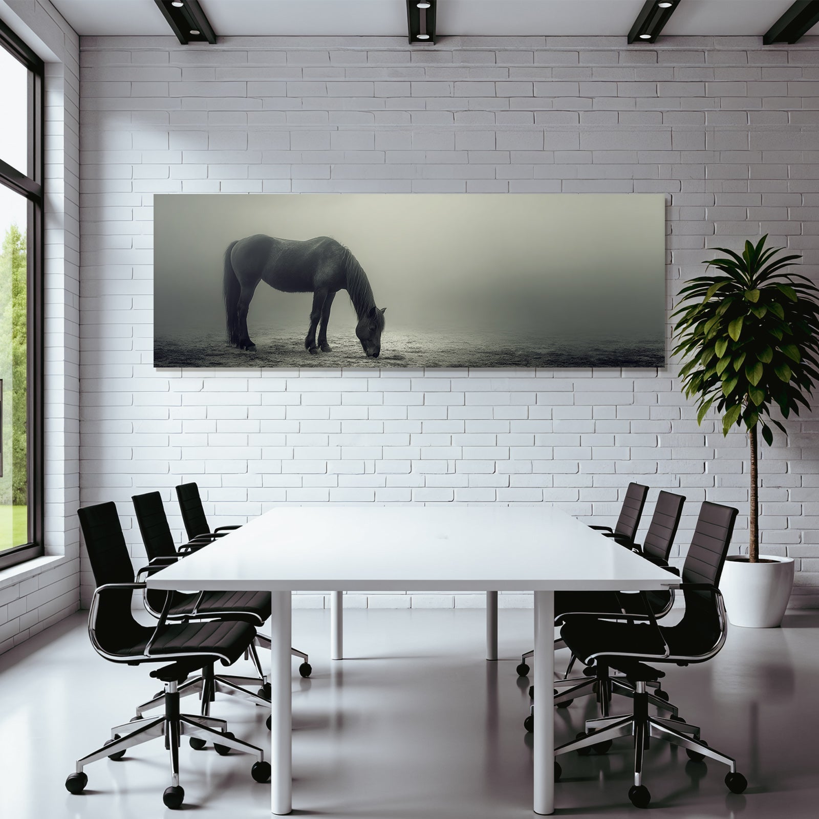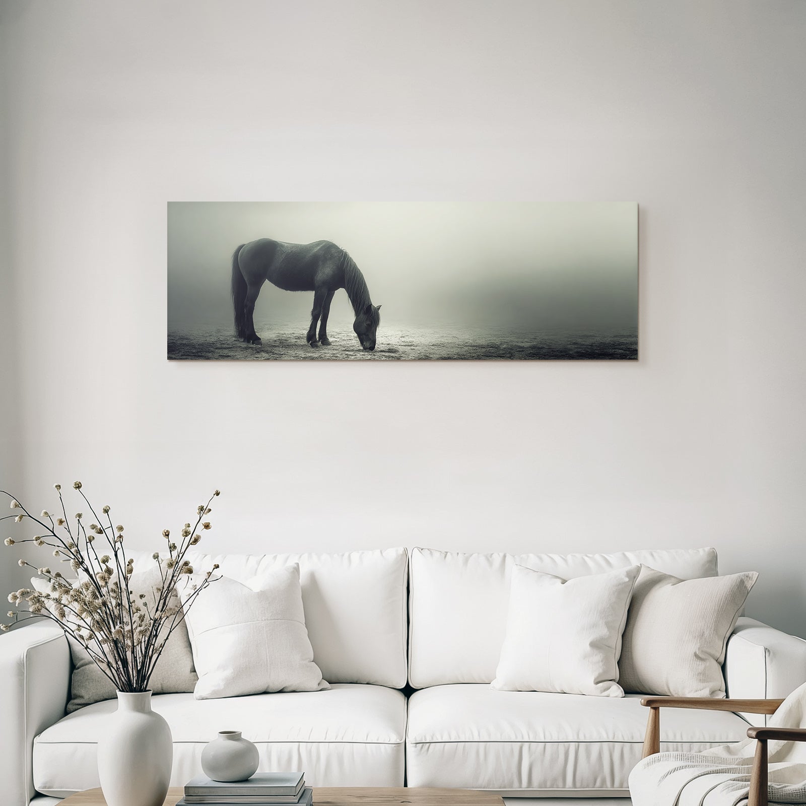 „„Pferd Im Nebligen Umfeld““ bringt den Stil Fotografie an Deine Wand – perfekt für Schlafzimmer, Homeoffice oder Besprechungsräume, edel gerahmt im FameFrame.