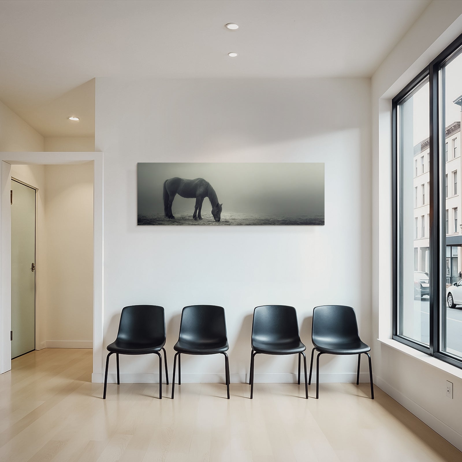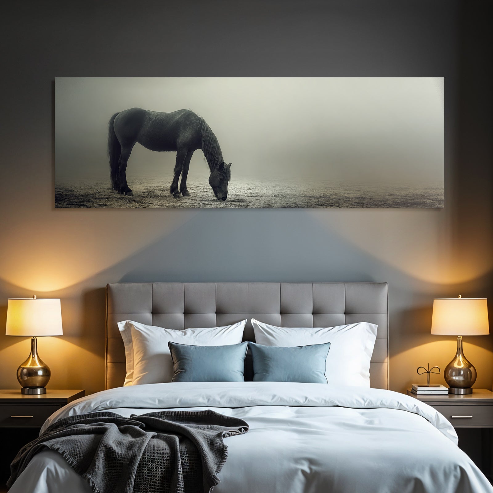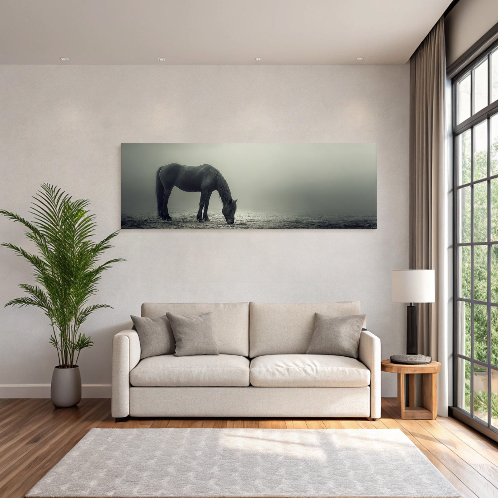 „„Pferd Im Nebligen Umfeld““ bringt den Stil Fotografie an Deine Wand – perfekt für Schlafzimmer, Homeoffice oder Besprechungsräume, edel gerahmt im FameFrame.