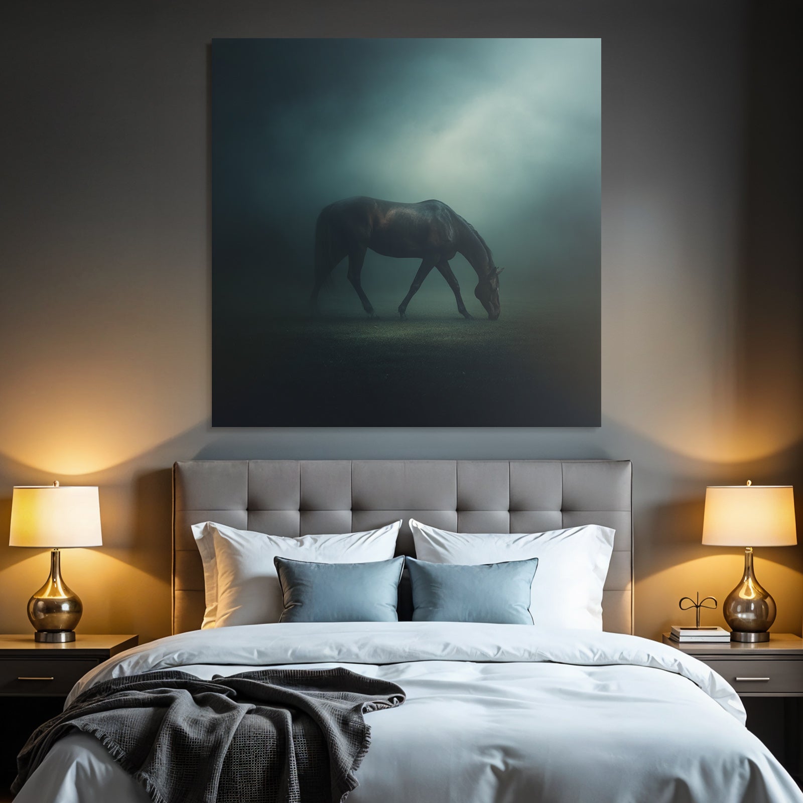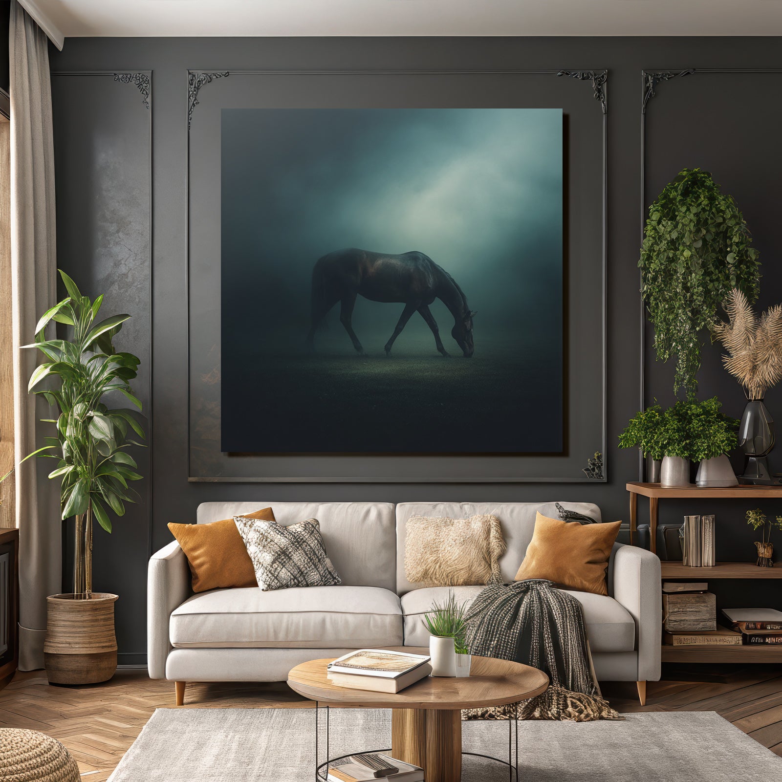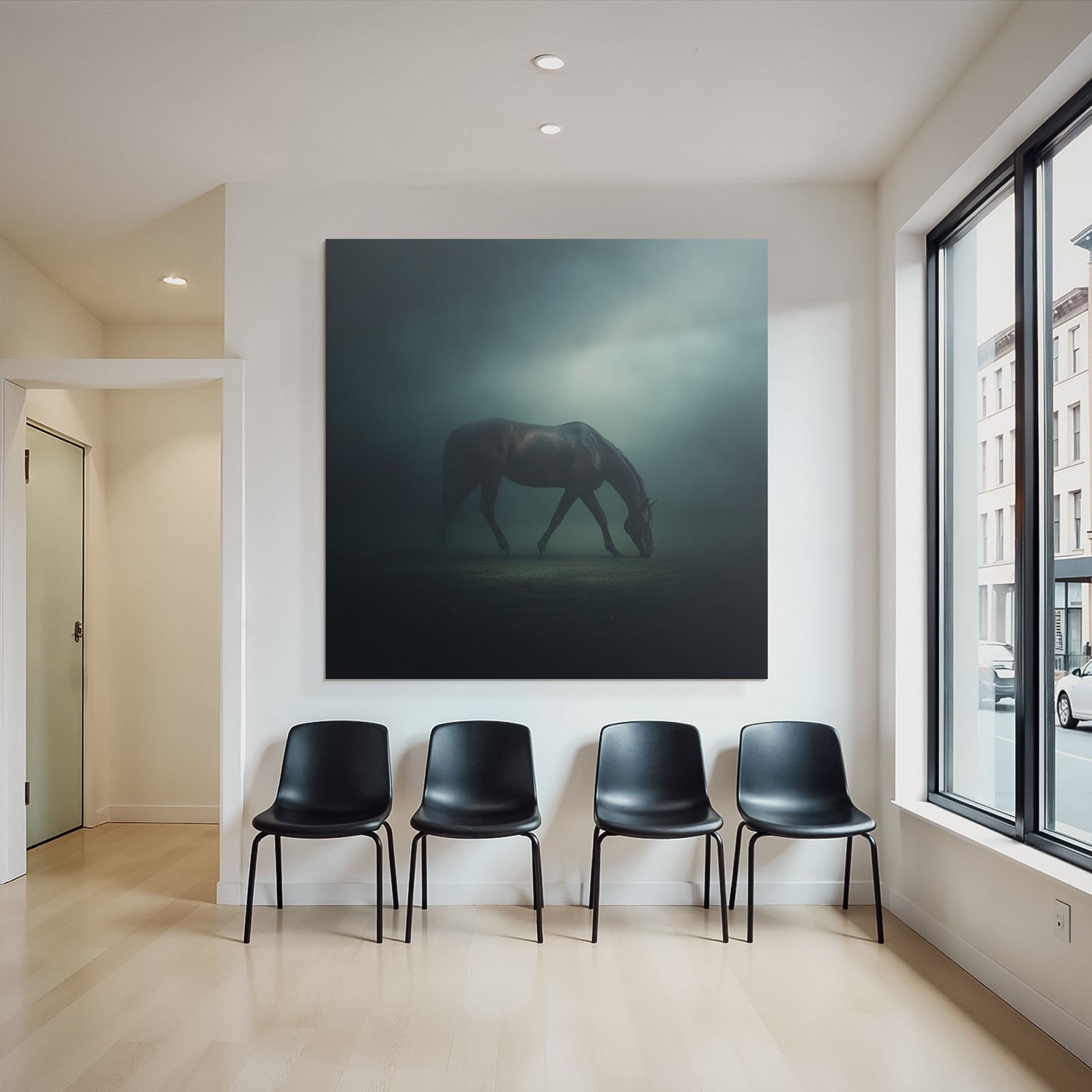 Mach mehr aus Deinem Wohnbereich oder Besprechungszimmer – „Pferd Weide Im Nebel“ im Stil Fotografie überzeugt als eleganter Textildruck im FameFrame.