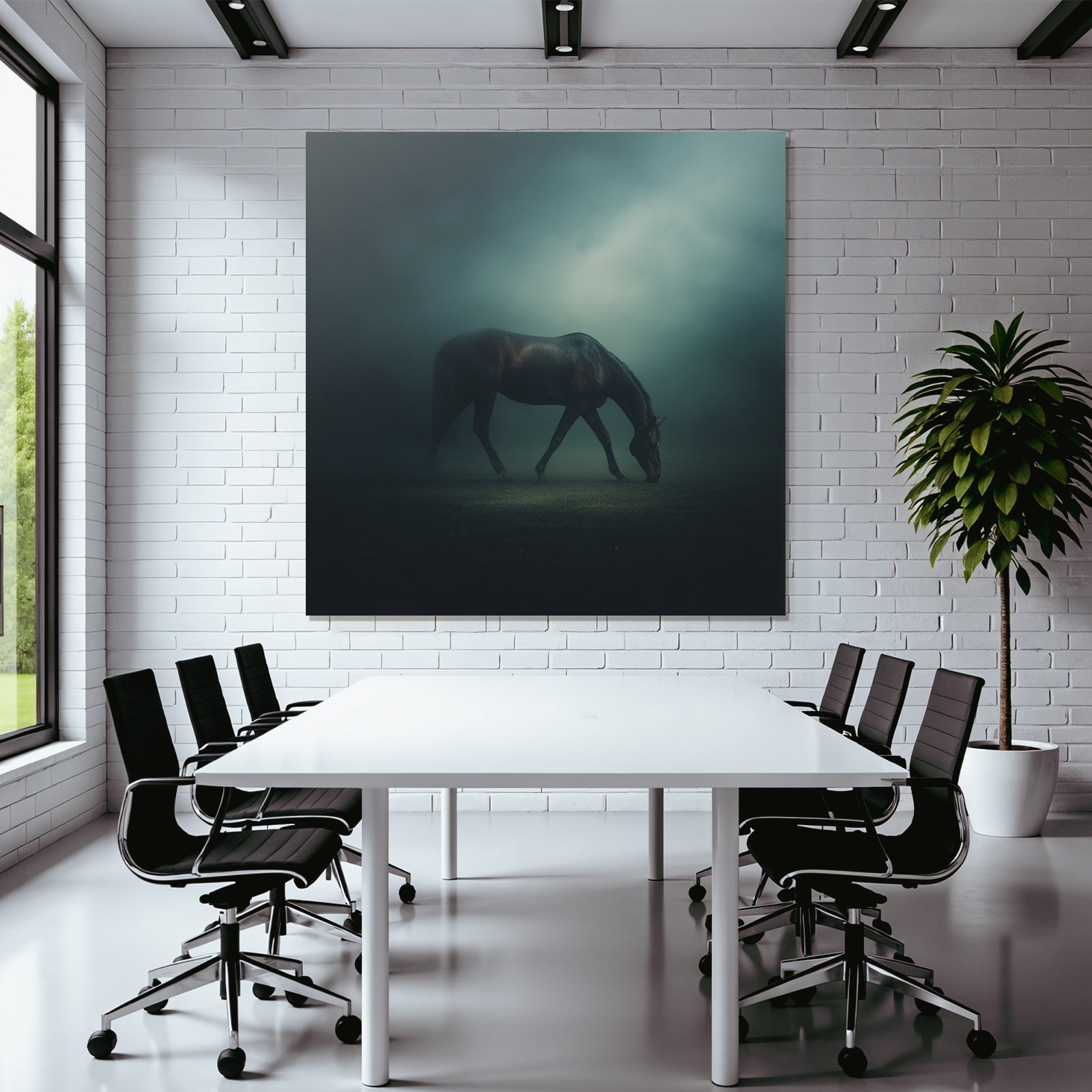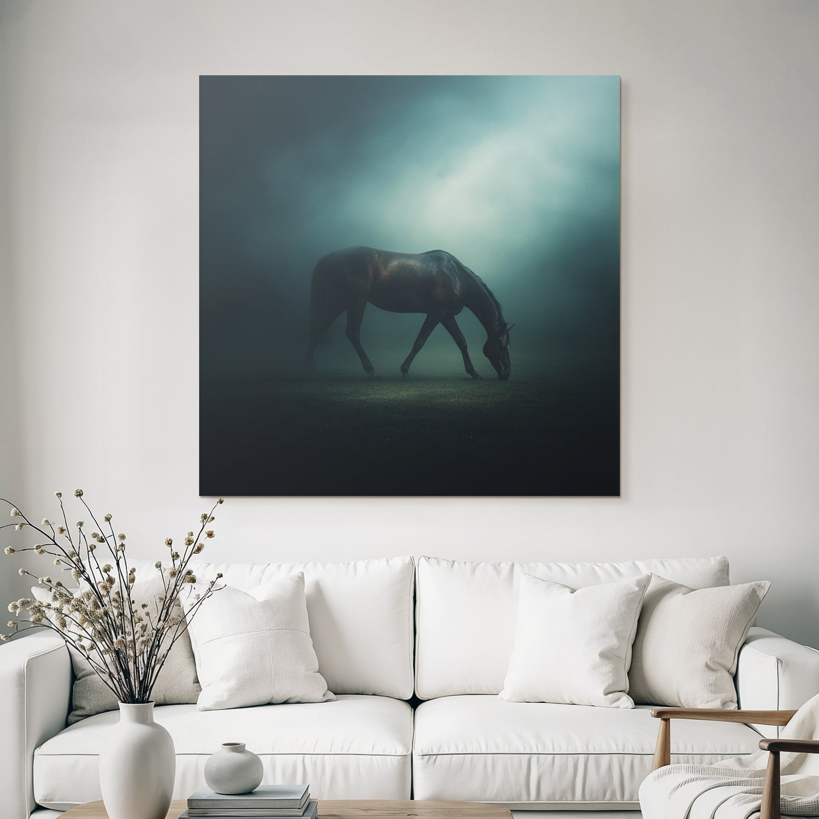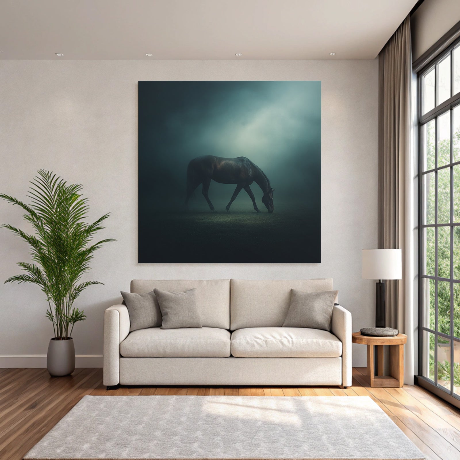 Mach mehr aus Deinem Wohnbereich oder Besprechungszimmer – „Pferd Weide Im Nebel“ im Stil Fotografie überzeugt als eleganter Textildruck im FameFrame.