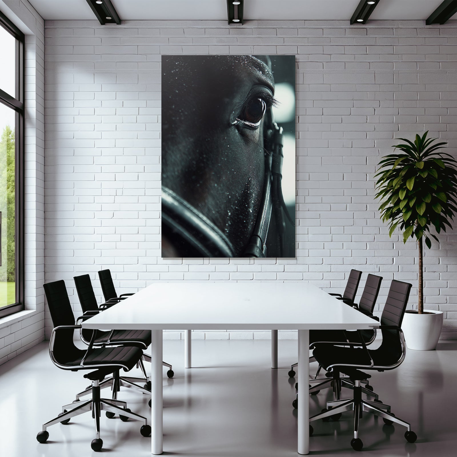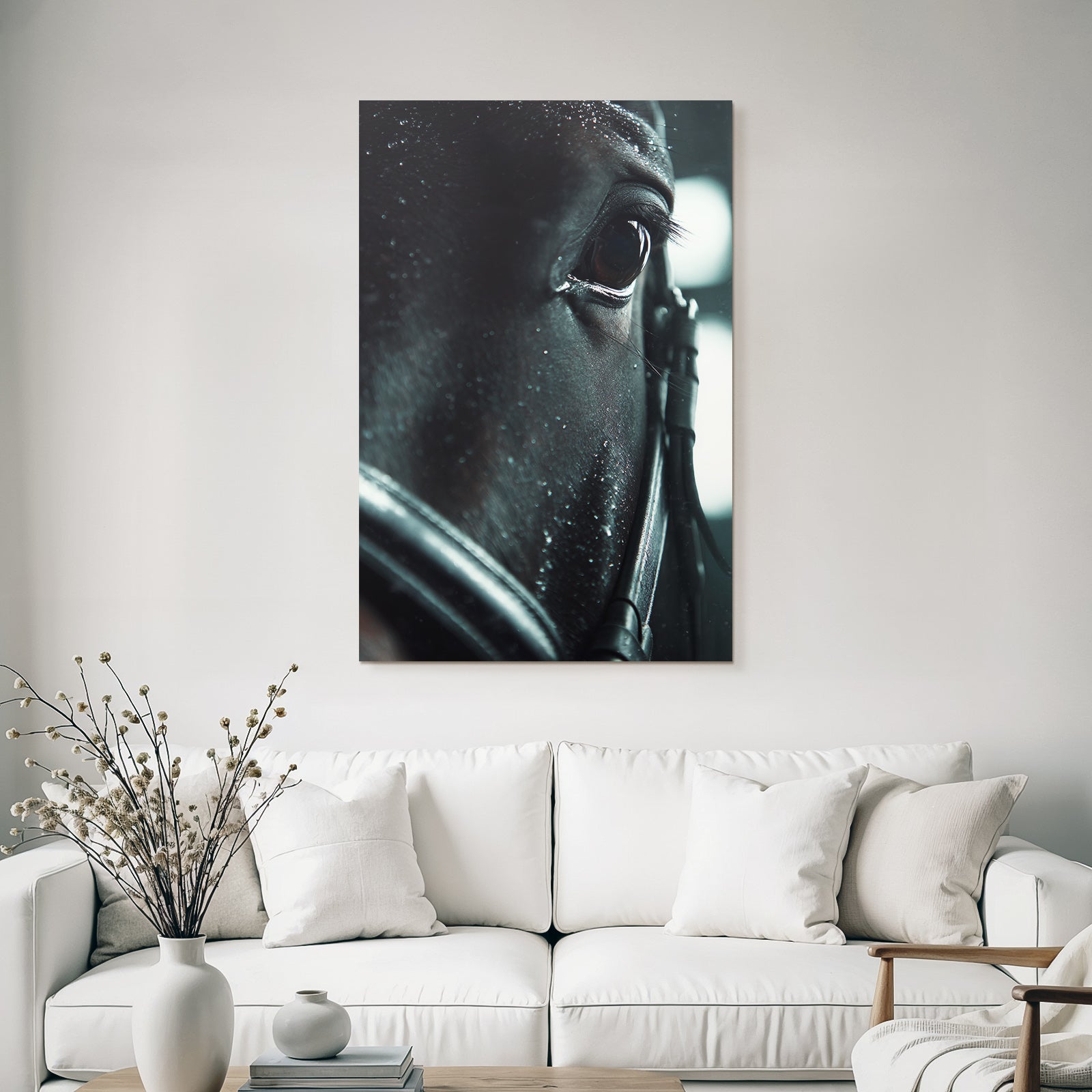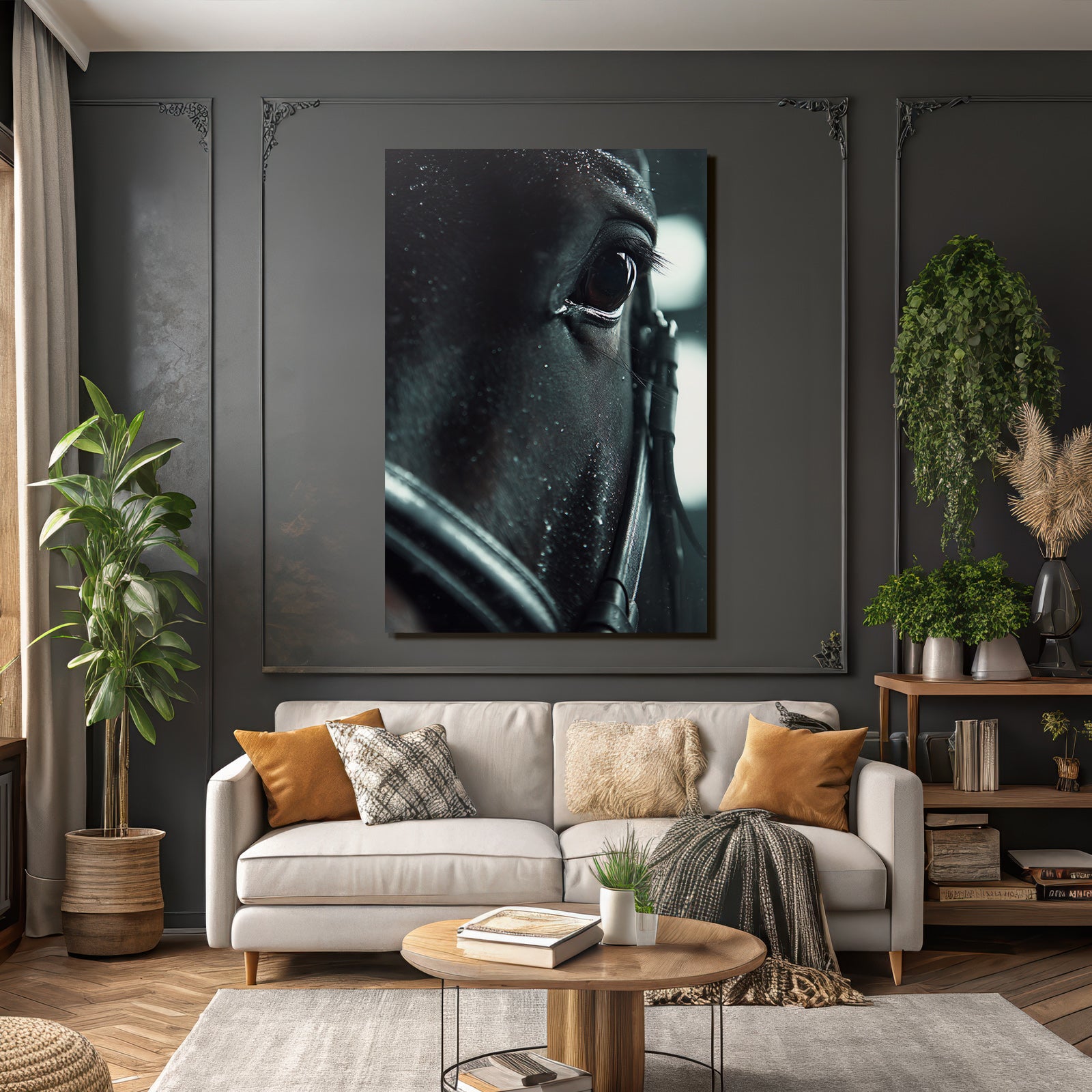 Erlebe Kunst im Stil Fotografie neu: „„Pferdeauge Nahaufnahme Textur Nass““ wird durch den eleganten FameFrame zum Blickfang in jedem Raum.