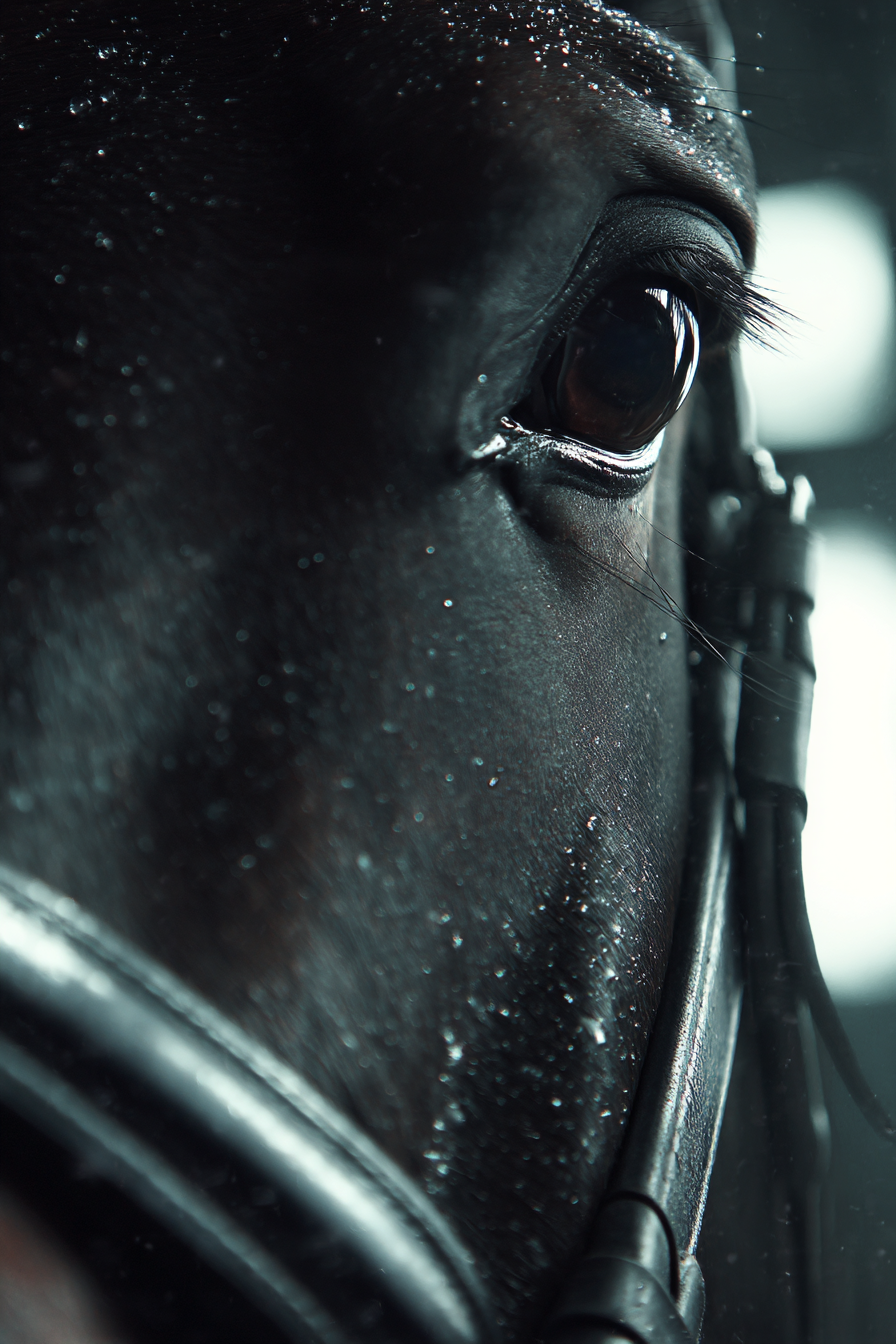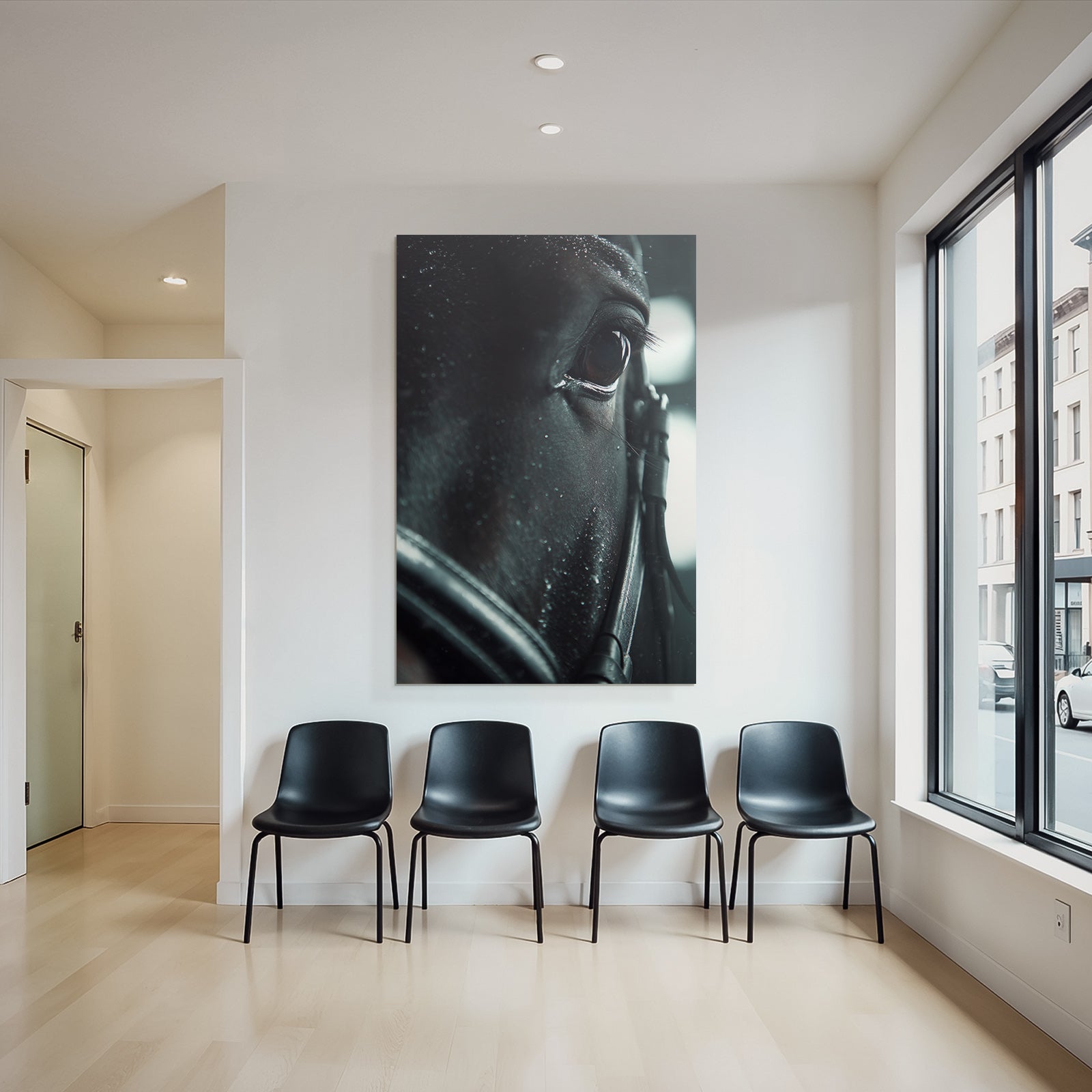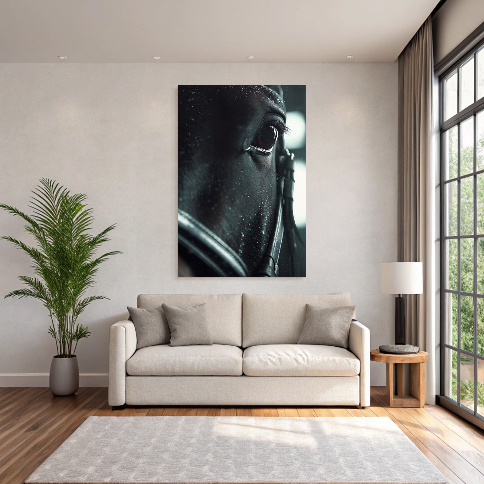 Erlebe Kunst im Stil Fotografie neu: „„Pferdeauge Nahaufnahme Textur Nass““ wird durch den eleganten FameFrame zum Blickfang in jedem Raum.