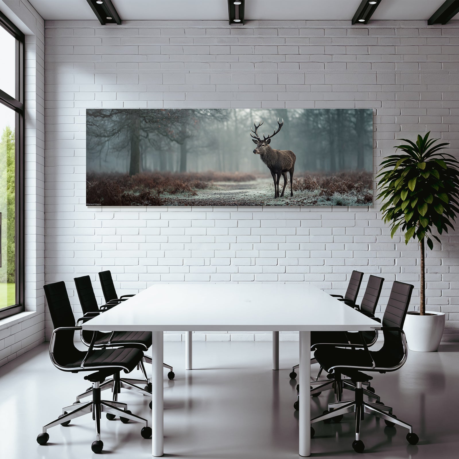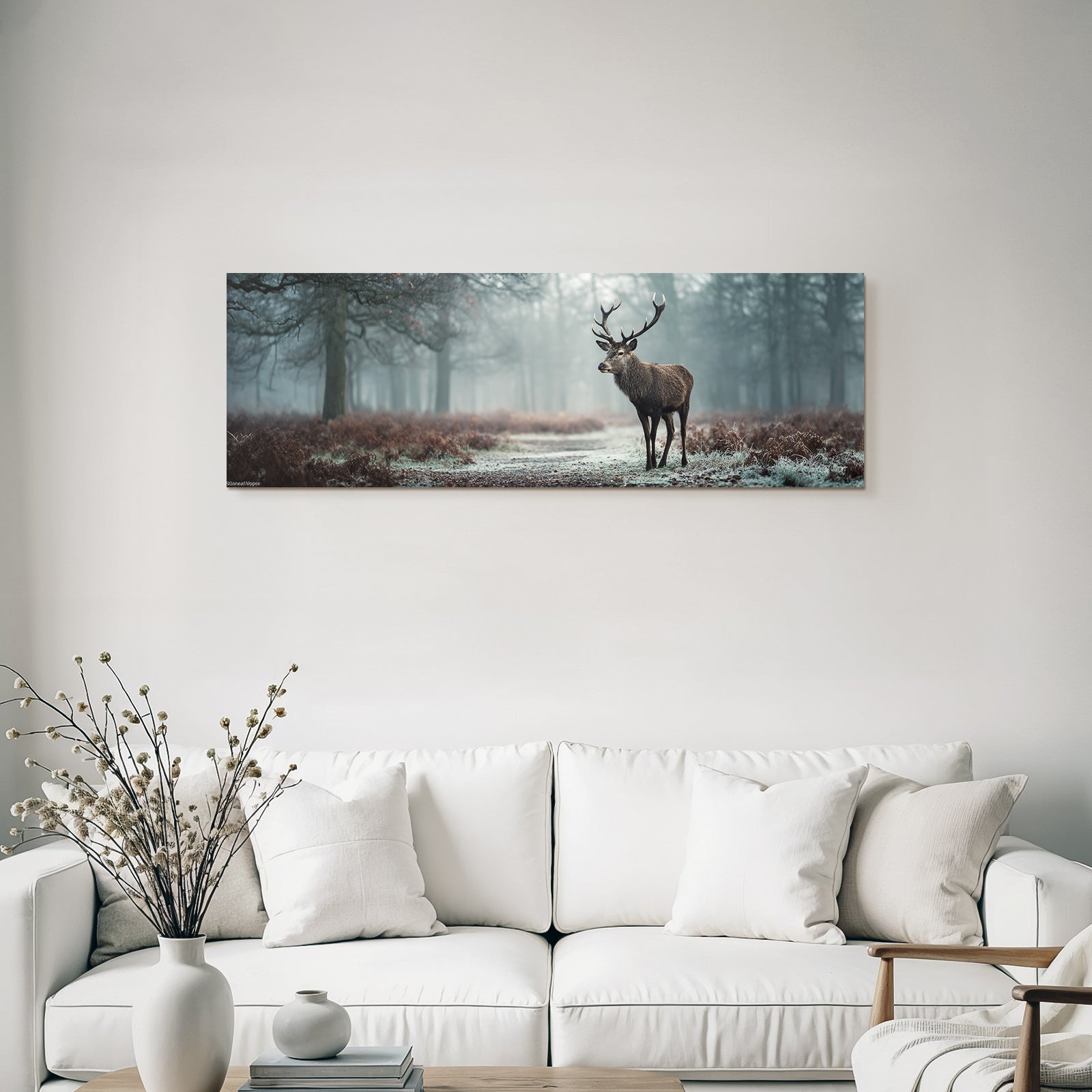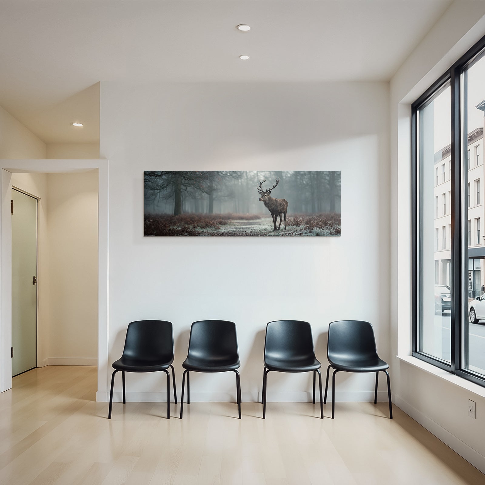 Ein Highlight für Wohnzimmer, Studio oder Empfangsbereich: „Reh Nebel Wald“ bringt den Stil Fotografie auf Stoff – gespannt im edlen FameFrame.