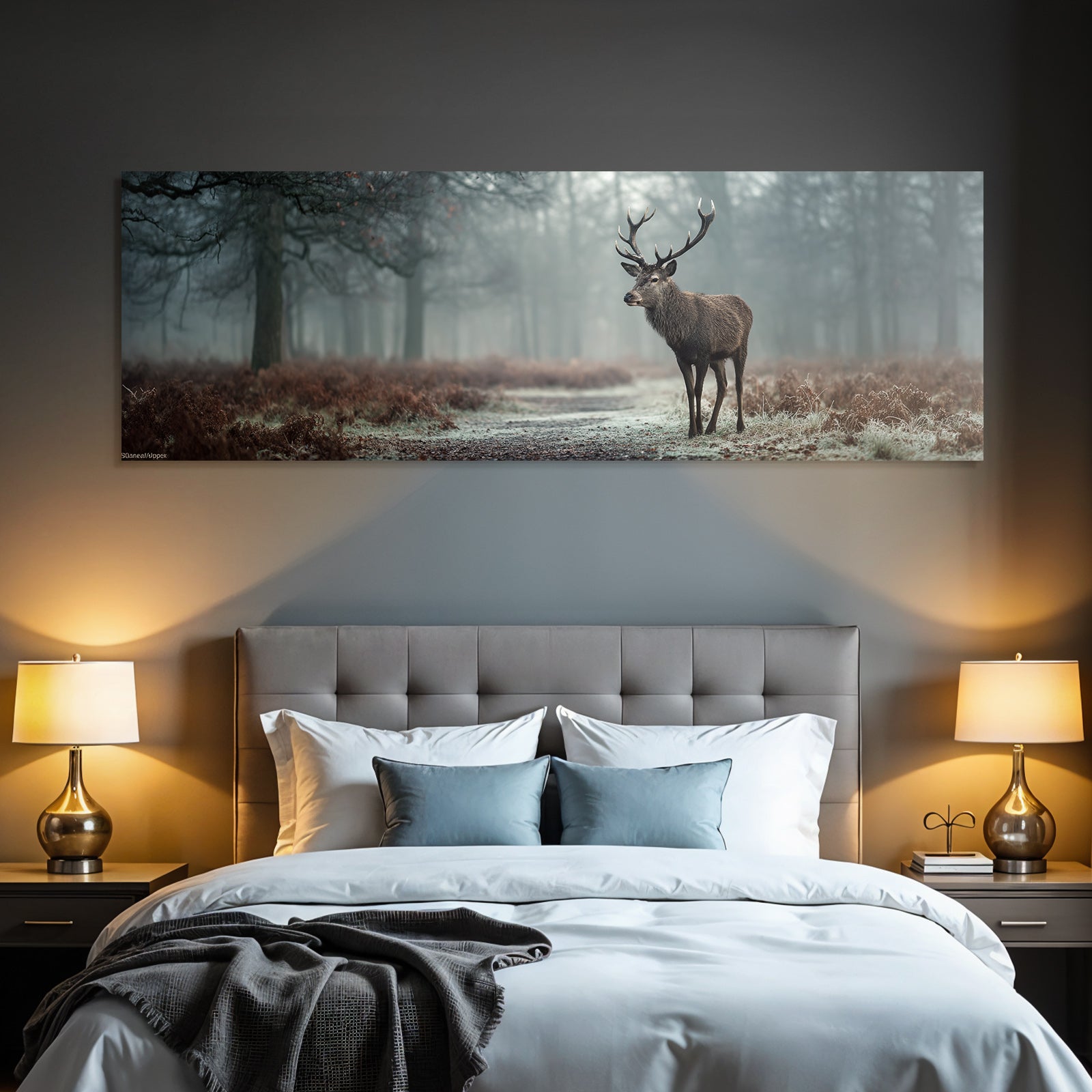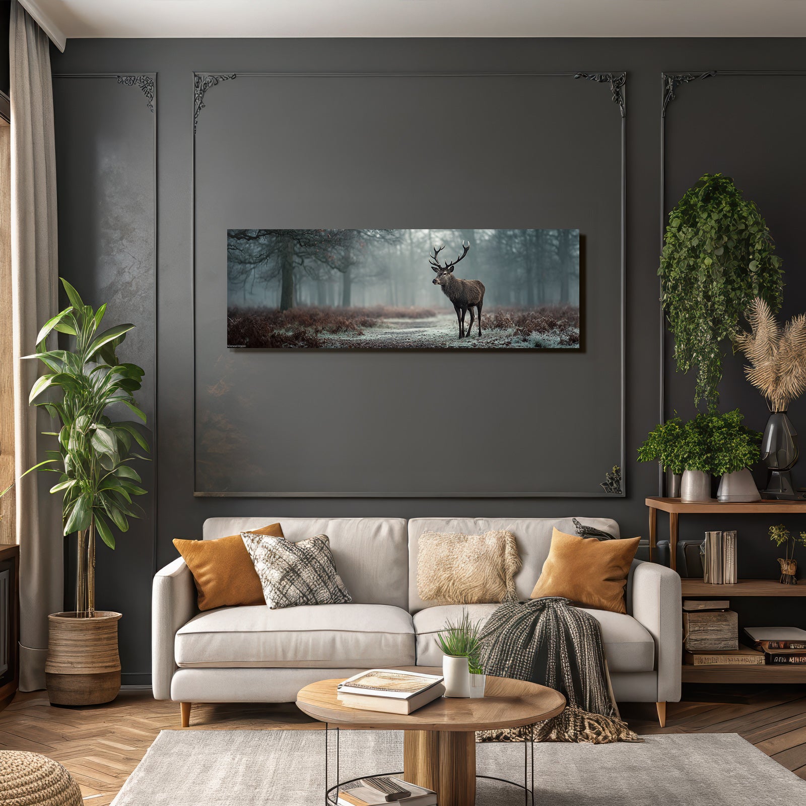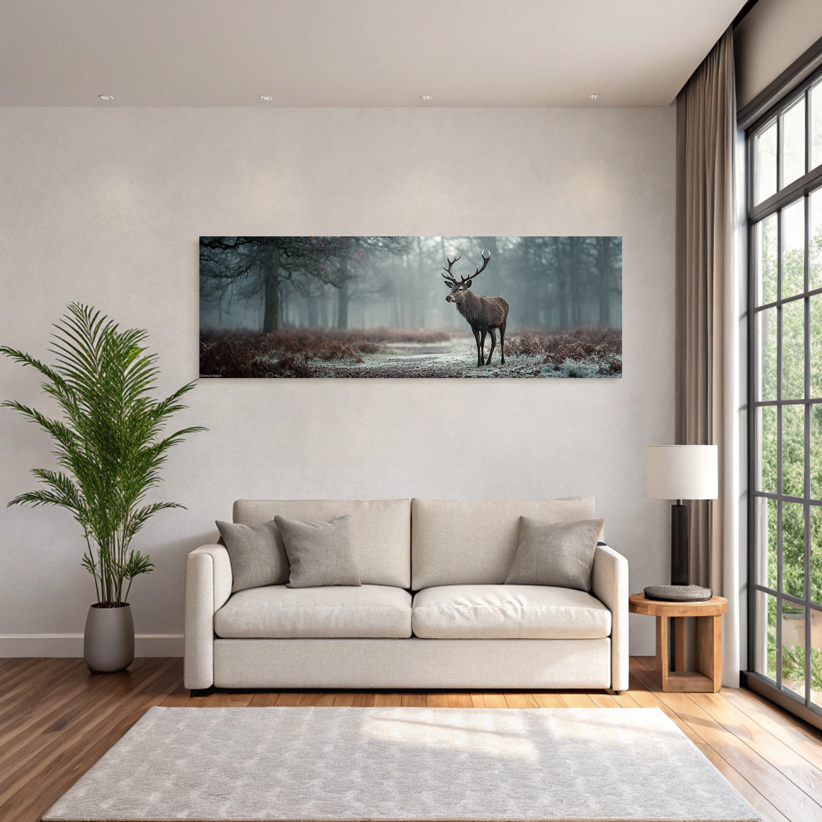 Ein Highlight für Wohnzimmer, Studio oder Empfangsbereich: „Reh Nebel Wald“ bringt den Stil Fotografie auf Stoff – gespannt im edlen FameFrame.