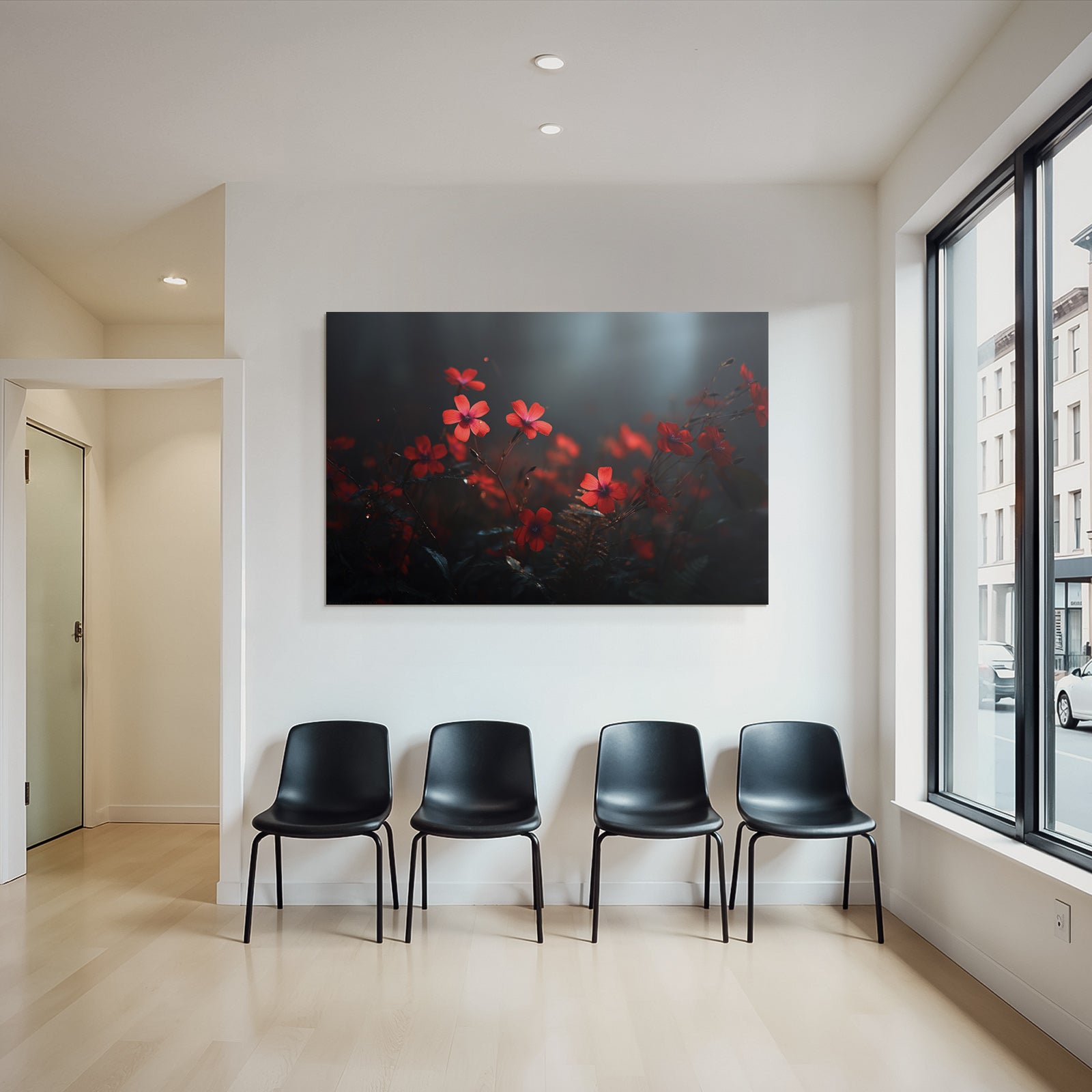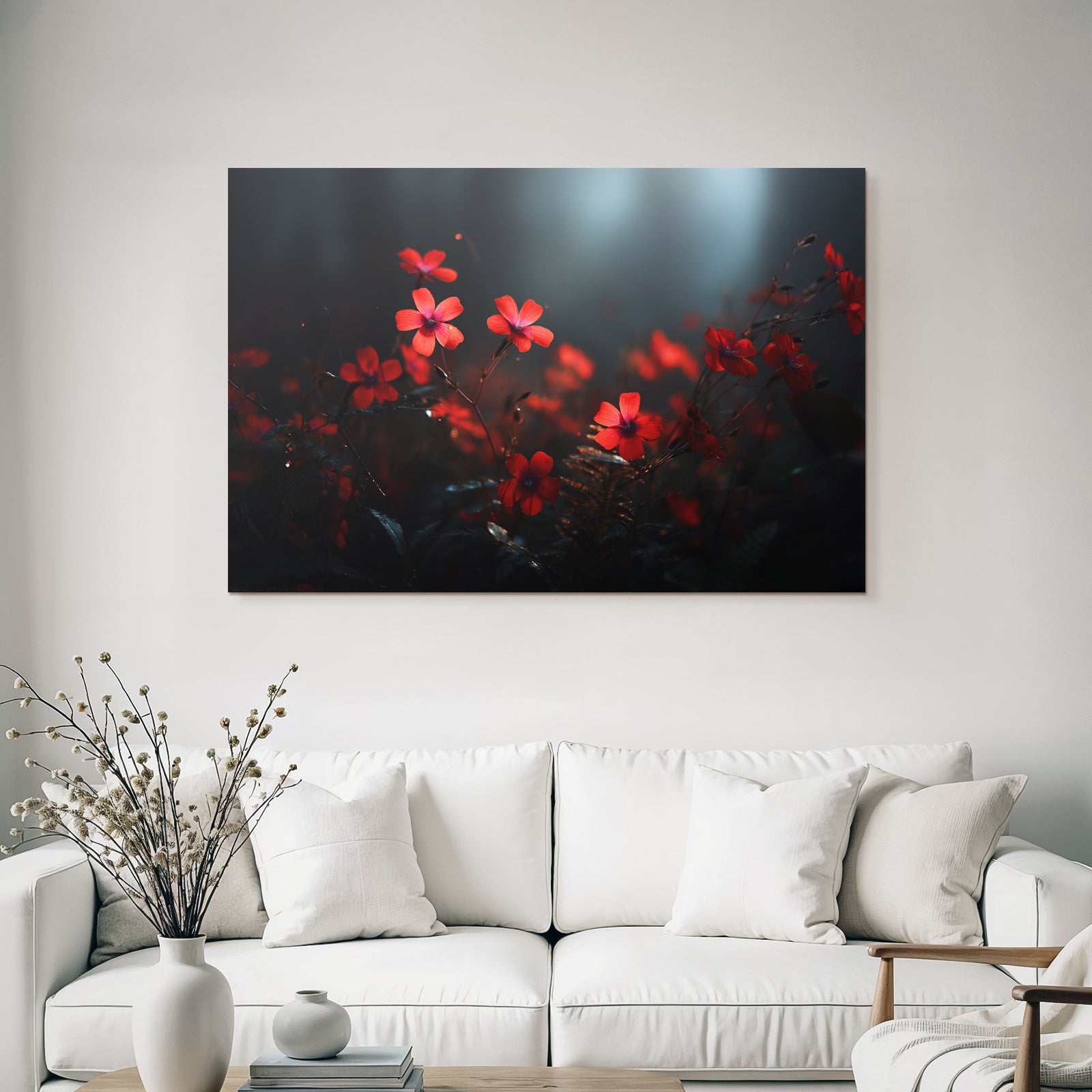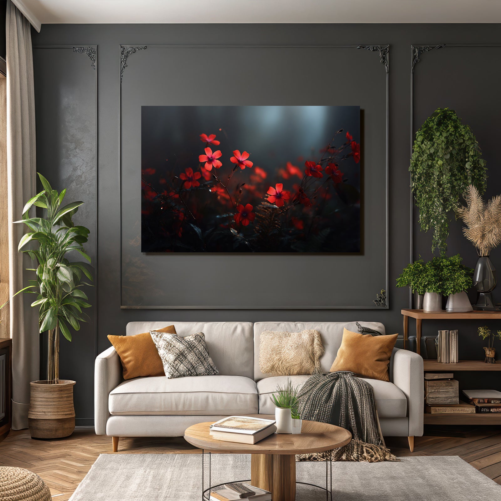 Modern, stilvoll, individuell: „Rote Blumen Nahaufnahme Dunkel Umgebung“ im Stil Fotografie überzeugt im hochwertigen FameFrame durch klare Formen und starke Farben.