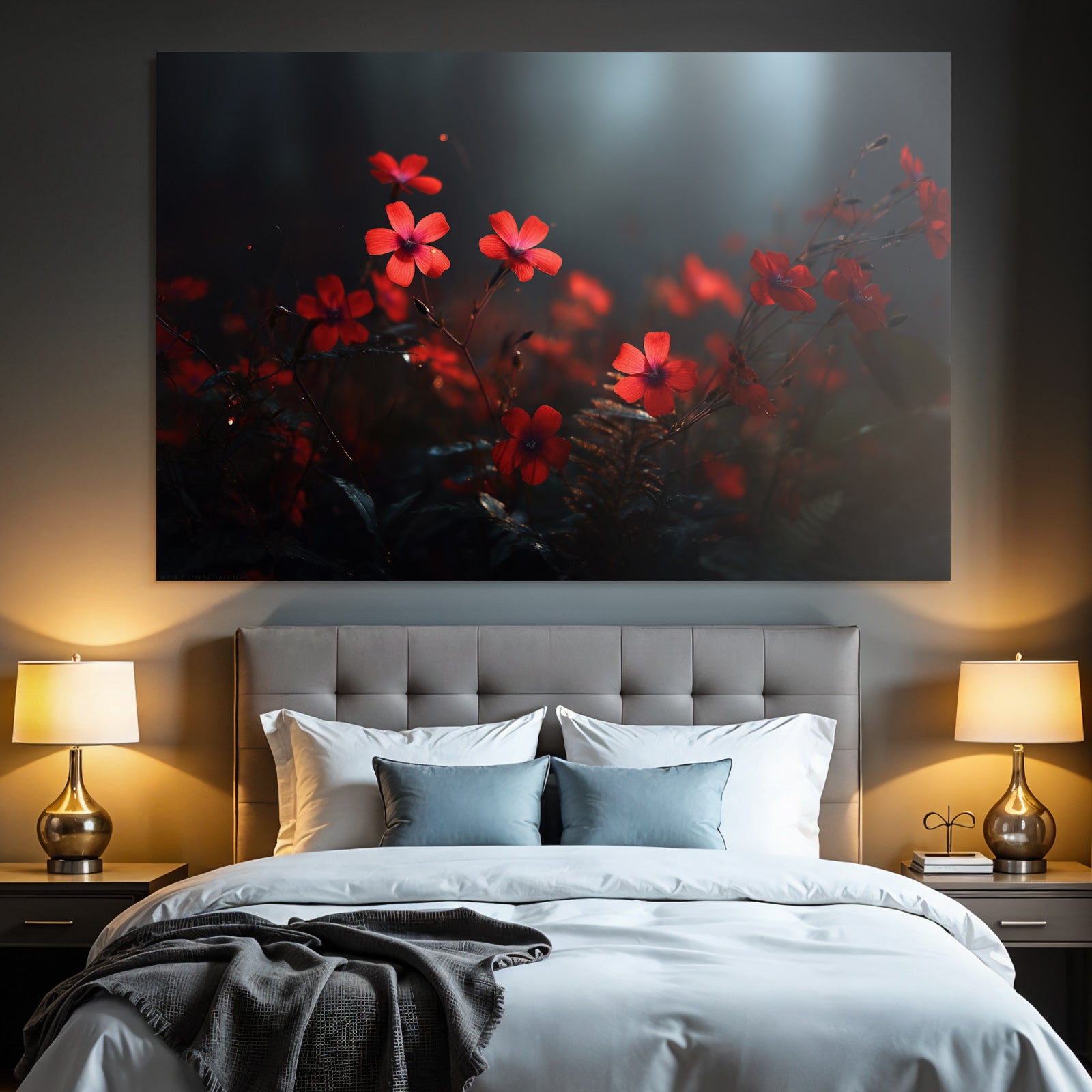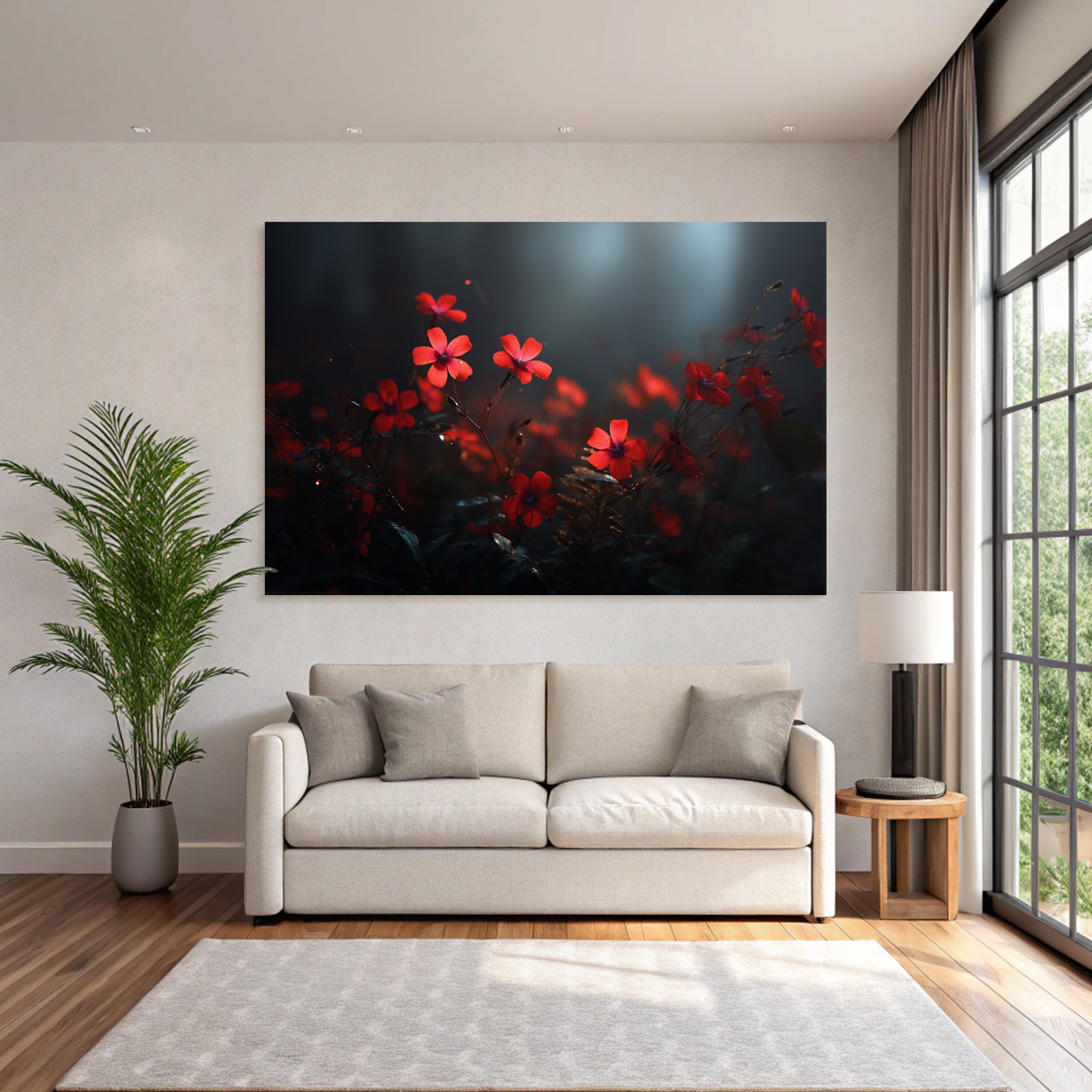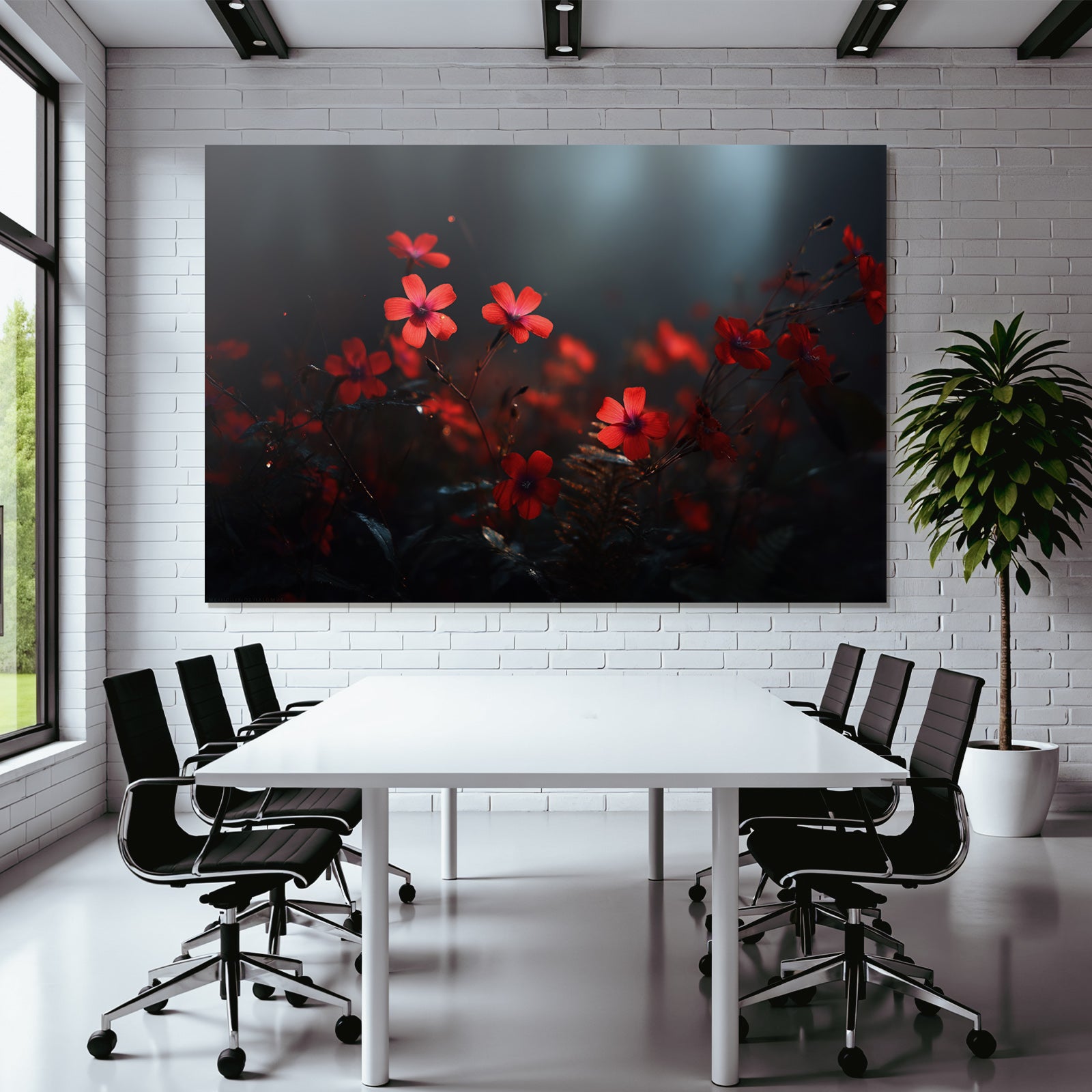 Modern, stilvoll, individuell: „Rote Blumen Nahaufnahme Dunkel Umgebung“ im Stil Fotografie überzeugt im hochwertigen FameFrame durch klare Formen und starke Farben.