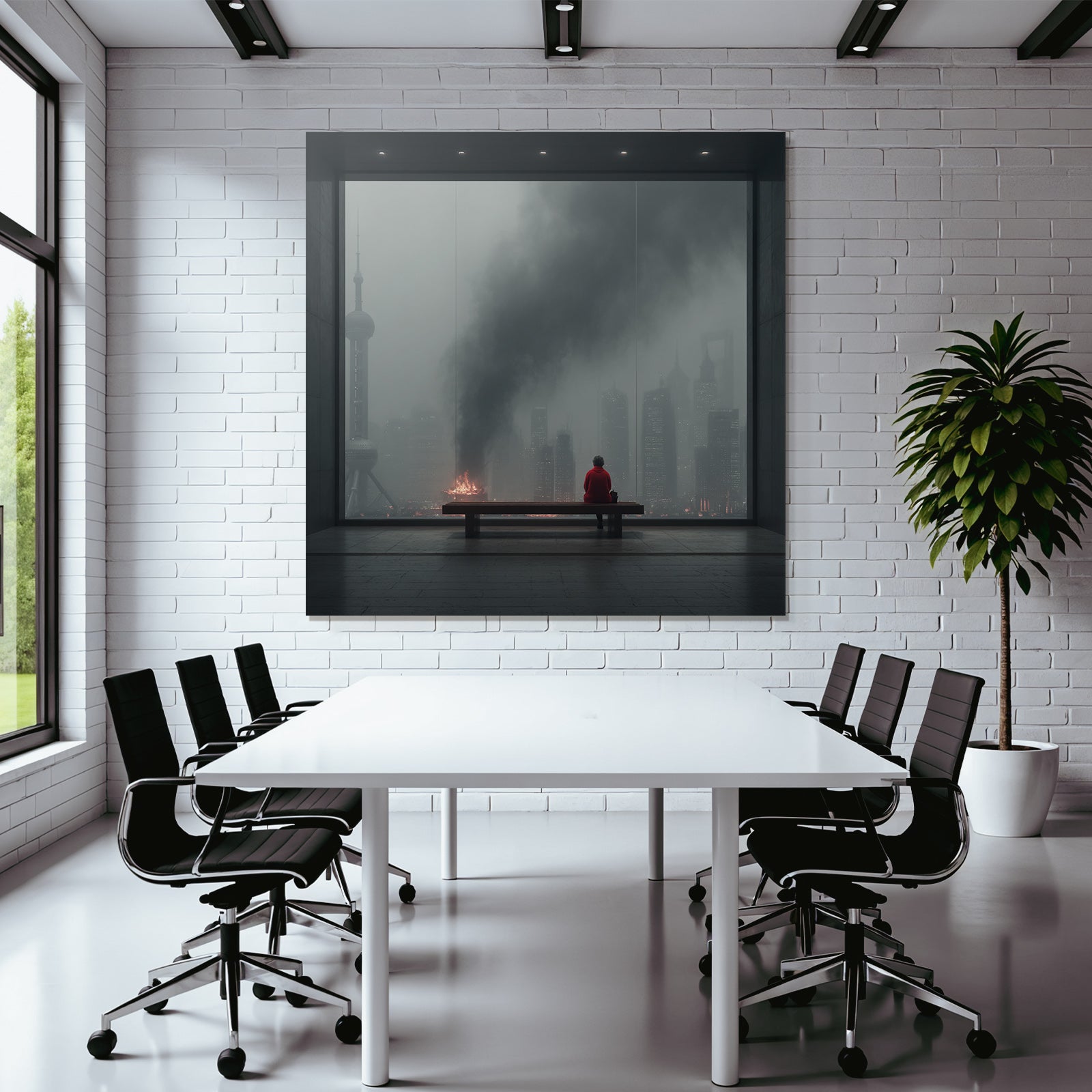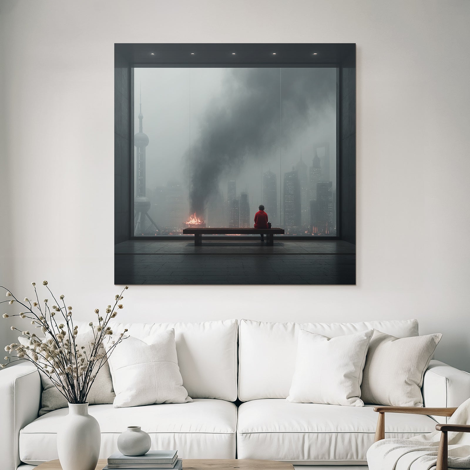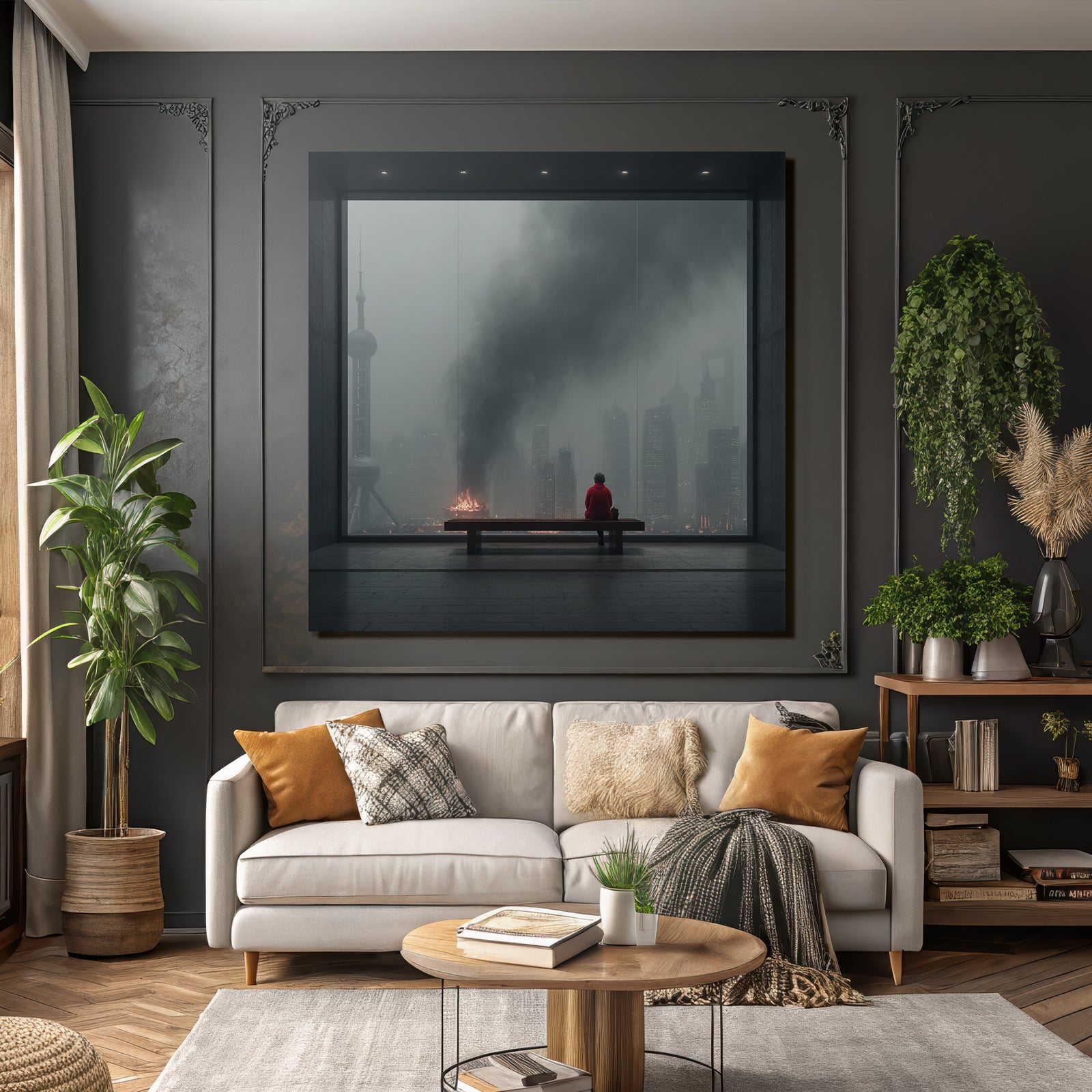 Mit Fotografie-Elementen und klarer Wirkung verleiht „Rotoutfit Stadtblick Rauch Feür Nachdenken Dramatisch“ Deinem Raum Persönlichkeit – eingerahmt im exklusiven FameFrame.
