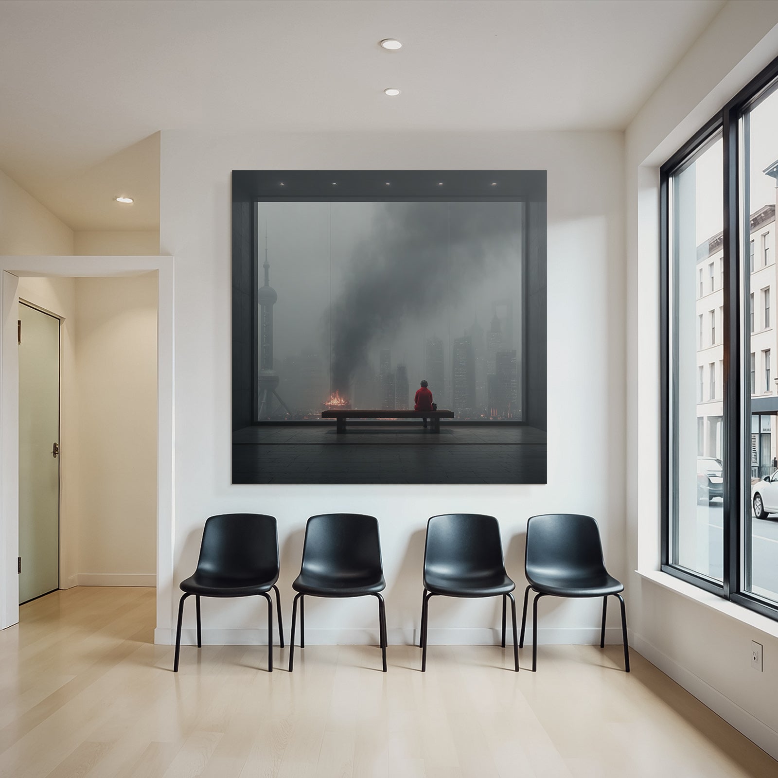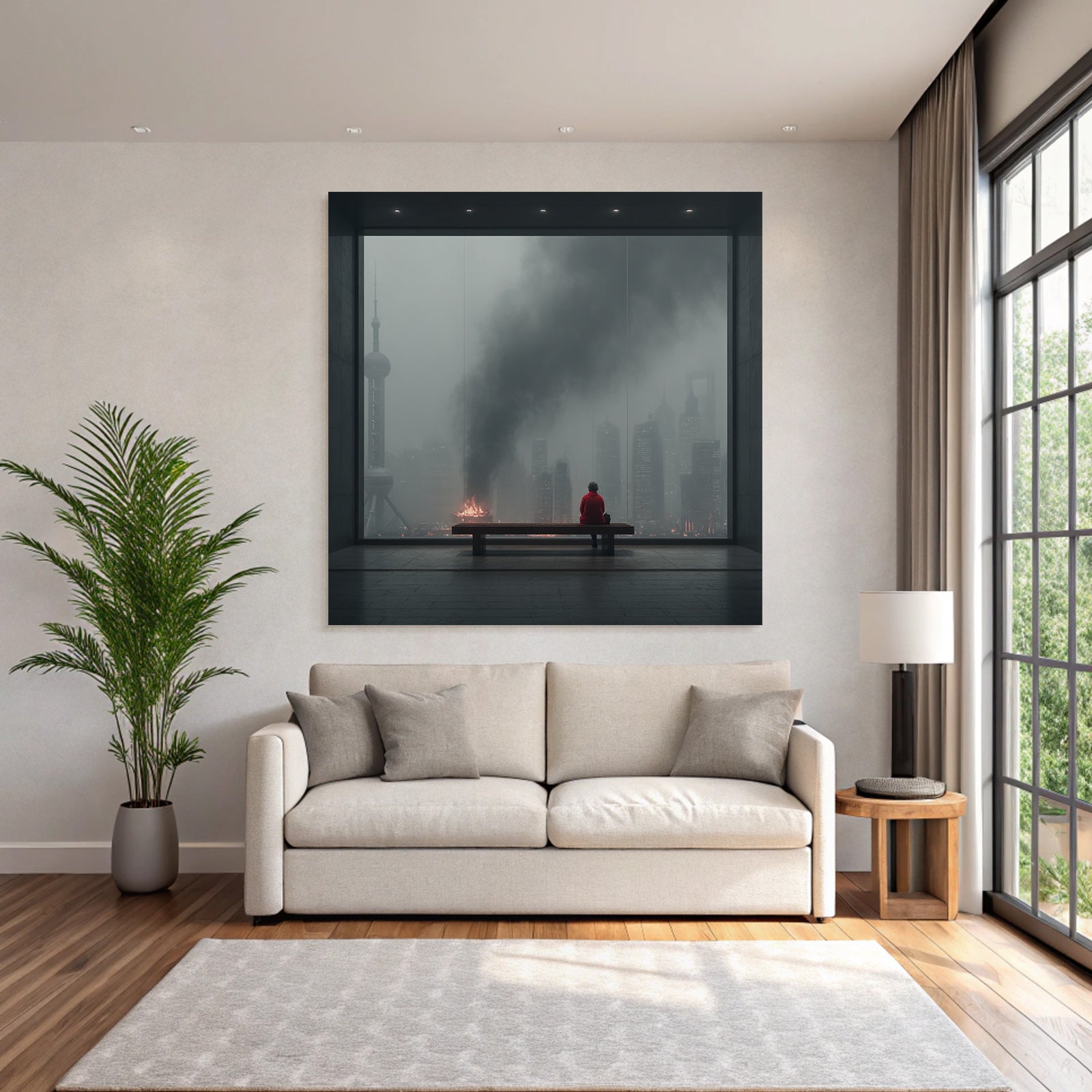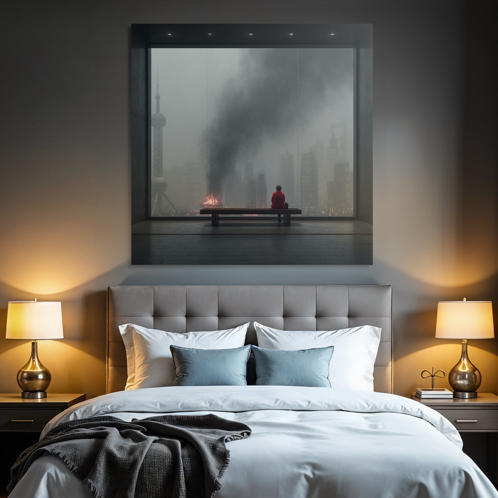 Mit Fotografie-Elementen und klarer Wirkung verleiht „Rotoutfit Stadtblick Rauch Feür Nachdenken Dramatisch“ Deinem Raum Persönlichkeit – eingerahmt im exklusiven FameFrame.