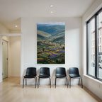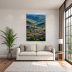 Modern, stilvoll, individuell: „Malerische Landschaft Florale Felder Hügel Und Häuser“ im Stil Fruehling überzeugt im hochwertigen FameFrame durch klare Formen und starke Farben.