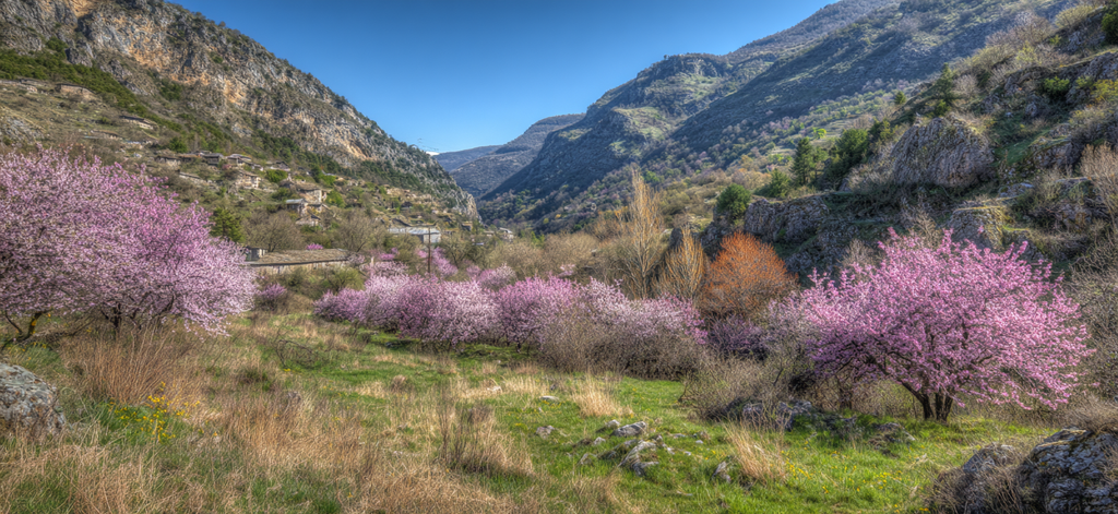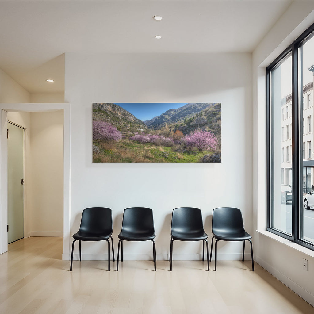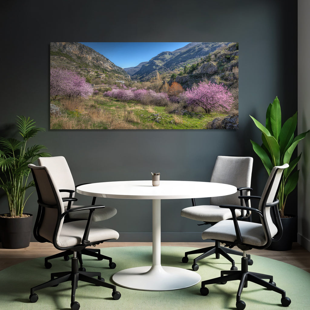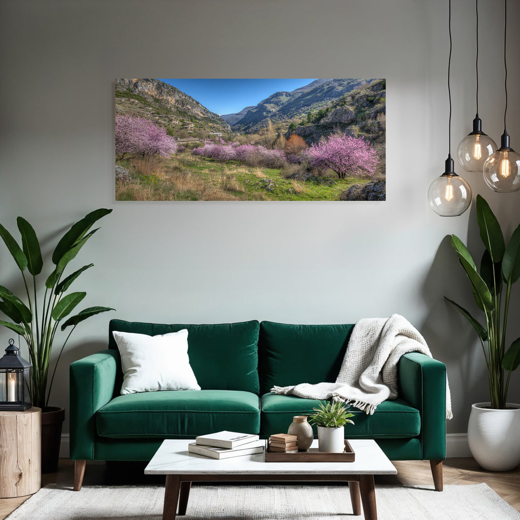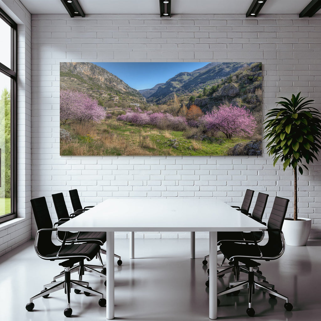 Erleben Sie die pure Essenz von Fruehling. Das Werk „Malerische Landschaft Mit Kirschblüten Im Frühling“ wird durch den hochwertigen Textildruck im FameFrame zu einem Statement-Piece.