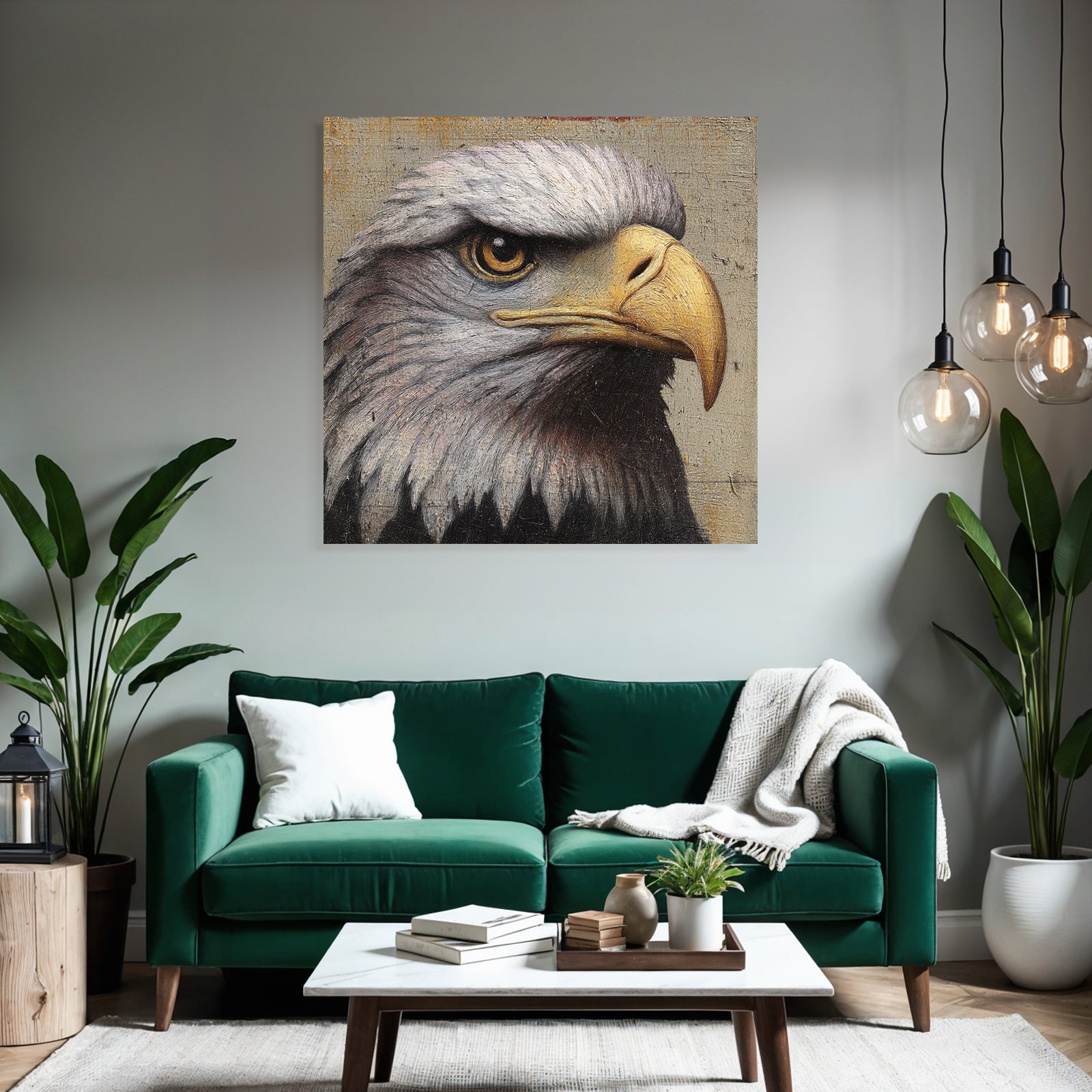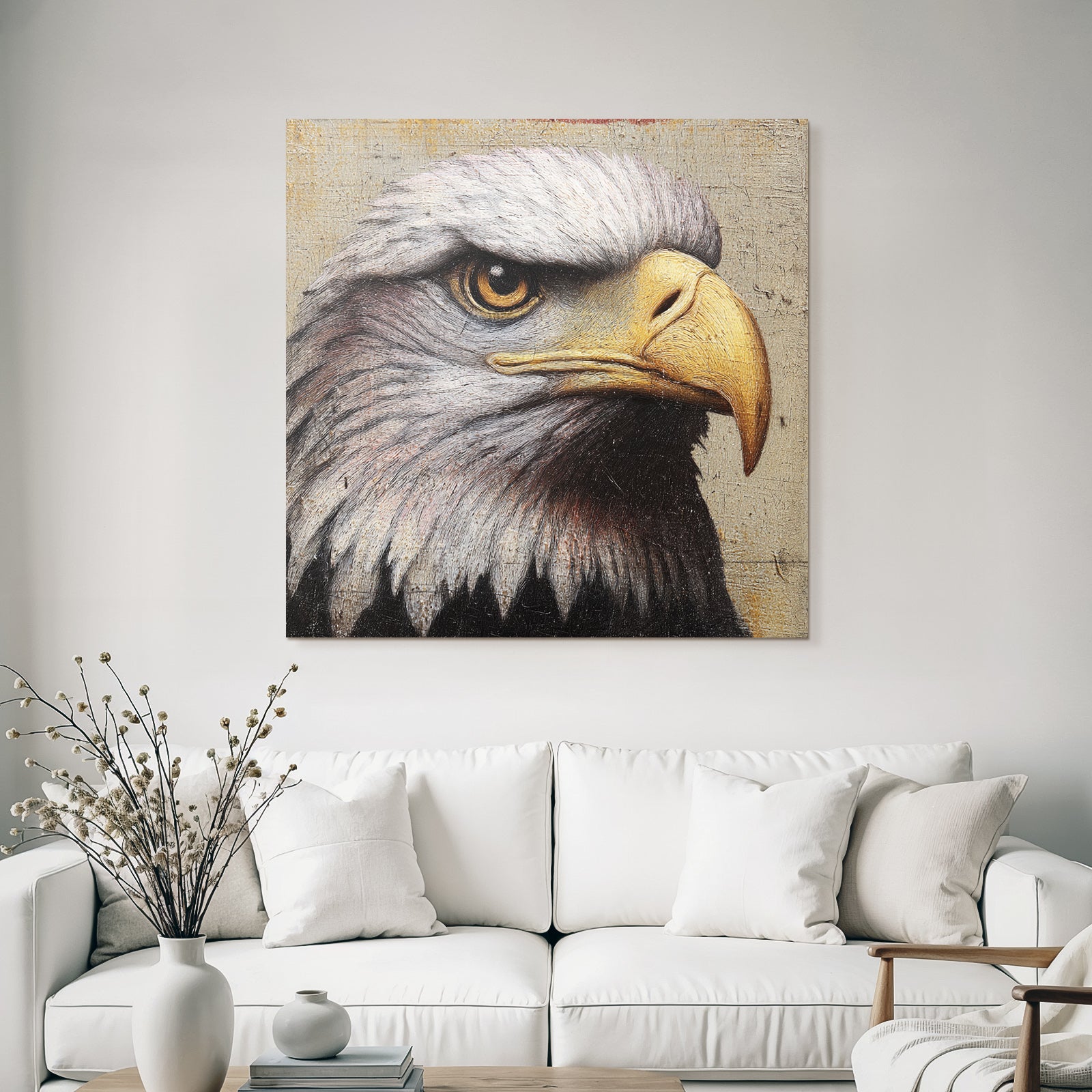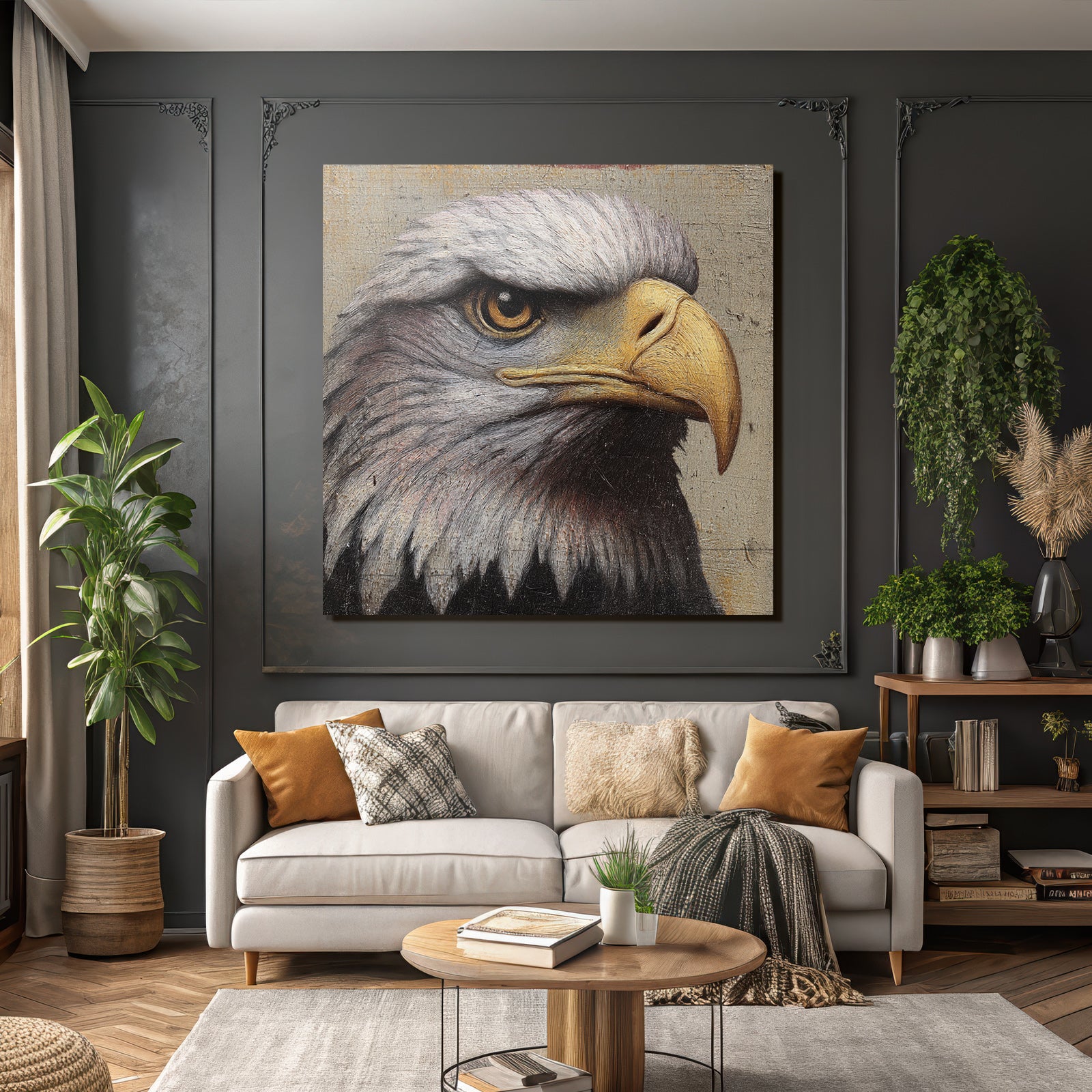 Setze stilvolle Akzente mit Kunst im Look von Grandeur Chic. Das Werk „„Adlerkopf Detail Malerei““ entfaltet im edlen FameFrame seine volle Wirkung.
