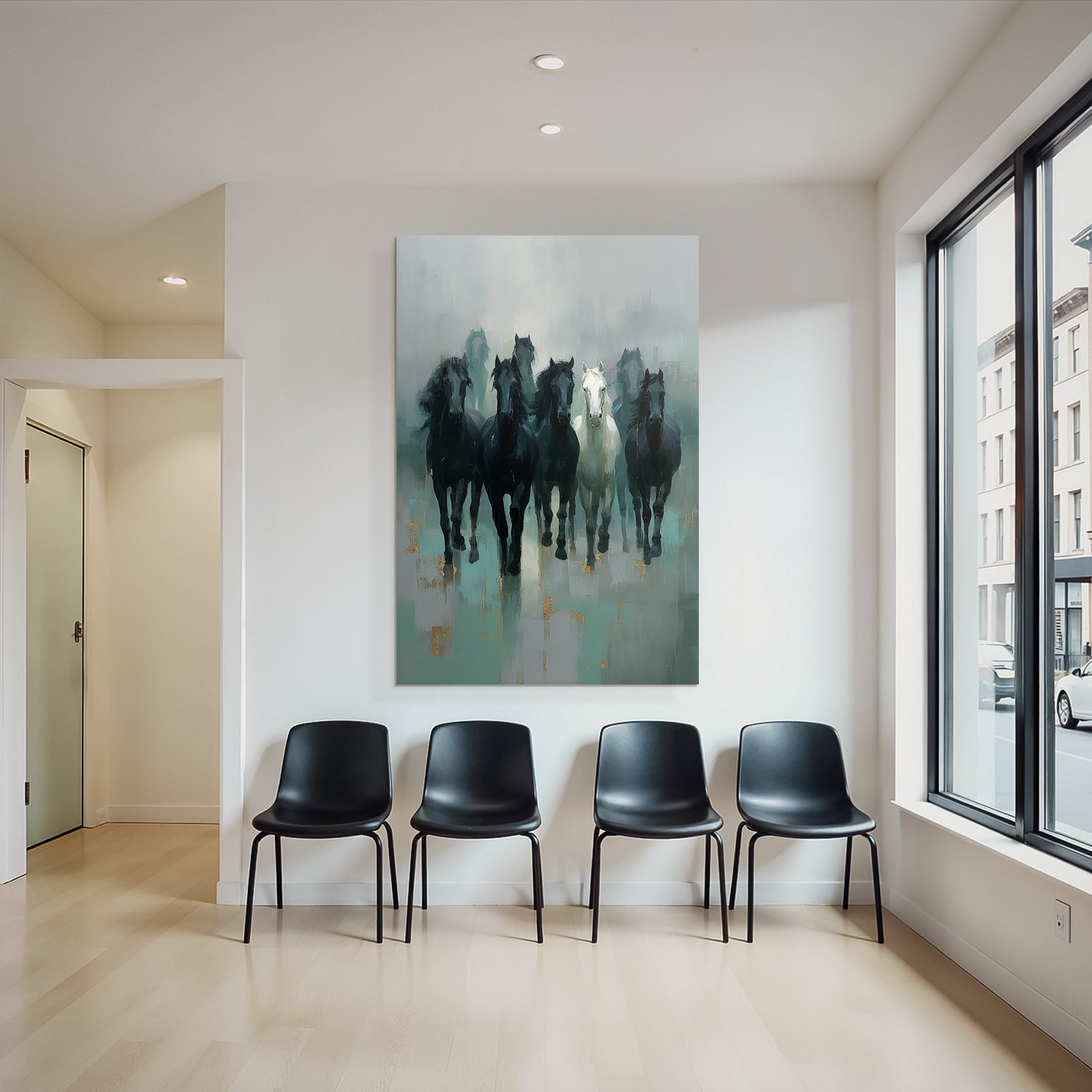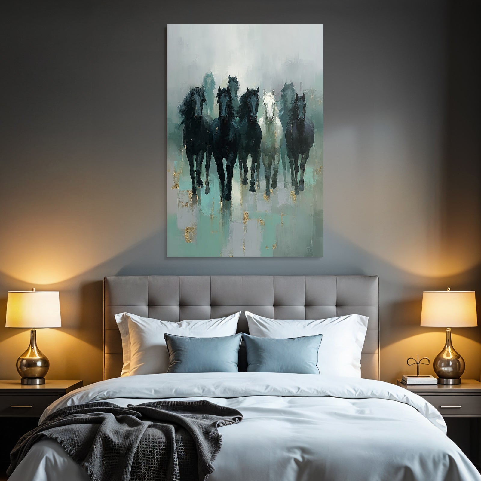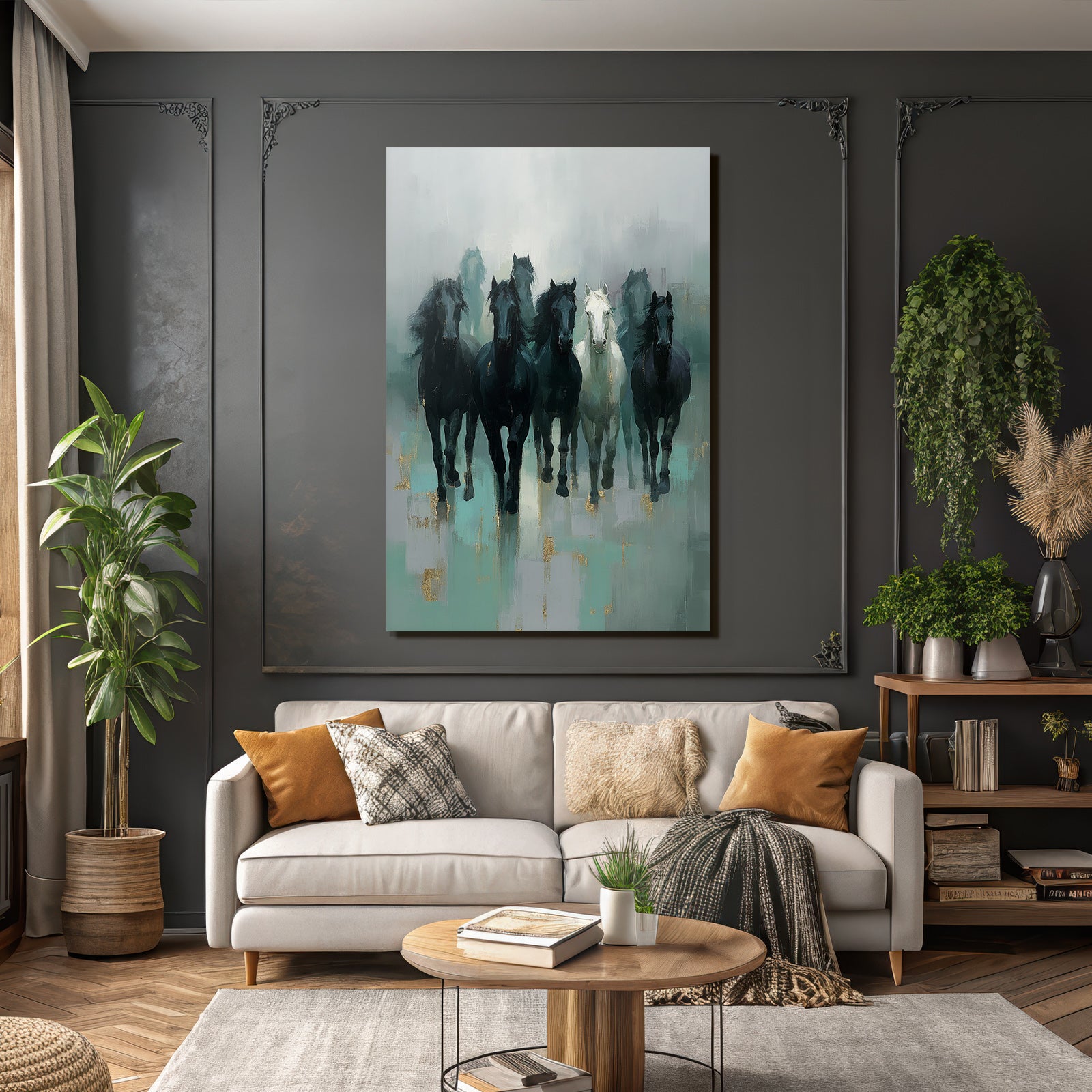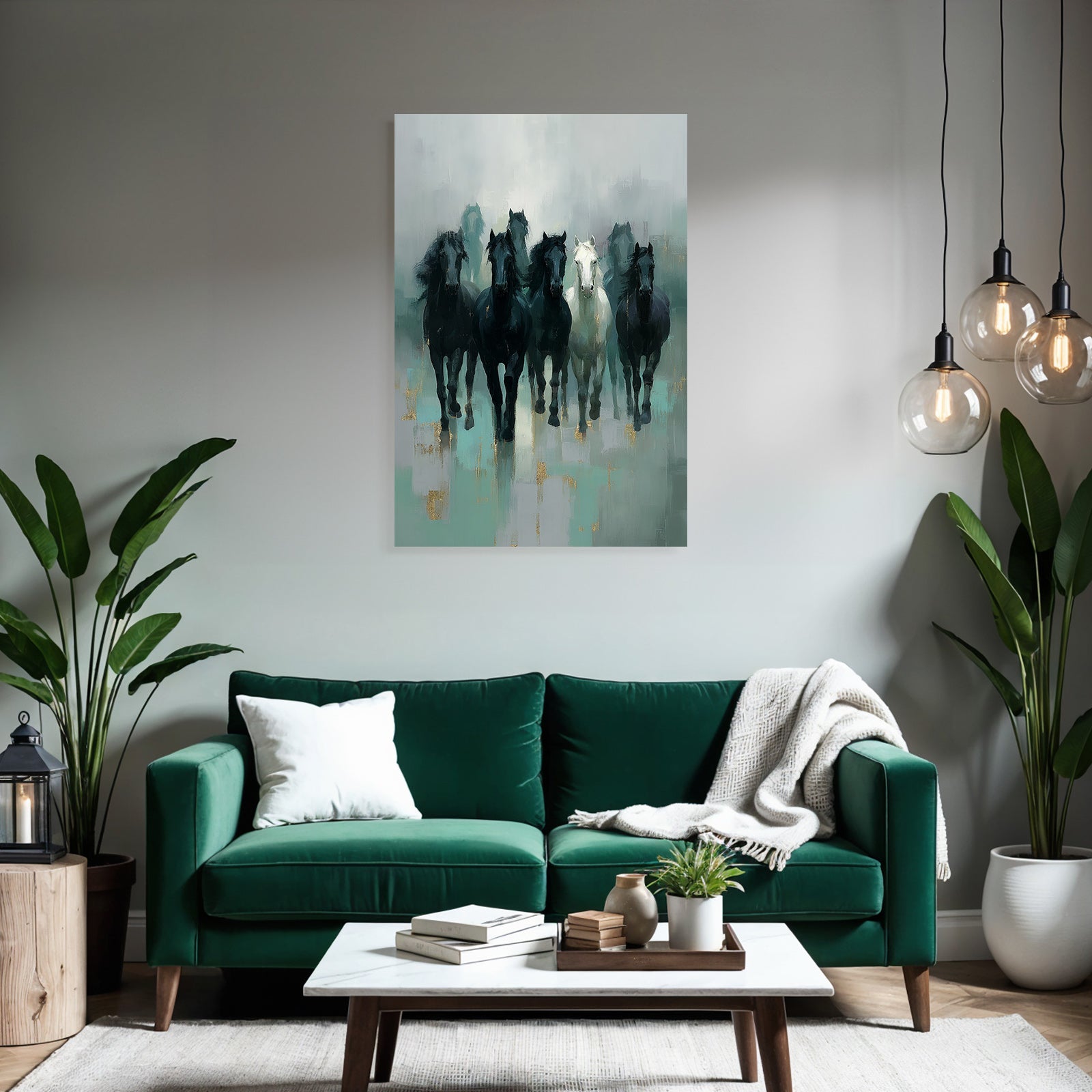 Ob im Wohnzimmer oder Essbereich – das Werk „„Pferdegruppe In Nebel““ im Stil Grandeur Chic wird im FameFrame zum stilvollen Blickfang.