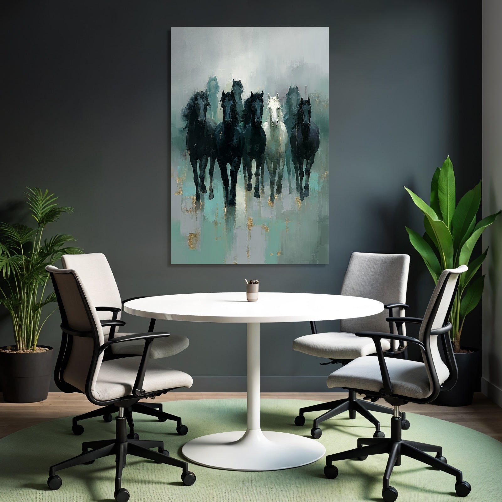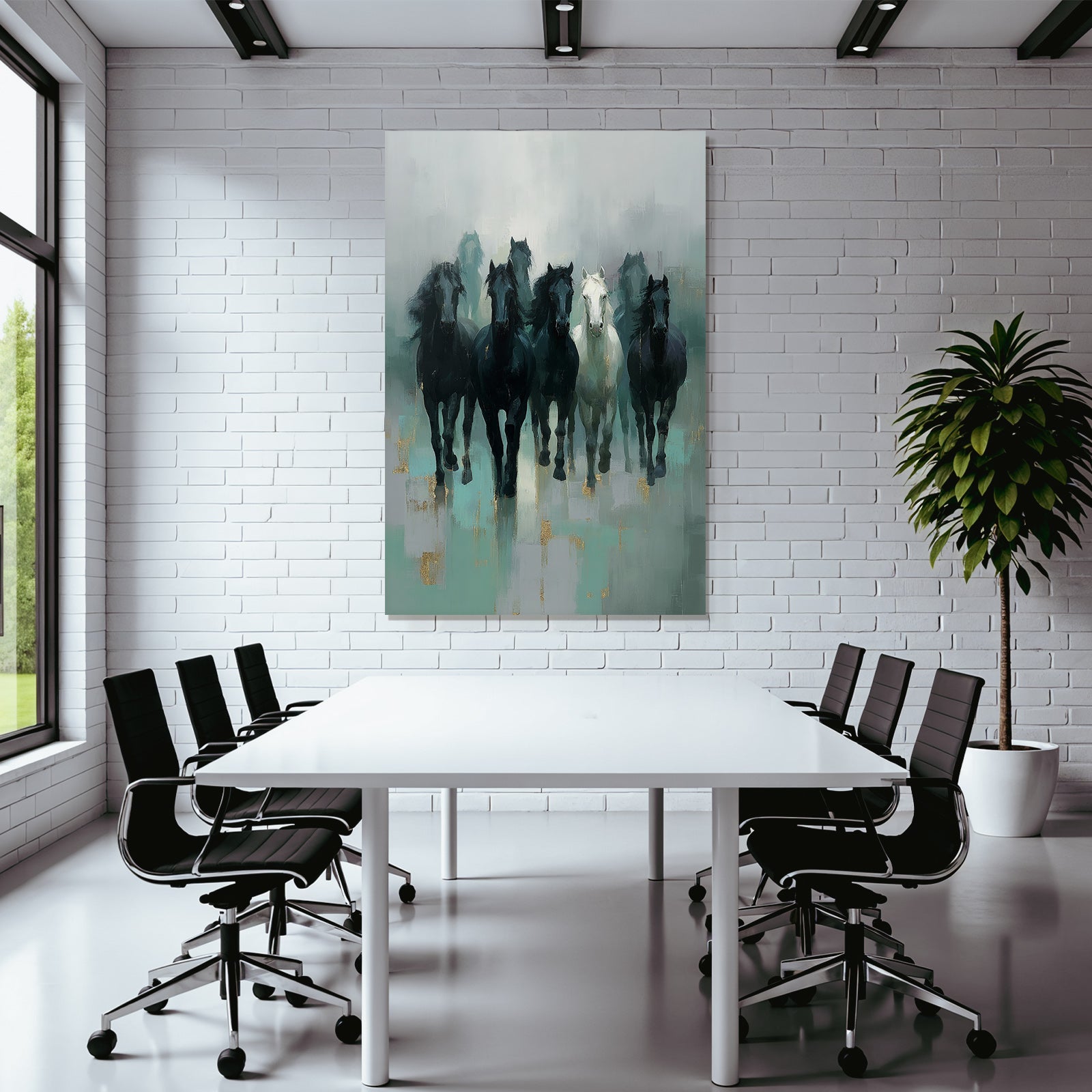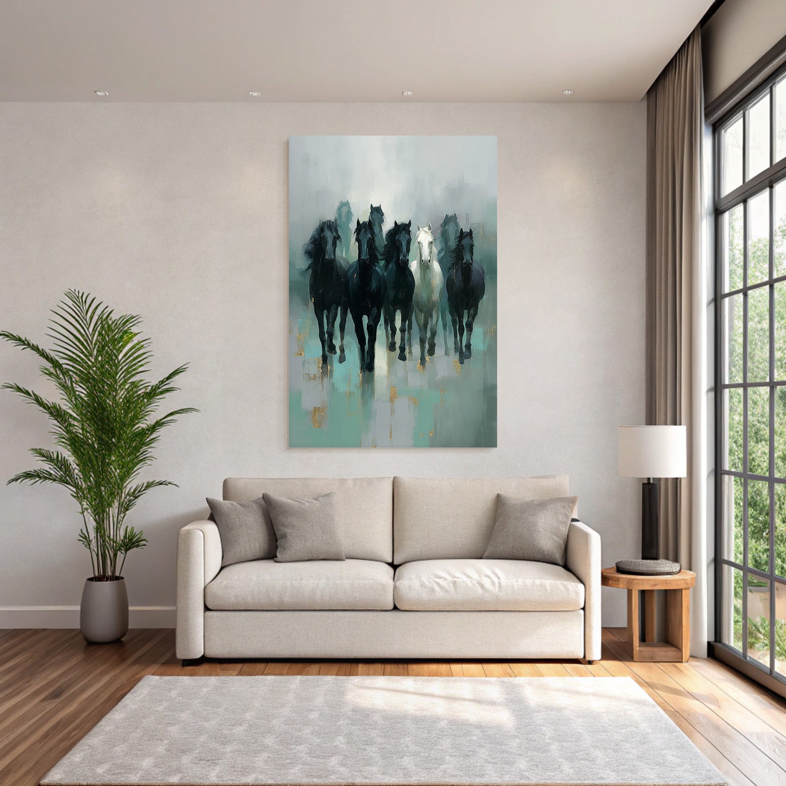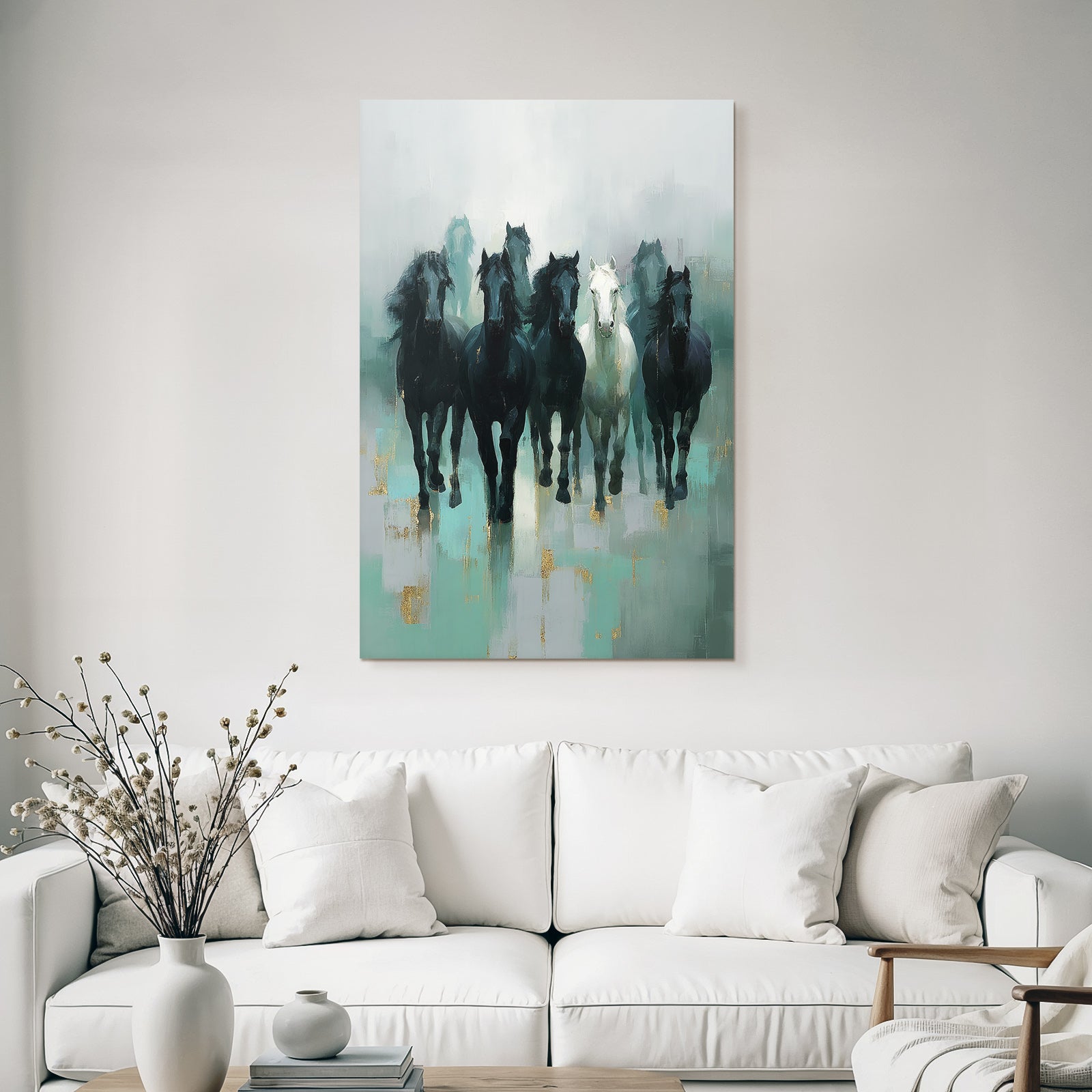 Ob im Wohnzimmer oder Essbereich – das Werk „„Pferdegruppe In Nebel““ im Stil Grandeur Chic wird im FameFrame zum stilvollen Blickfang.