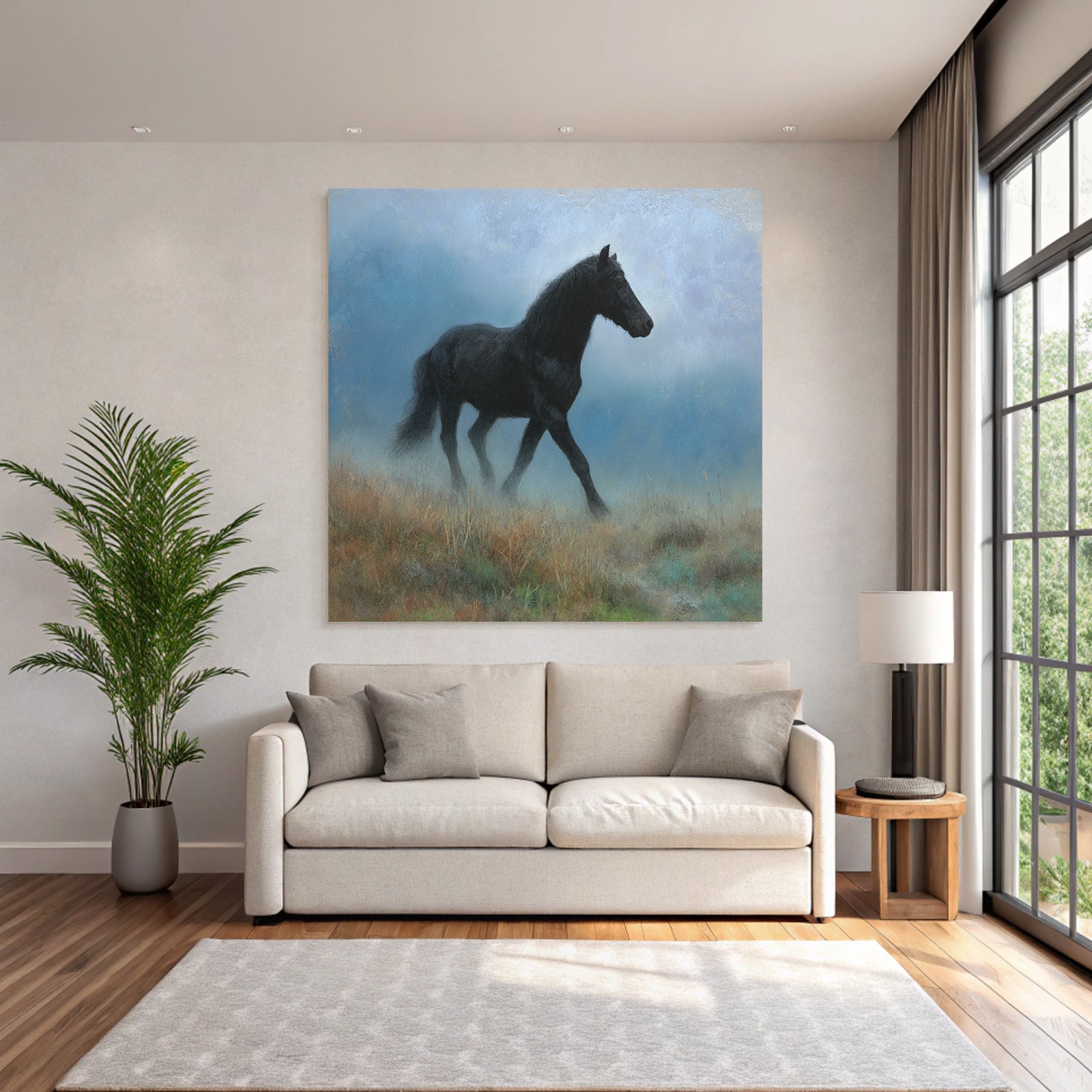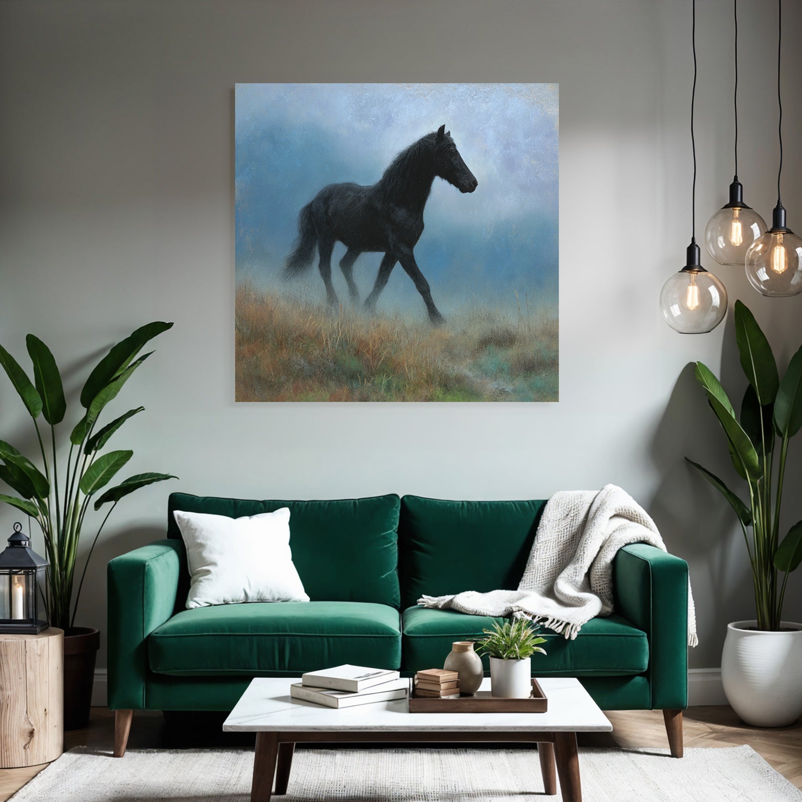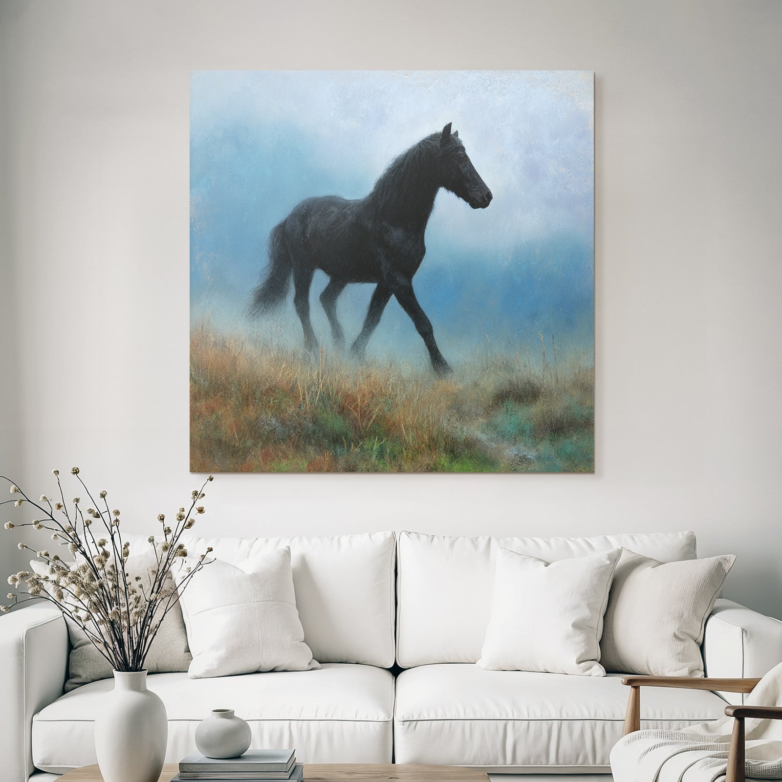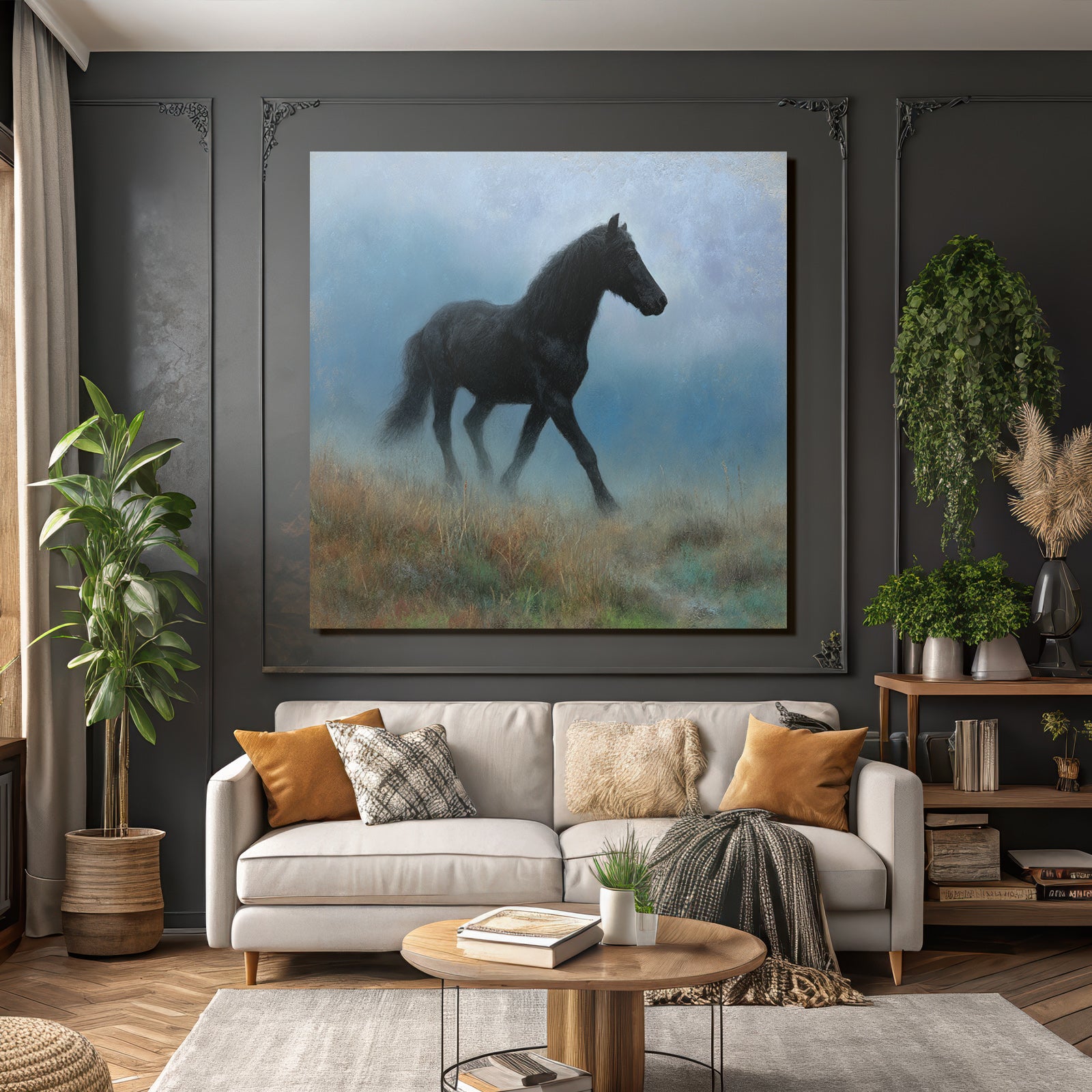 Ein Stück Grandeur Chic für Deine vier Wände: Das Werk „„Schwarzes Pferd Im Nebel““ im hochwertigen FameFrame bringt kreative Energie in jeden Raum.