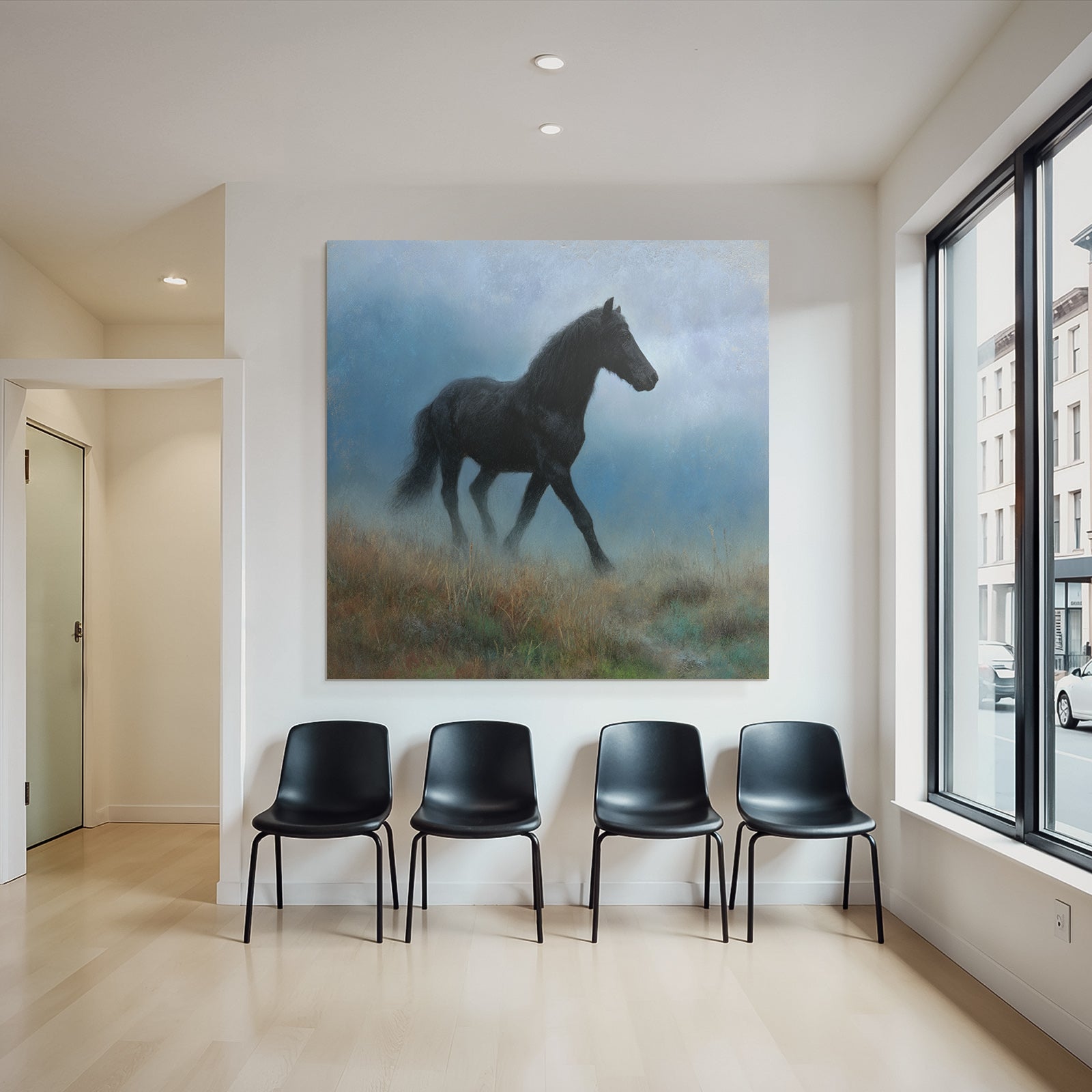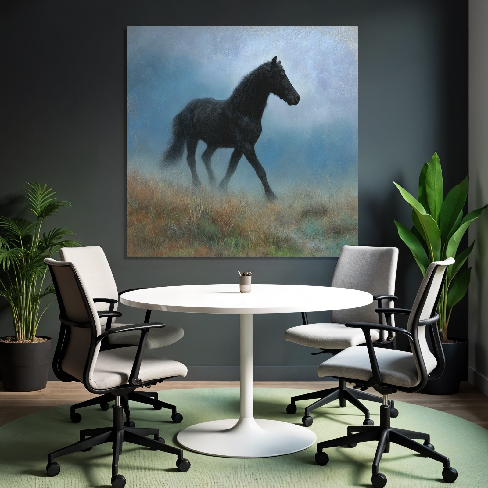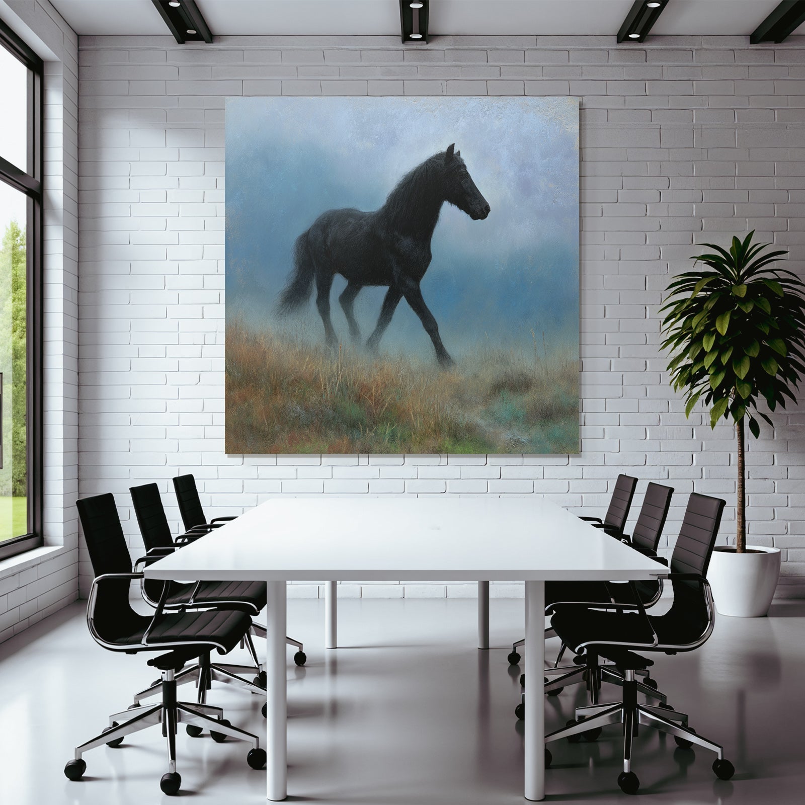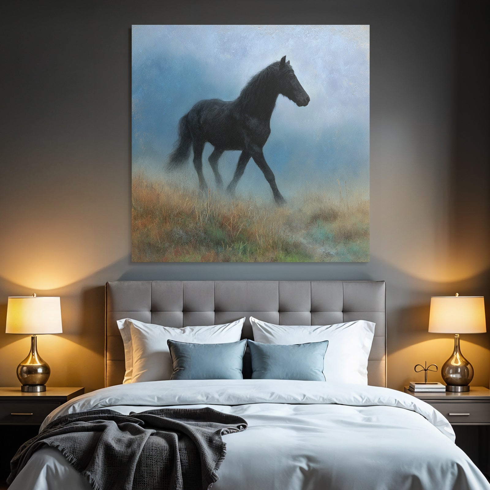 Ein Stück Grandeur Chic für Deine vier Wände: Das Werk „„Schwarzes Pferd Im Nebel““ im hochwertigen FameFrame bringt kreative Energie in jeden Raum.