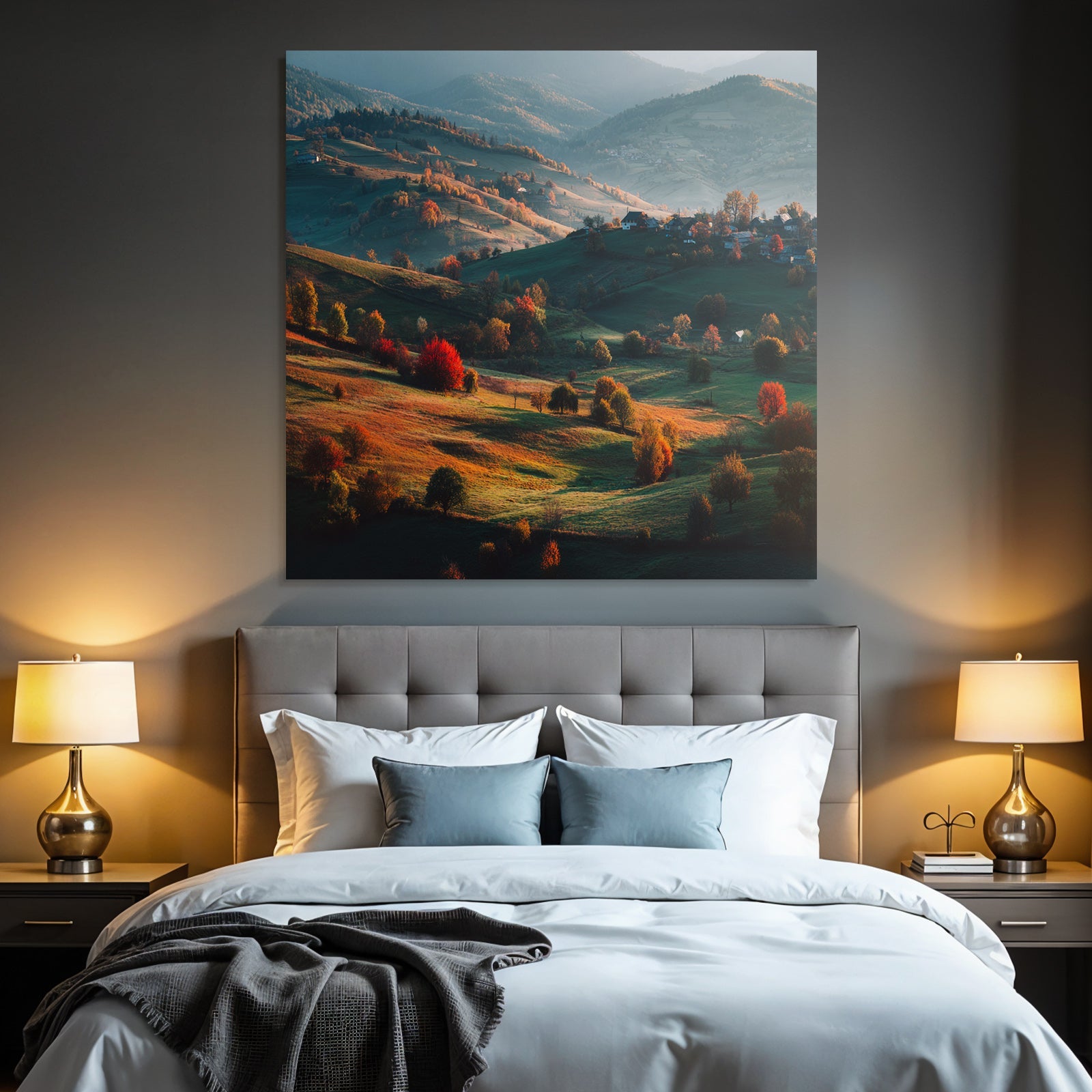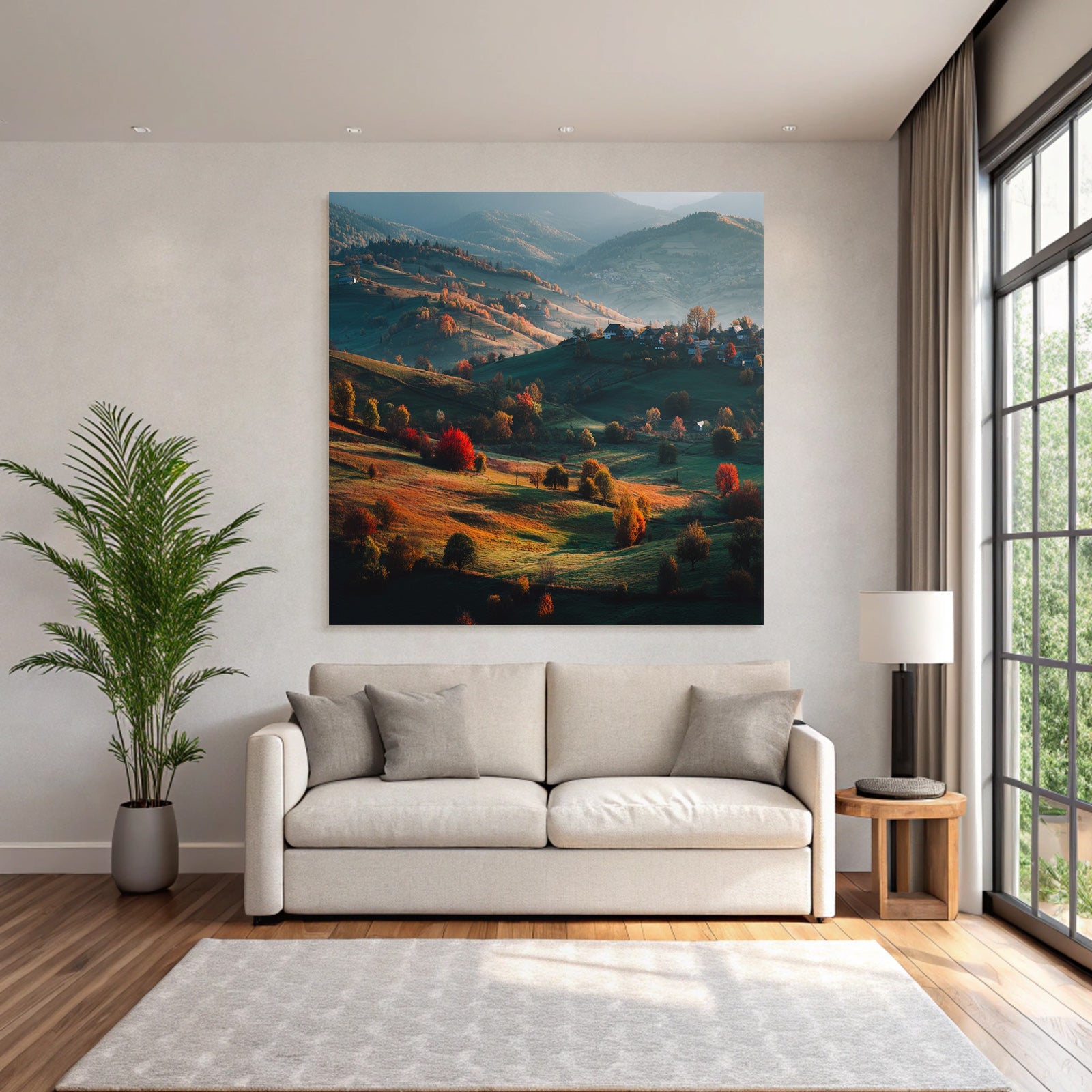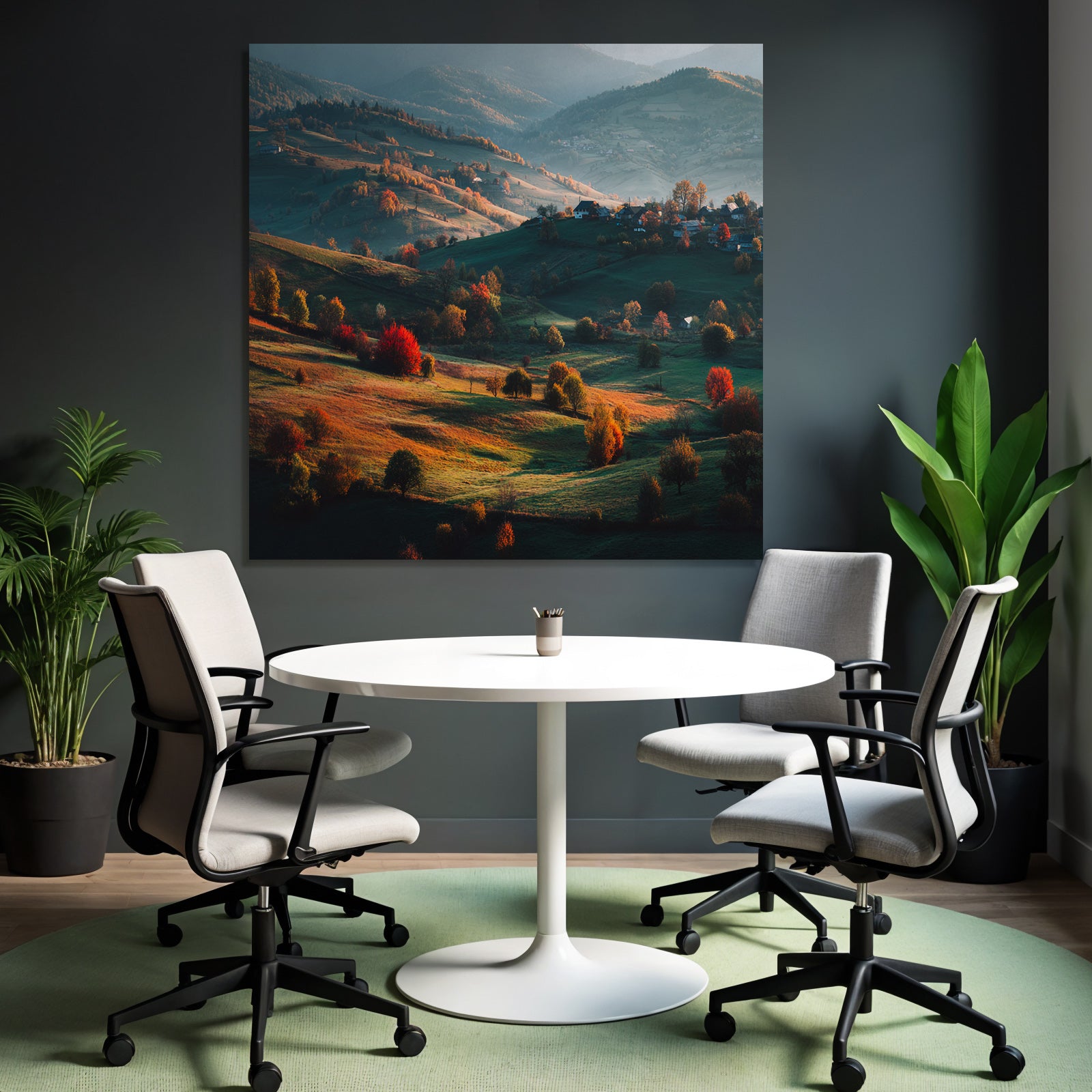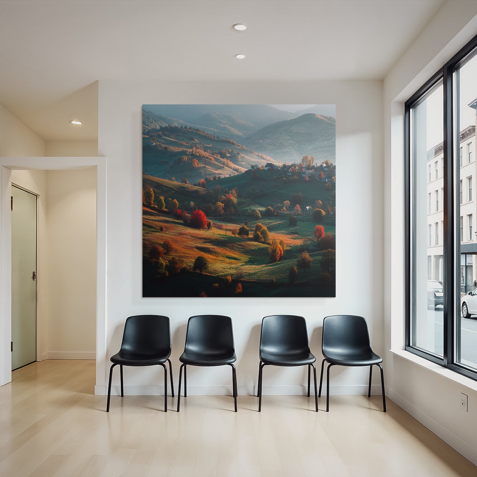 Einladend und professionell: Das Kunstwerk „Landschaft Mit Hügeln Und Bunten Bäumen“ im Stil Herbst verleiht Ihrer Praxis oder Ihrem Wartezimmer im FameFrame eine exklusive Note.