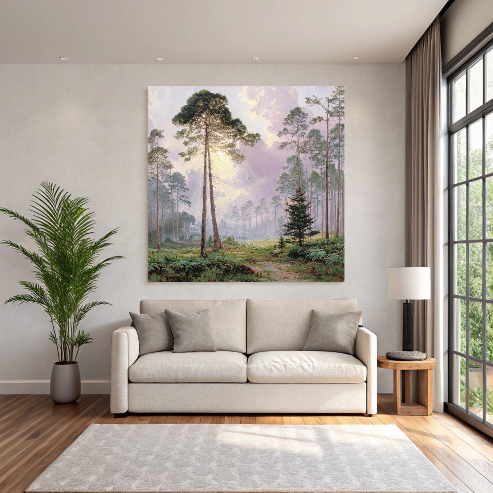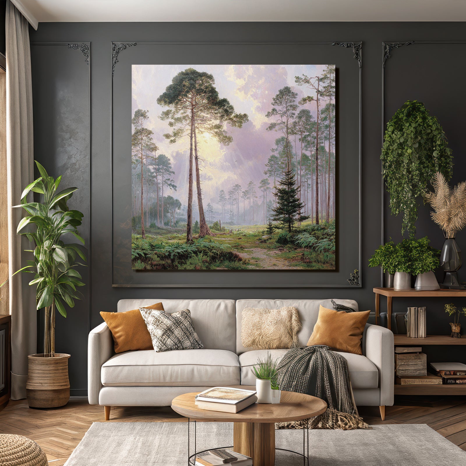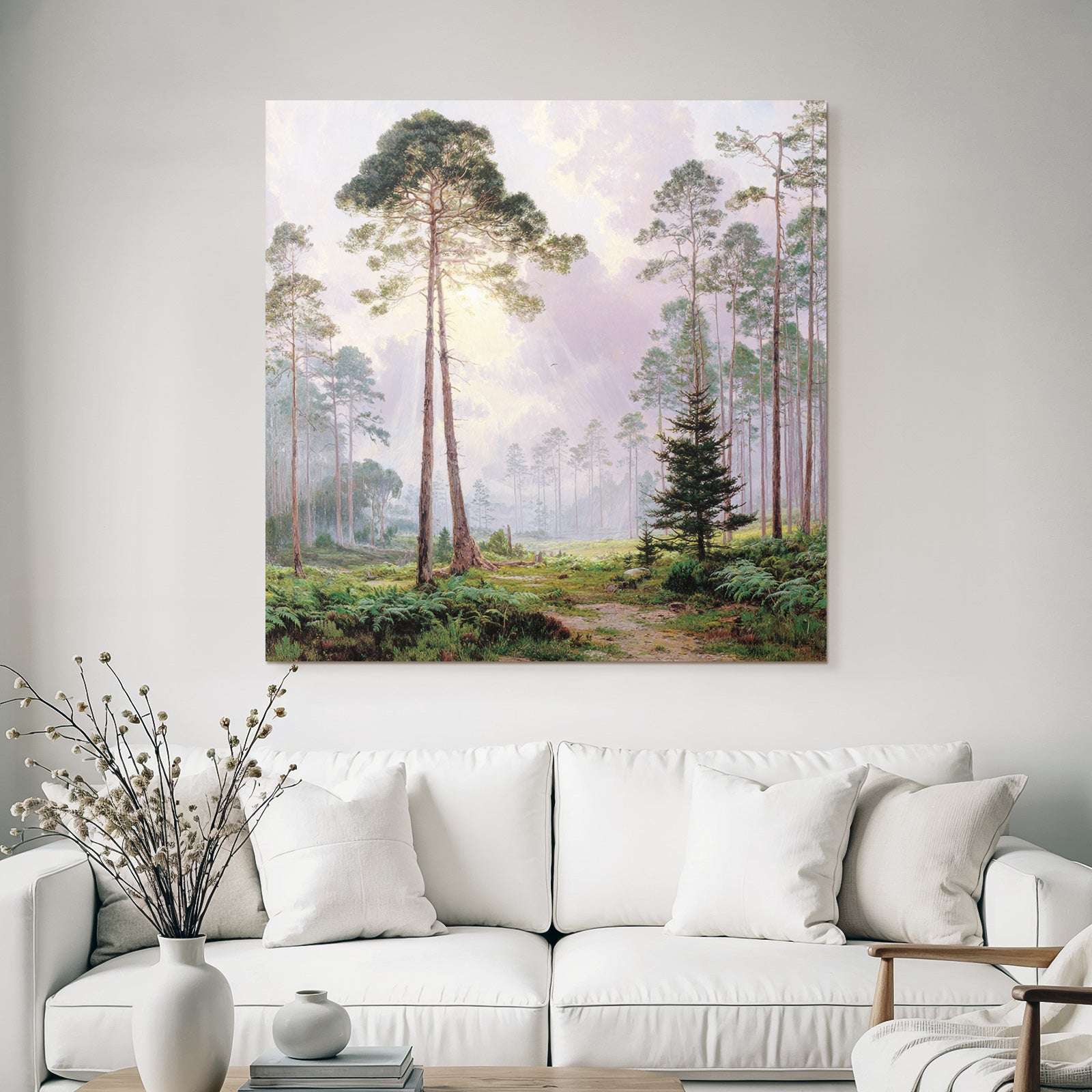 Mit Himmel und Wolken-Elementen und klarer Wirkung verleiht „Friedlicher Wald Mit Sonnenstrahlen“ Deinem Raum Persönlichkeit – eingerahmt im exklusiven FameFrame.