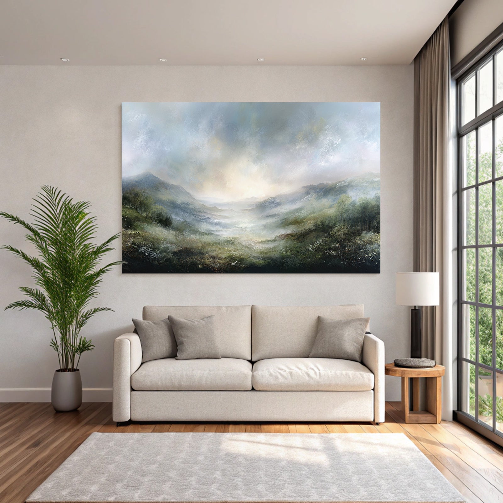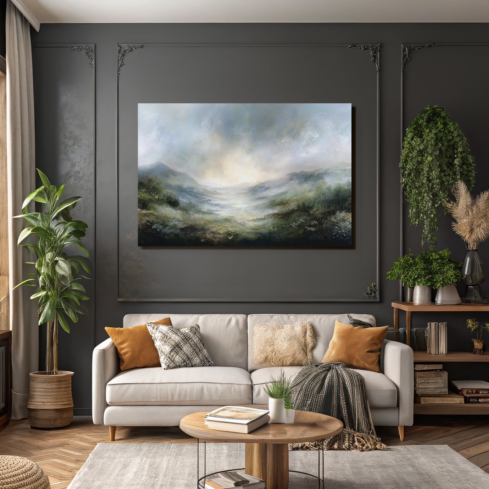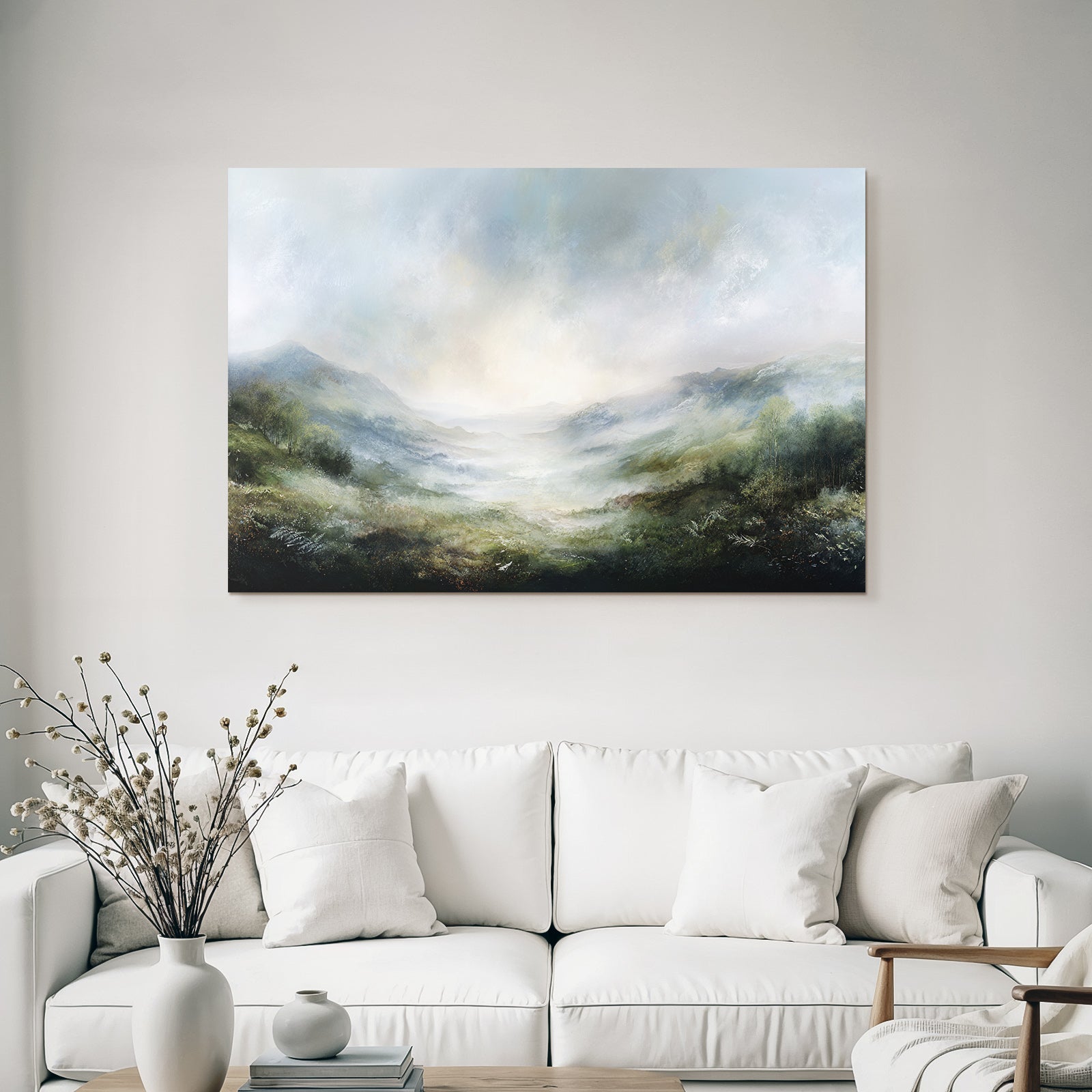 „Morgennebel Im Bergtal“ verbindet das Beste aus Himmel und Wolken mit modernem Textildruck – edel präsentiert im hochwertigen FameFrame.