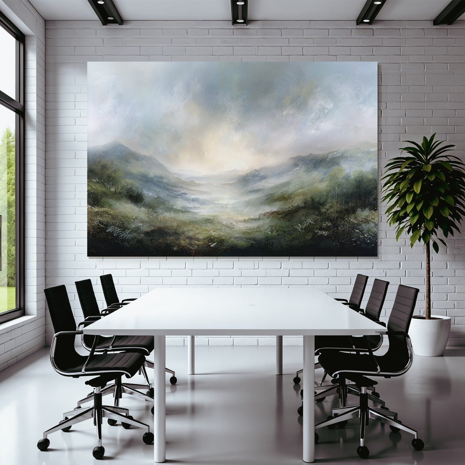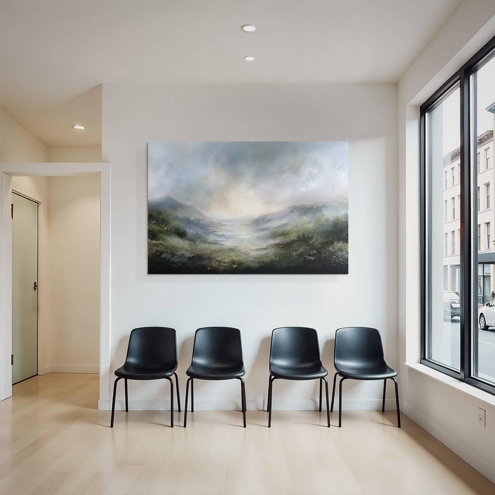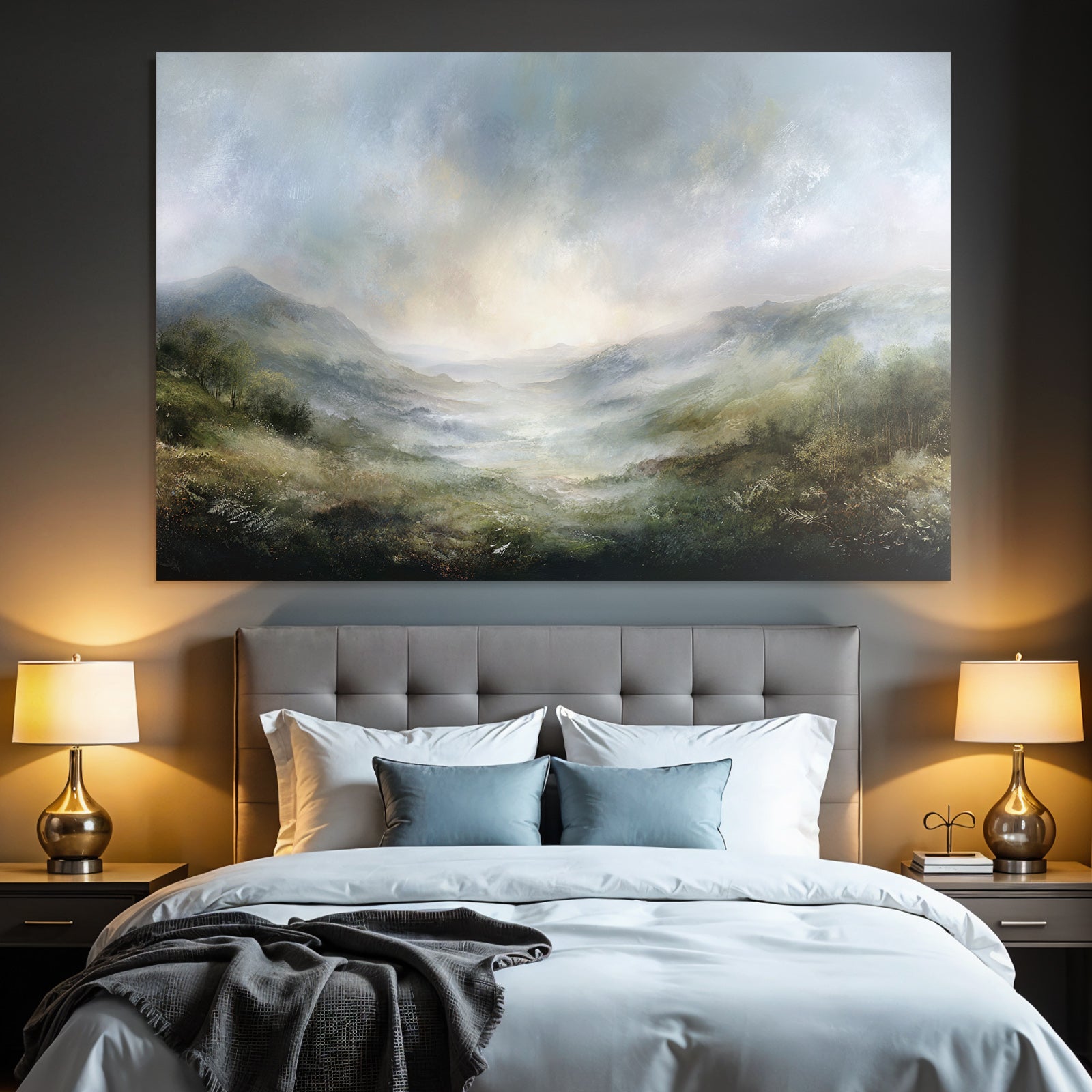 „Morgennebel Im Bergtal“ verbindet das Beste aus Himmel und Wolken mit modernem Textildruck – edel präsentiert im hochwertigen FameFrame.