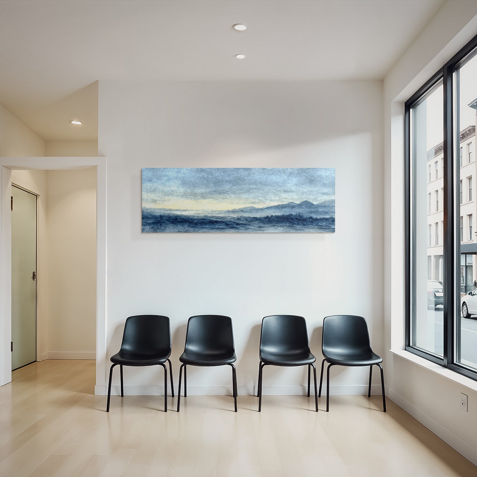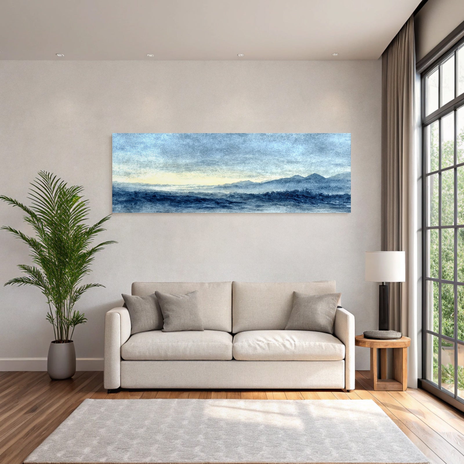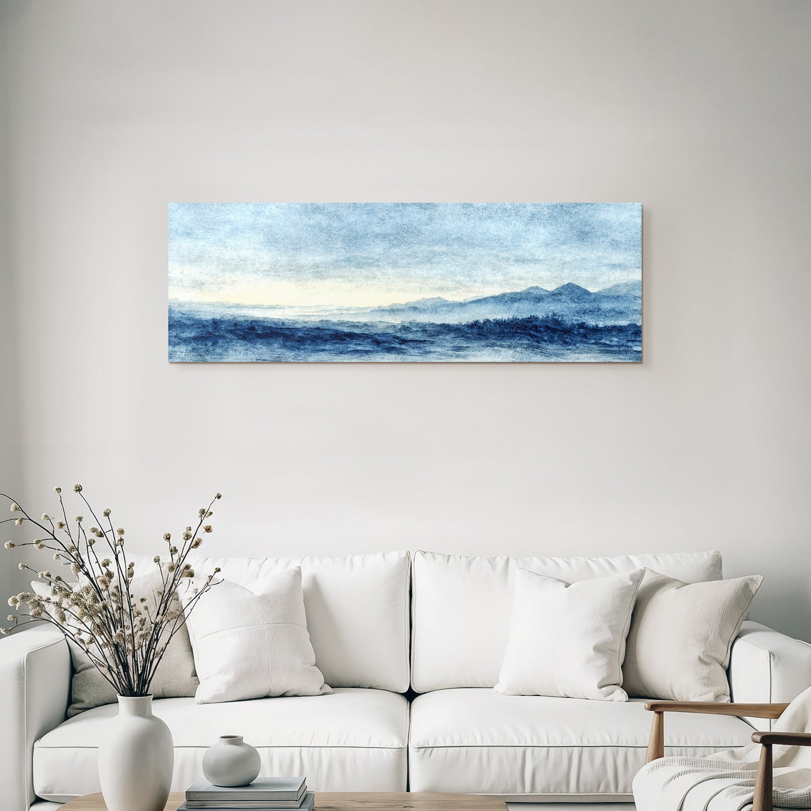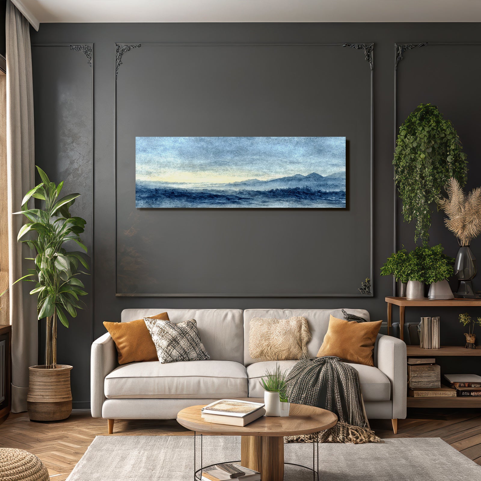 Ob Flur, Wohnraum oder Wartebereich – das Motiv „Mystische Berglandschaft Im Nebel“ im Stil Himmel und Wolken wirkt durch den hochwertigen FameFrame besonders modern.