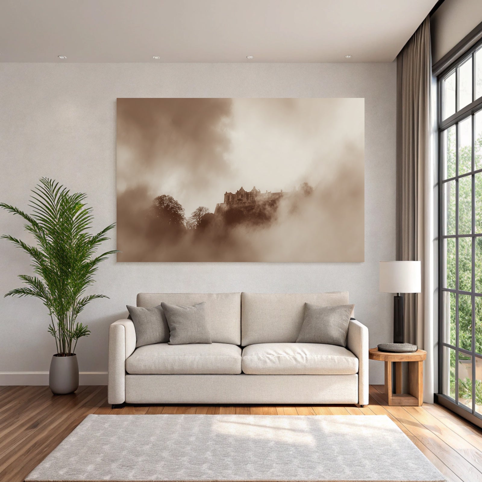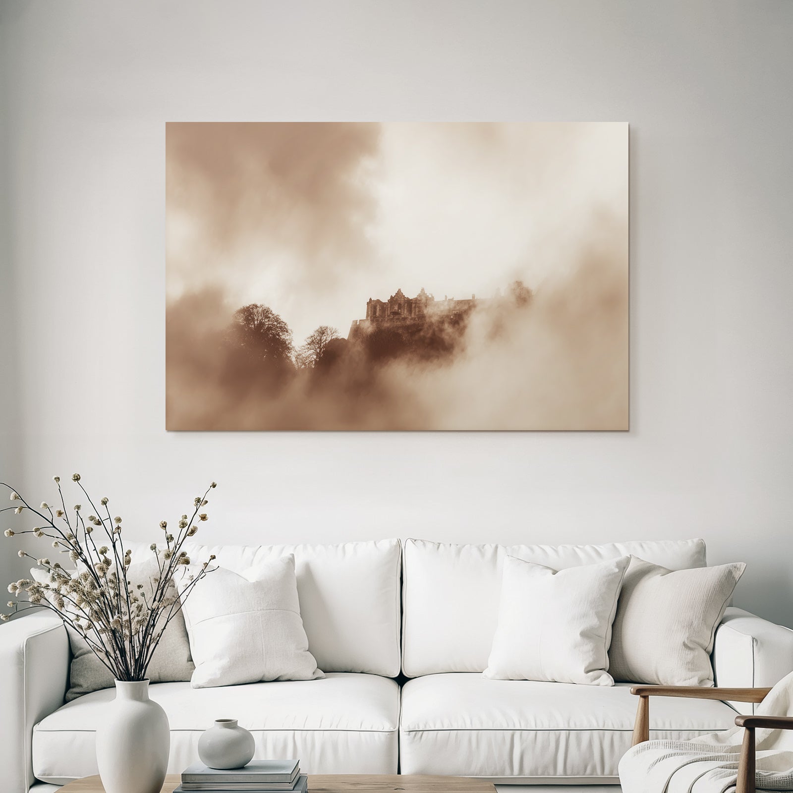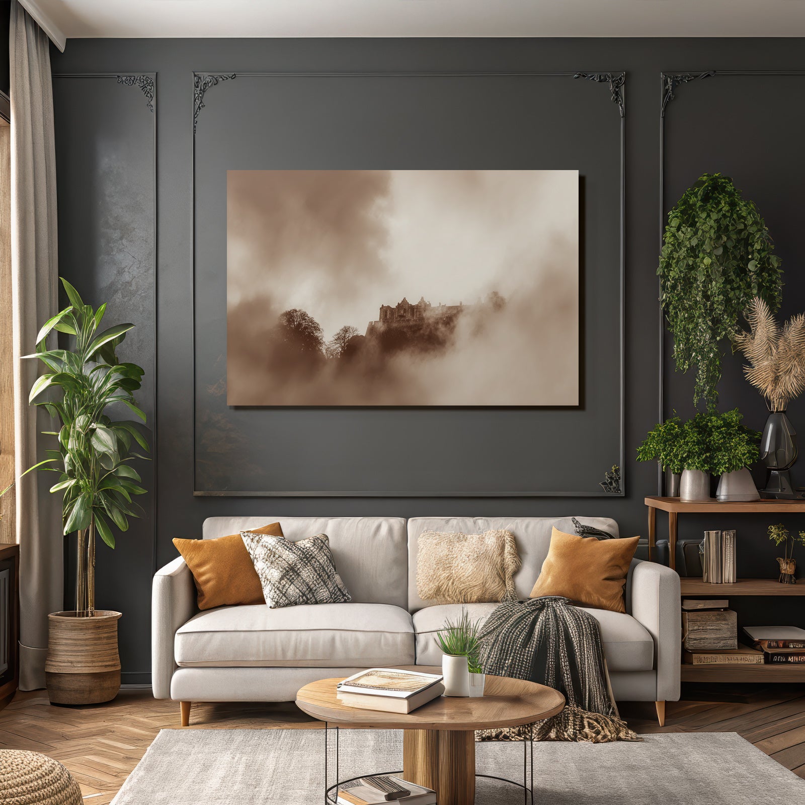 Gestalten Sie Ihr Homeoffice oder Büro inspirierend und modern. „Mystische Burg Im Sepiaton“ im Himmel und Wolken-Look sorgt im FameFrame für eine kreative Arbeitsatmosphäre.