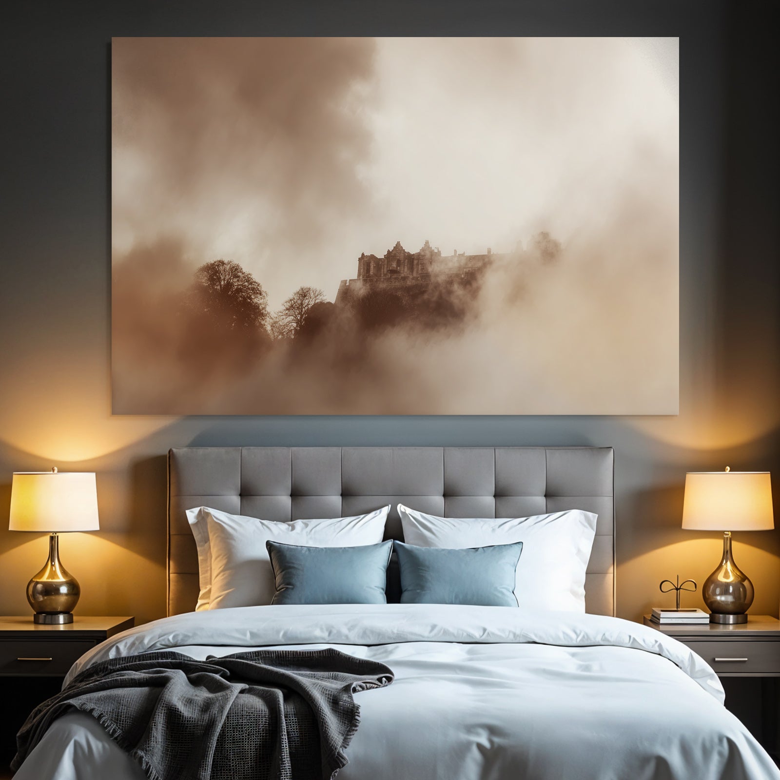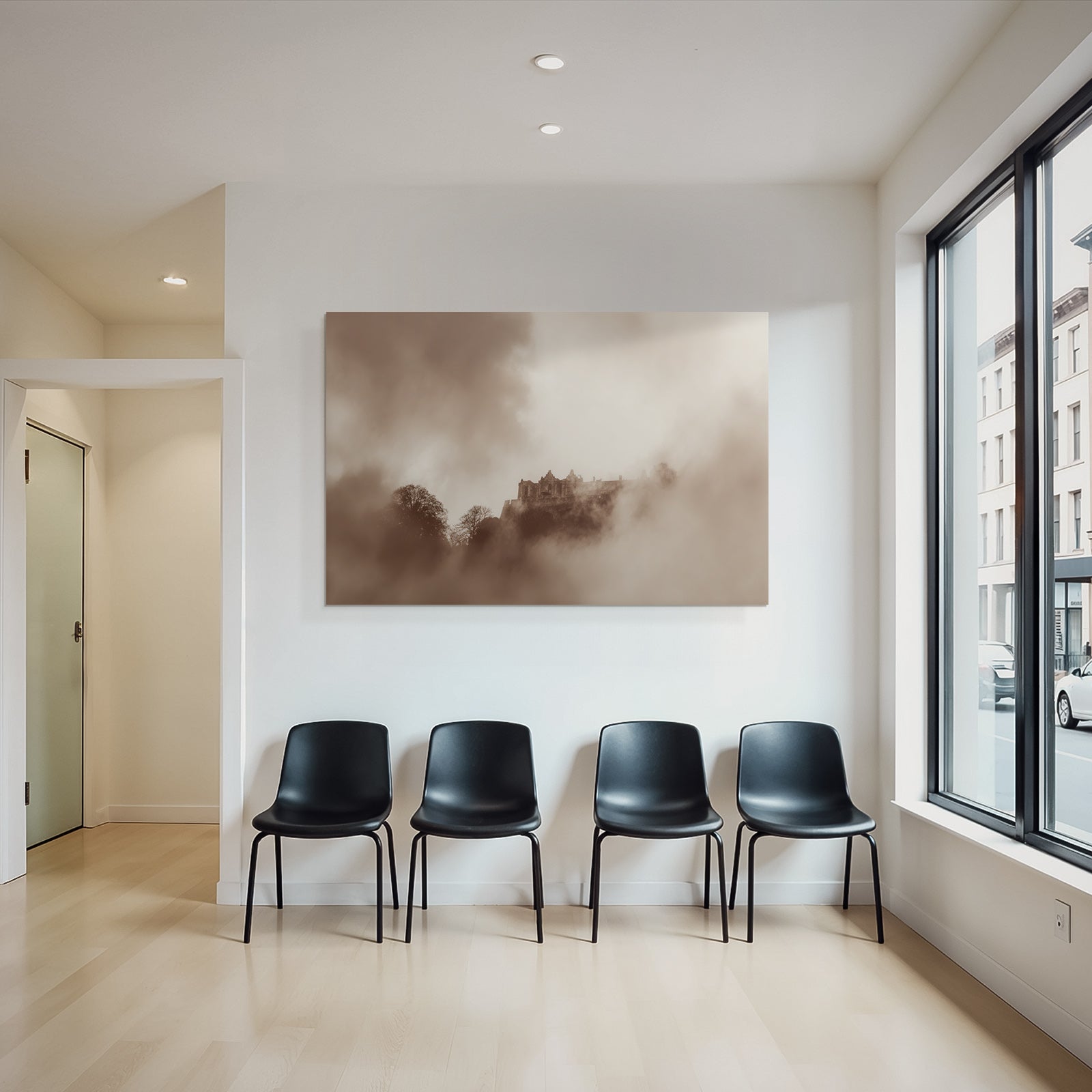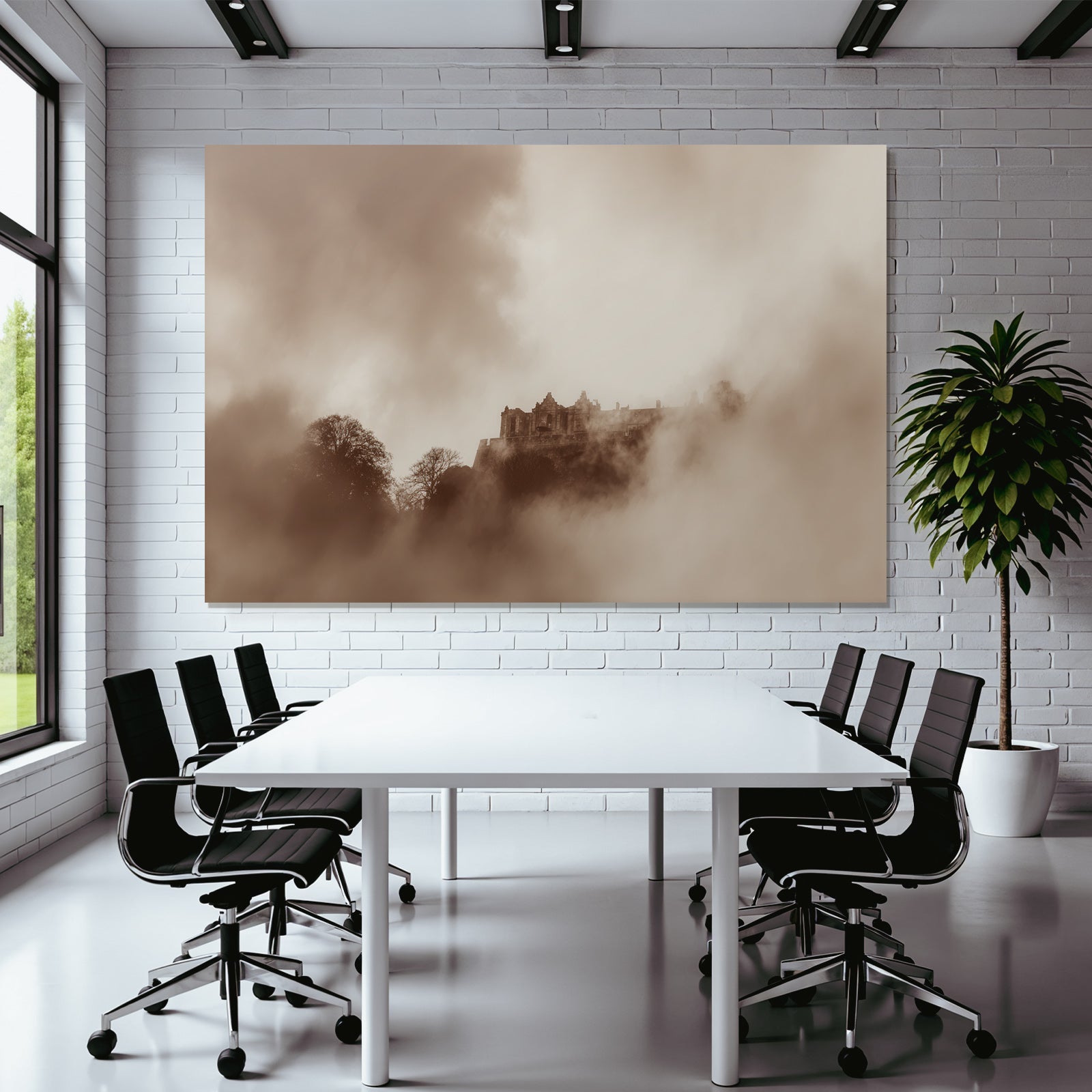 Gestalten Sie Ihr Homeoffice oder Büro inspirierend und modern. „Mystische Burg Im Sepiaton“ im Himmel und Wolken-Look sorgt im FameFrame für eine kreative Arbeitsatmosphäre.