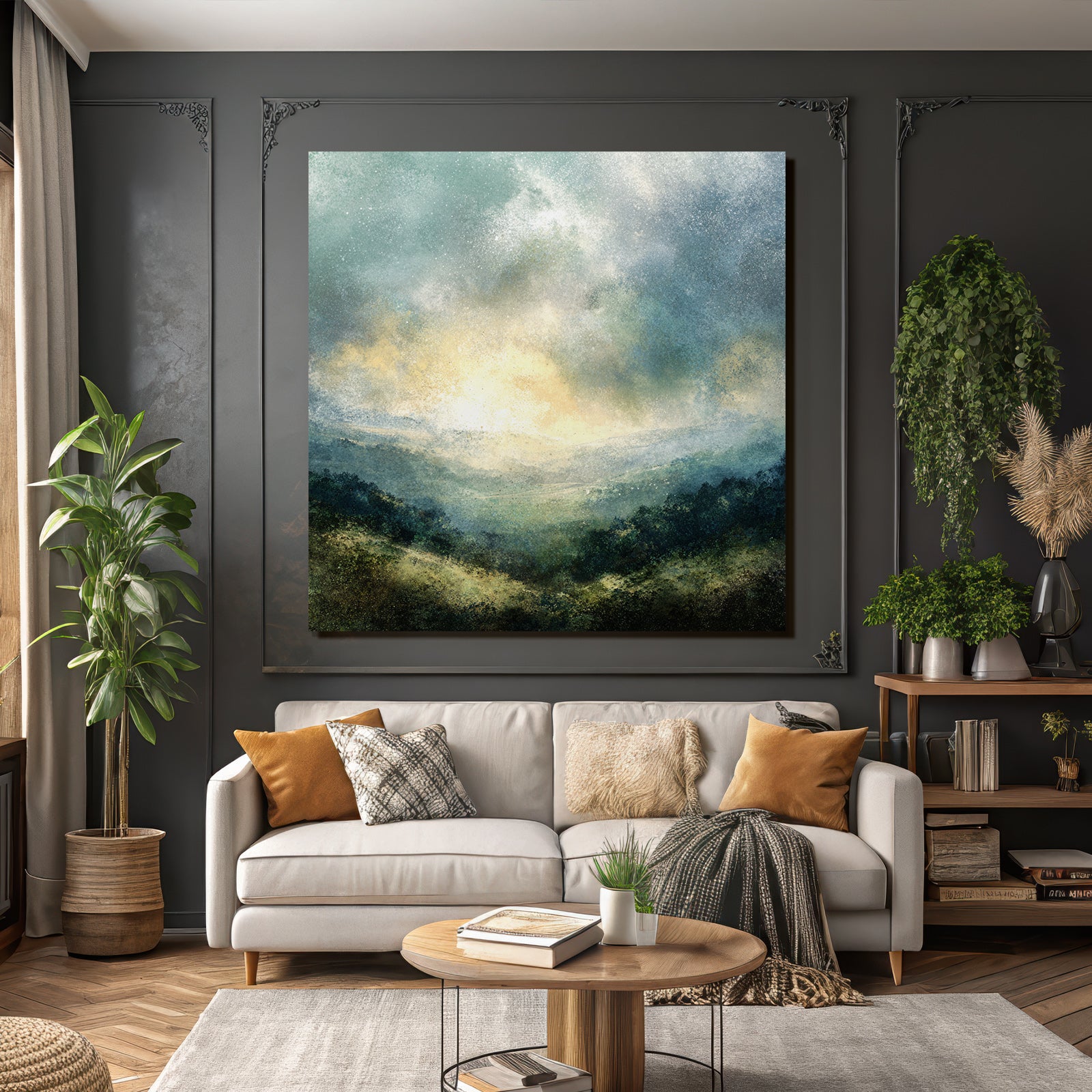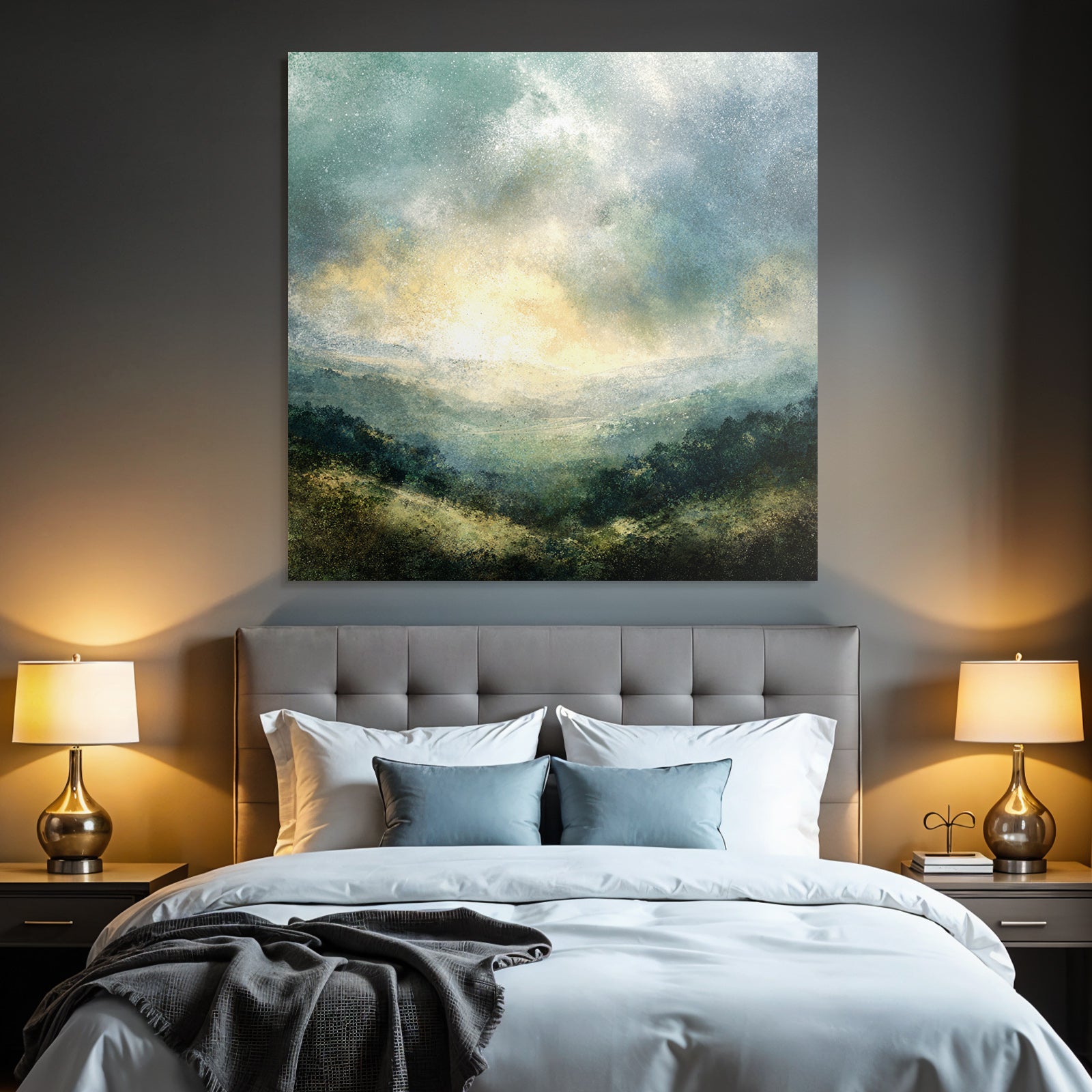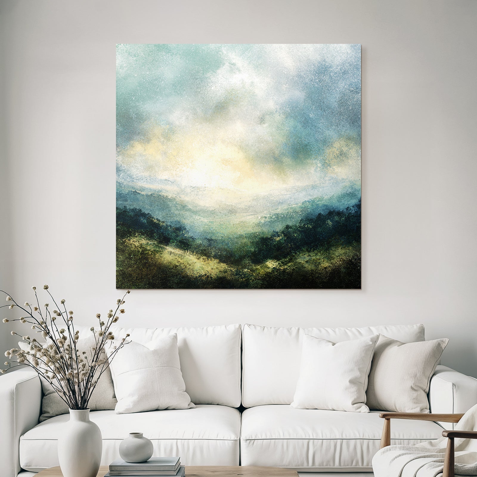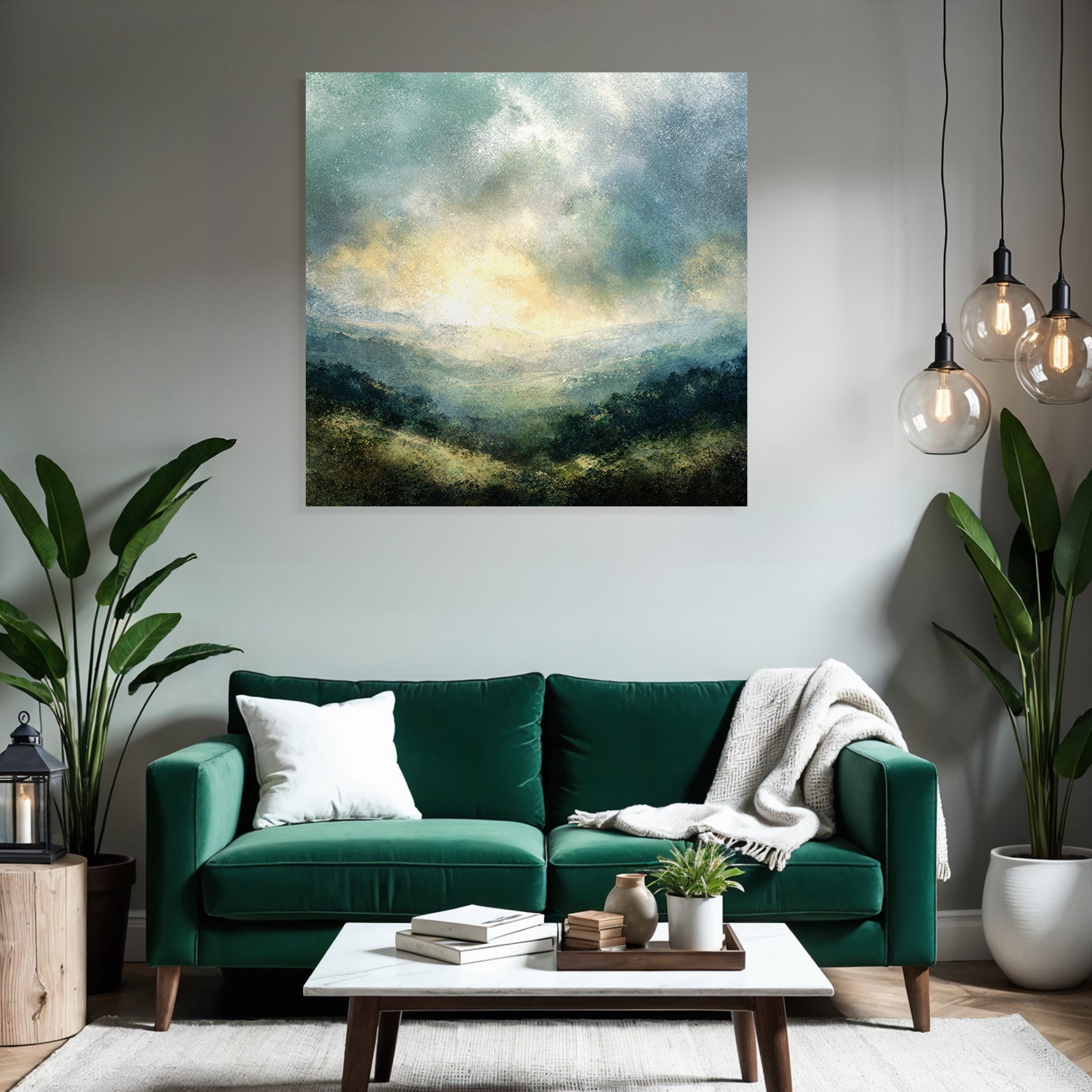 Das Motiv „Sonnenaufgang Im Grünen Bergtal“ bringt Himmel und Wolken-Inspiration in Dein Zuhause – brillant gedruckt und elegant im FameFrame aufgespannt.