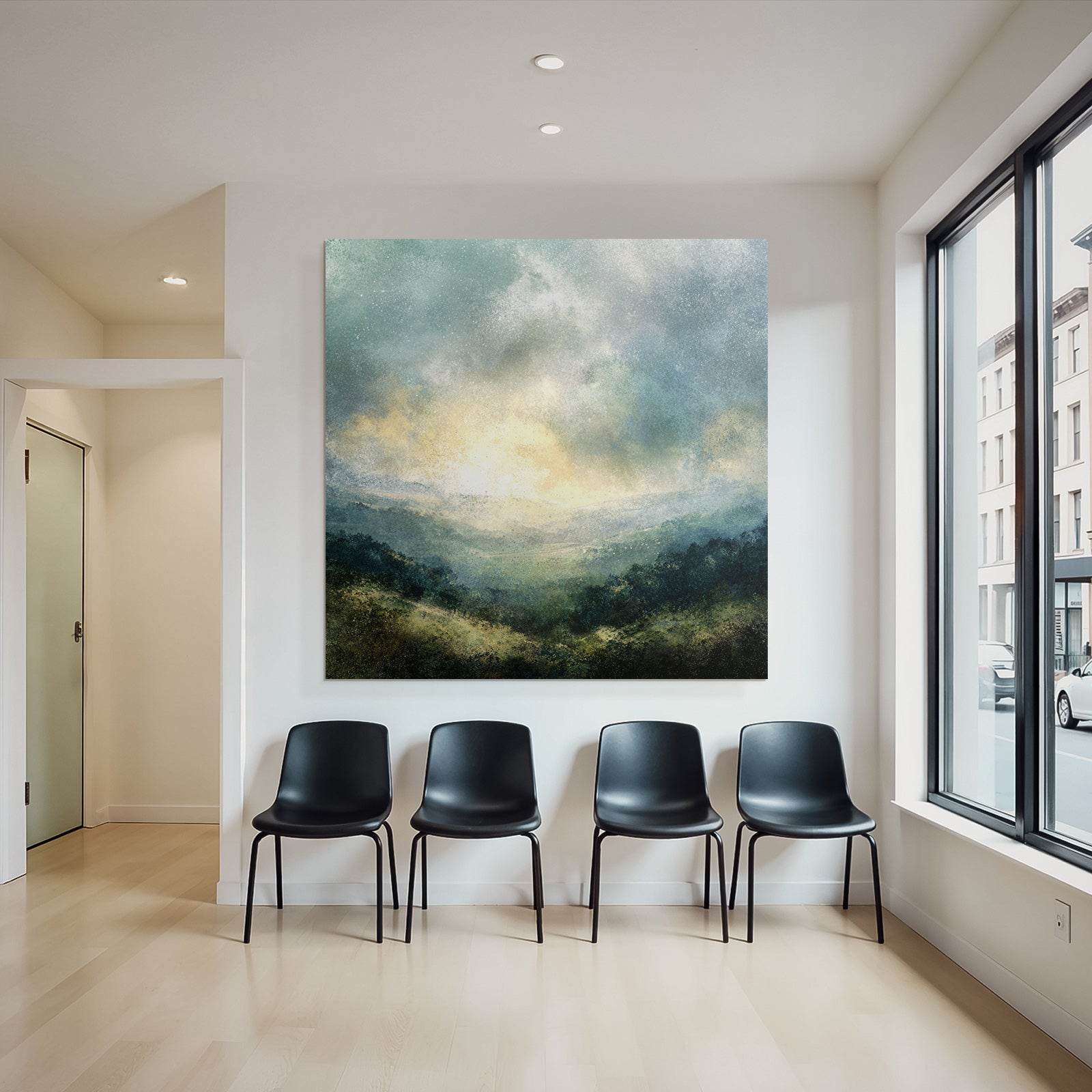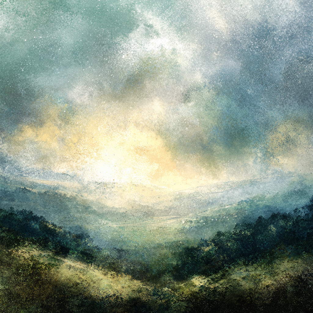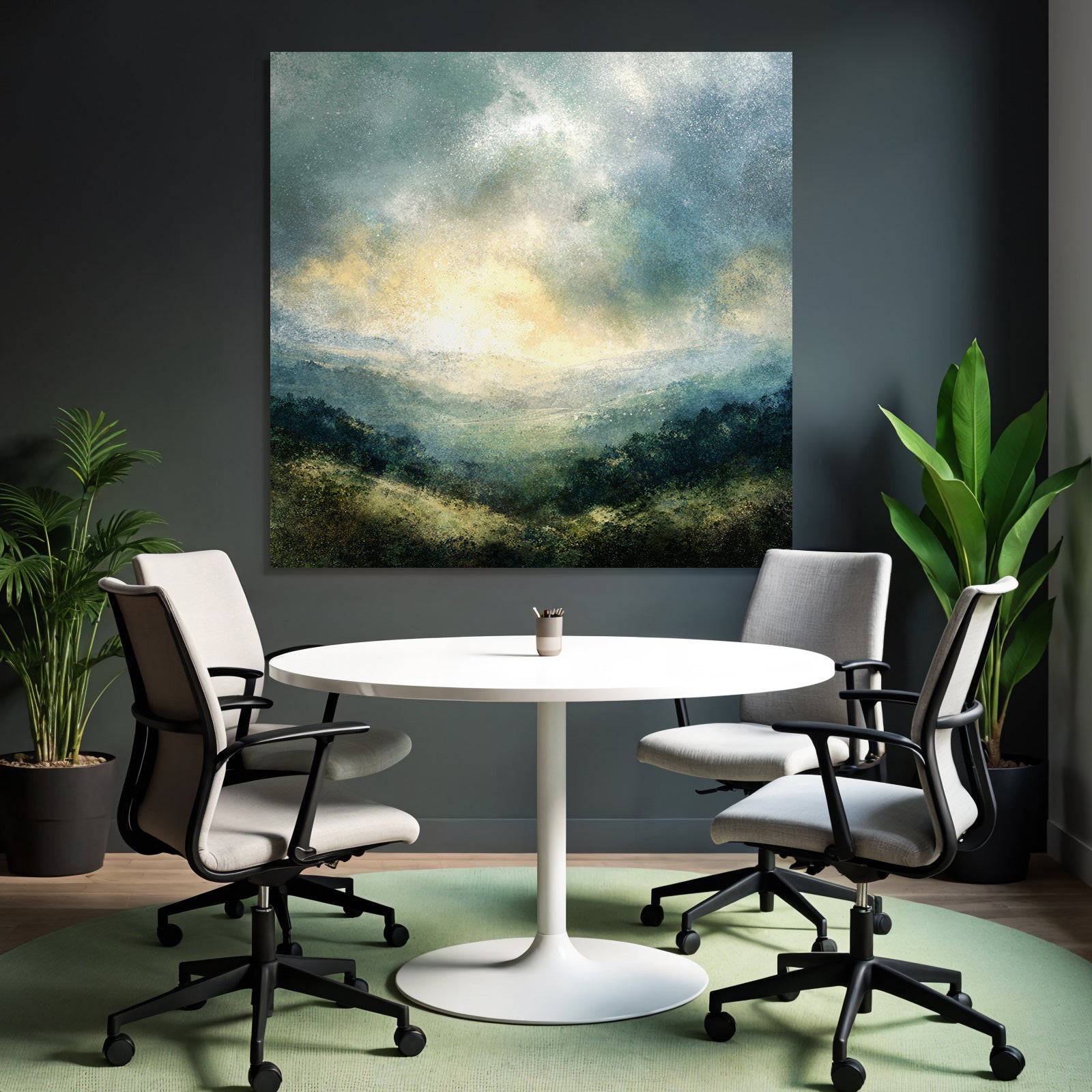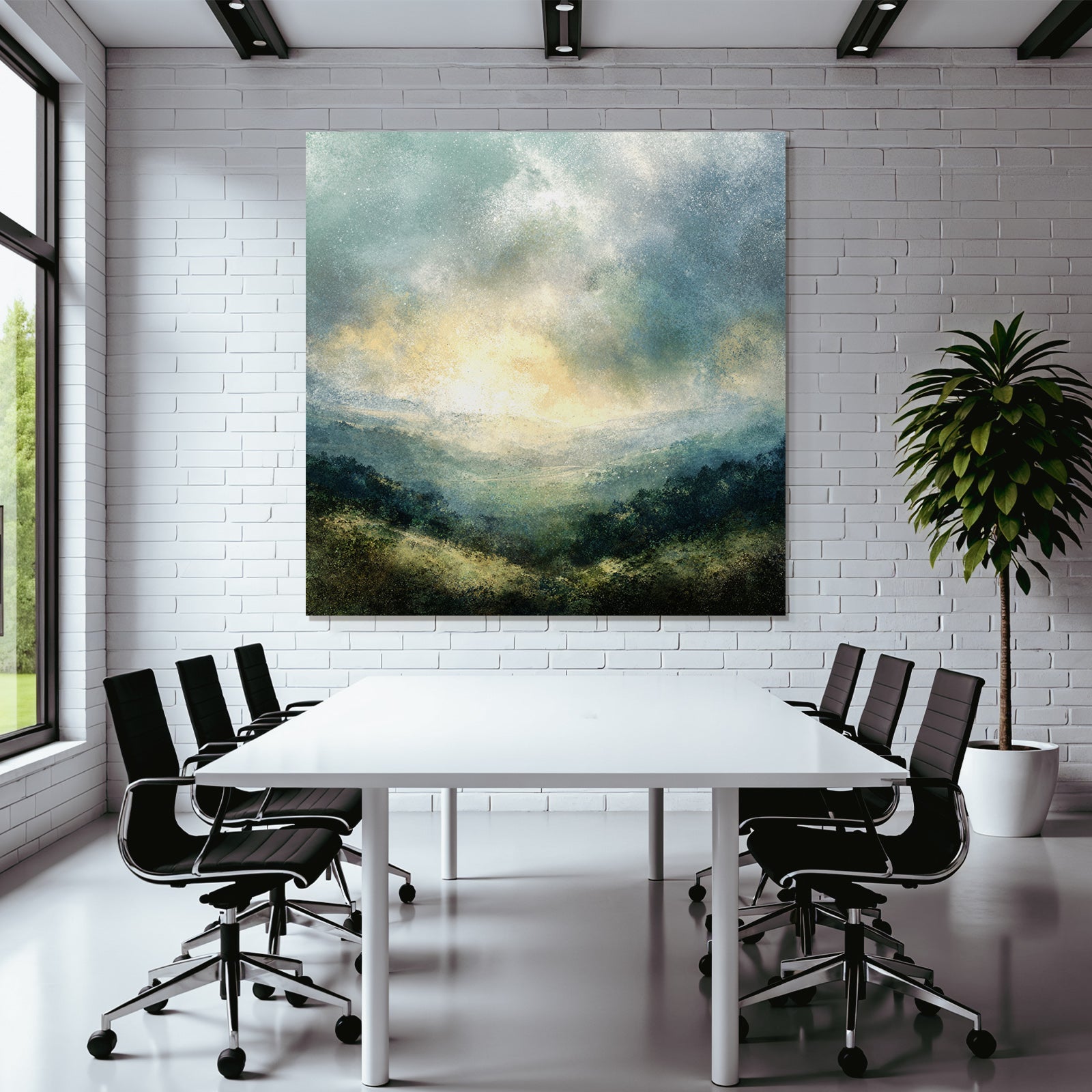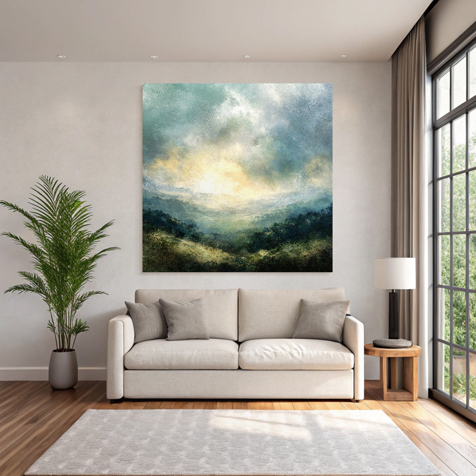 Das Motiv „Sonnenaufgang Im Grünen Bergtal“ bringt Himmel und Wolken-Inspiration in Dein Zuhause – brillant gedruckt und elegant im FameFrame aufgespannt.