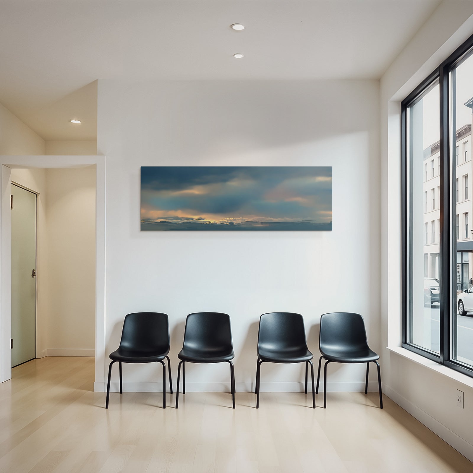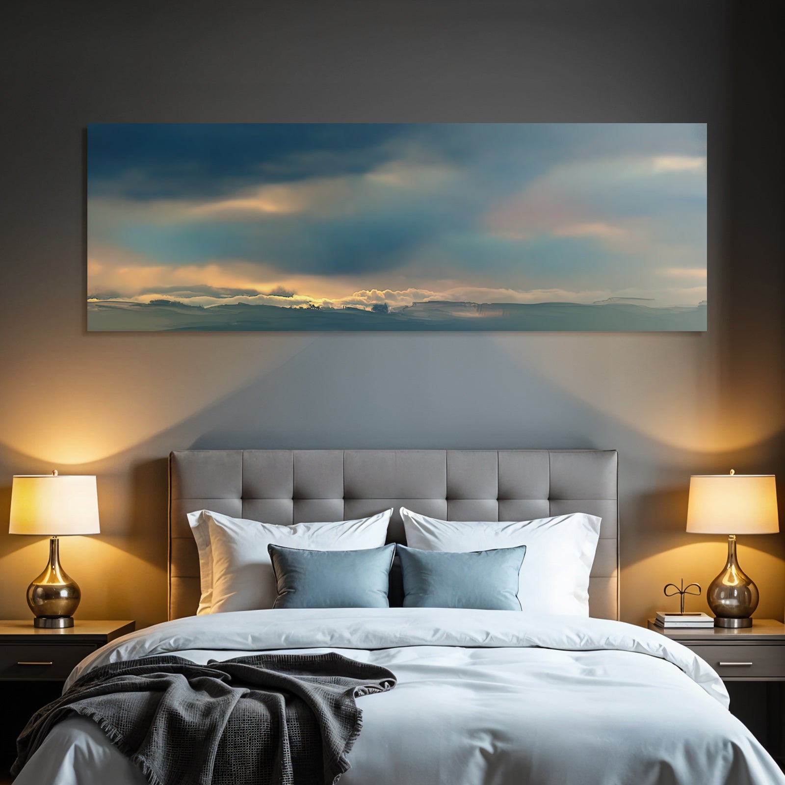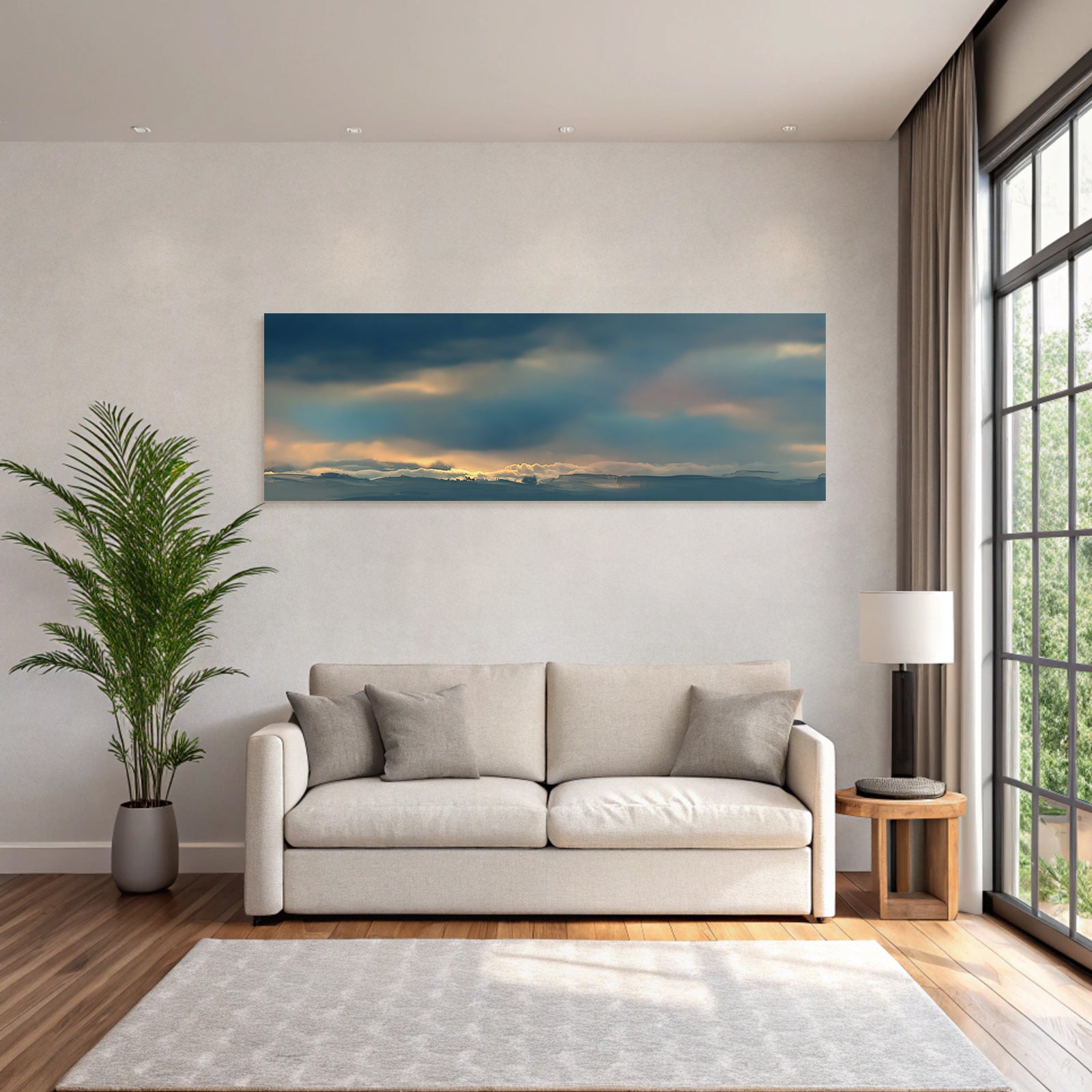 Für Liebhaber des Himmel und Wolken-Looks: Das Kunstwerk „Stimmungsvolle Wolkenlandschaft Im Sonnenaufgang“ bringt die charakteristischen Merkmale dieses Stils brillant auf Stoff – perfektioniert durch den FameFrame.