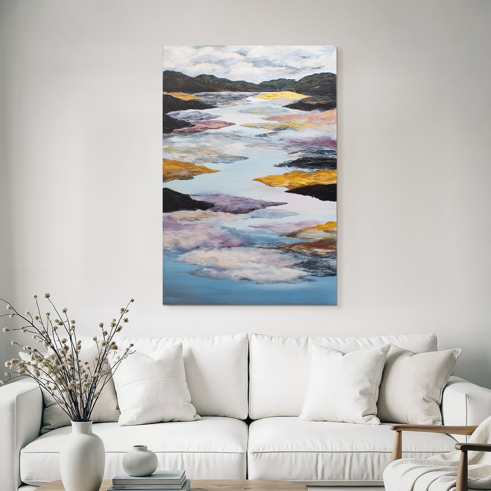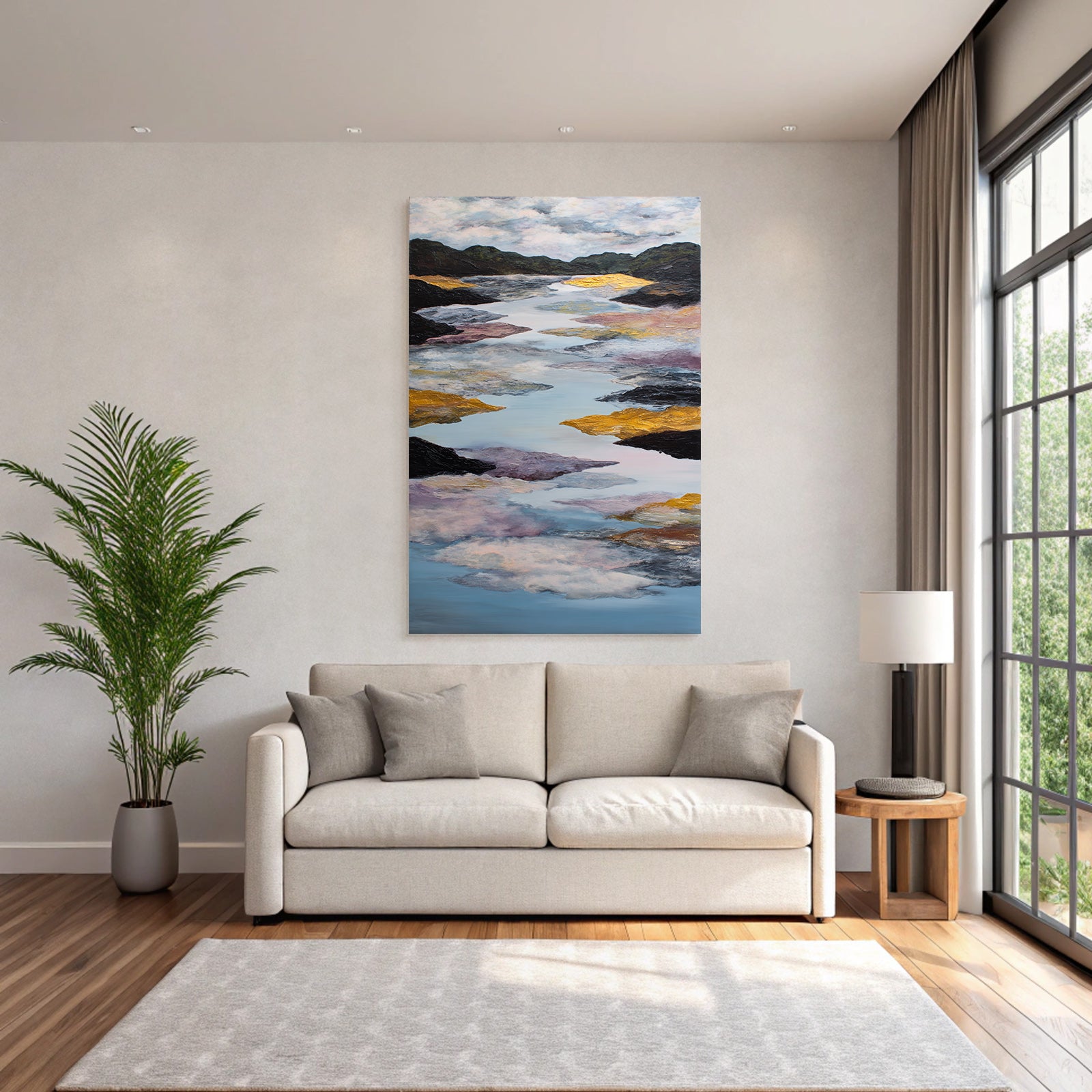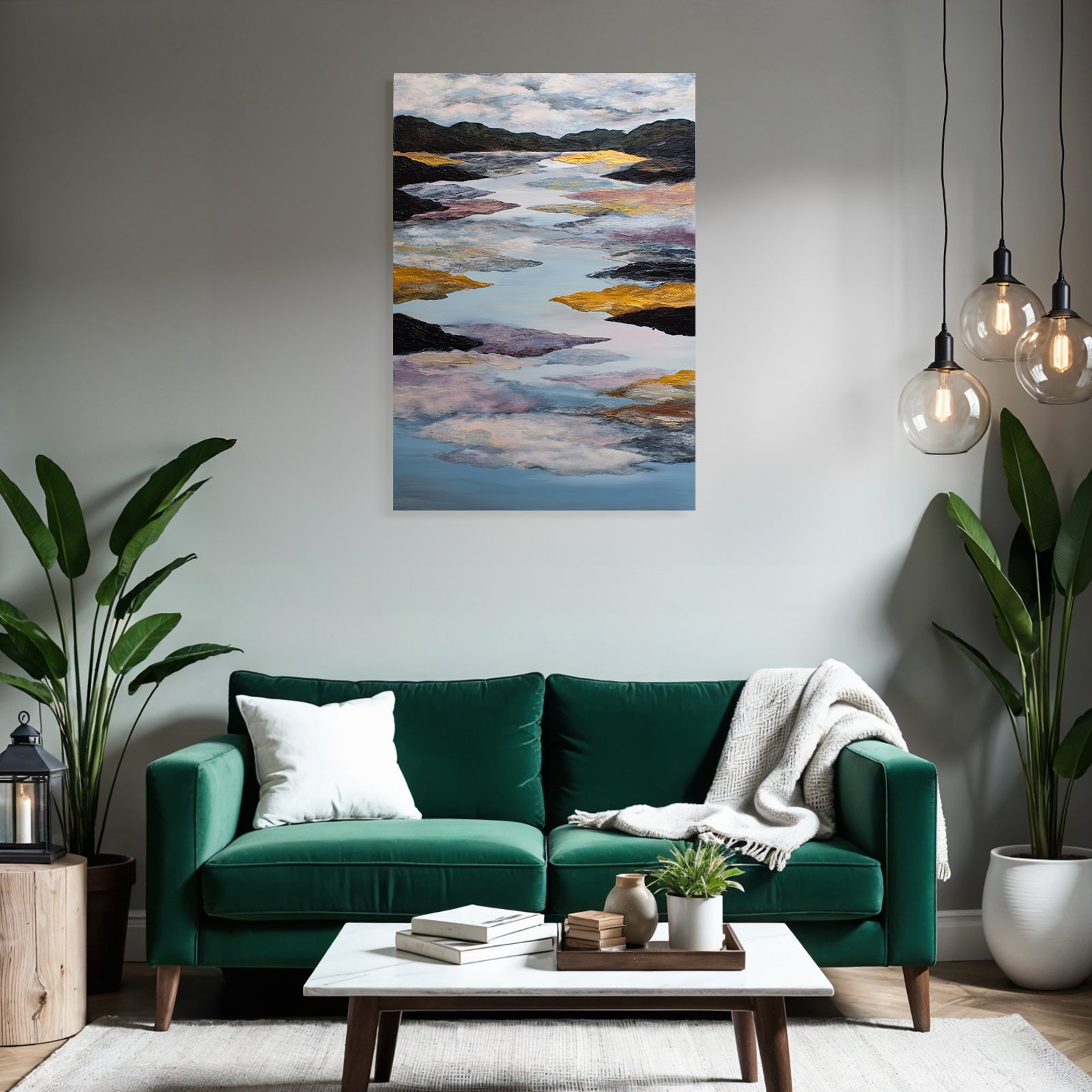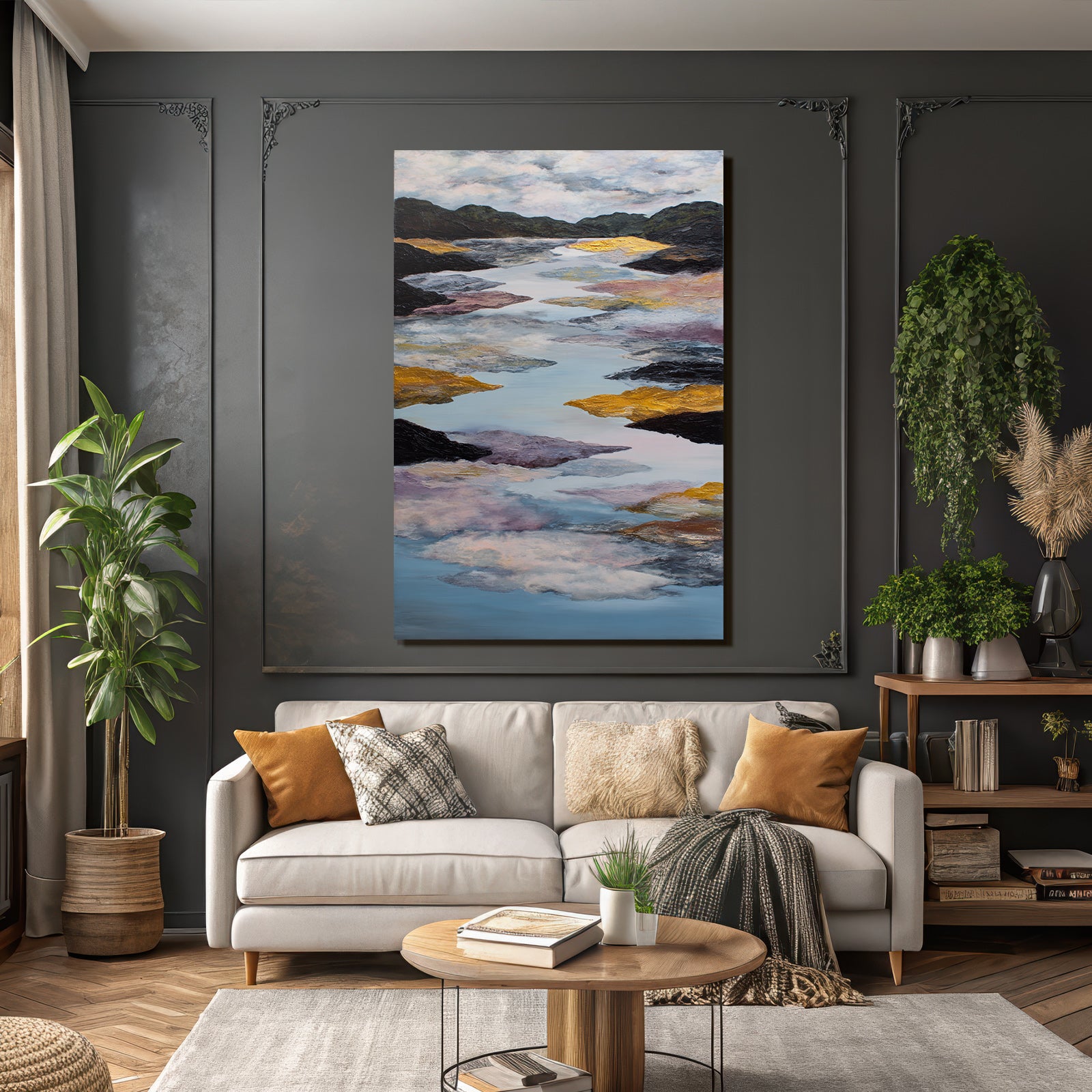 Setz ein Statement: „Yoga Meditation Abstrakte Landschaft Mit Fluss Und Hügeln Serene Atmosphäre Ruhe“ im Stil Yoga und Meditation wird im FameFrame™ zum echten Kunstobjekt an Deiner Wand.