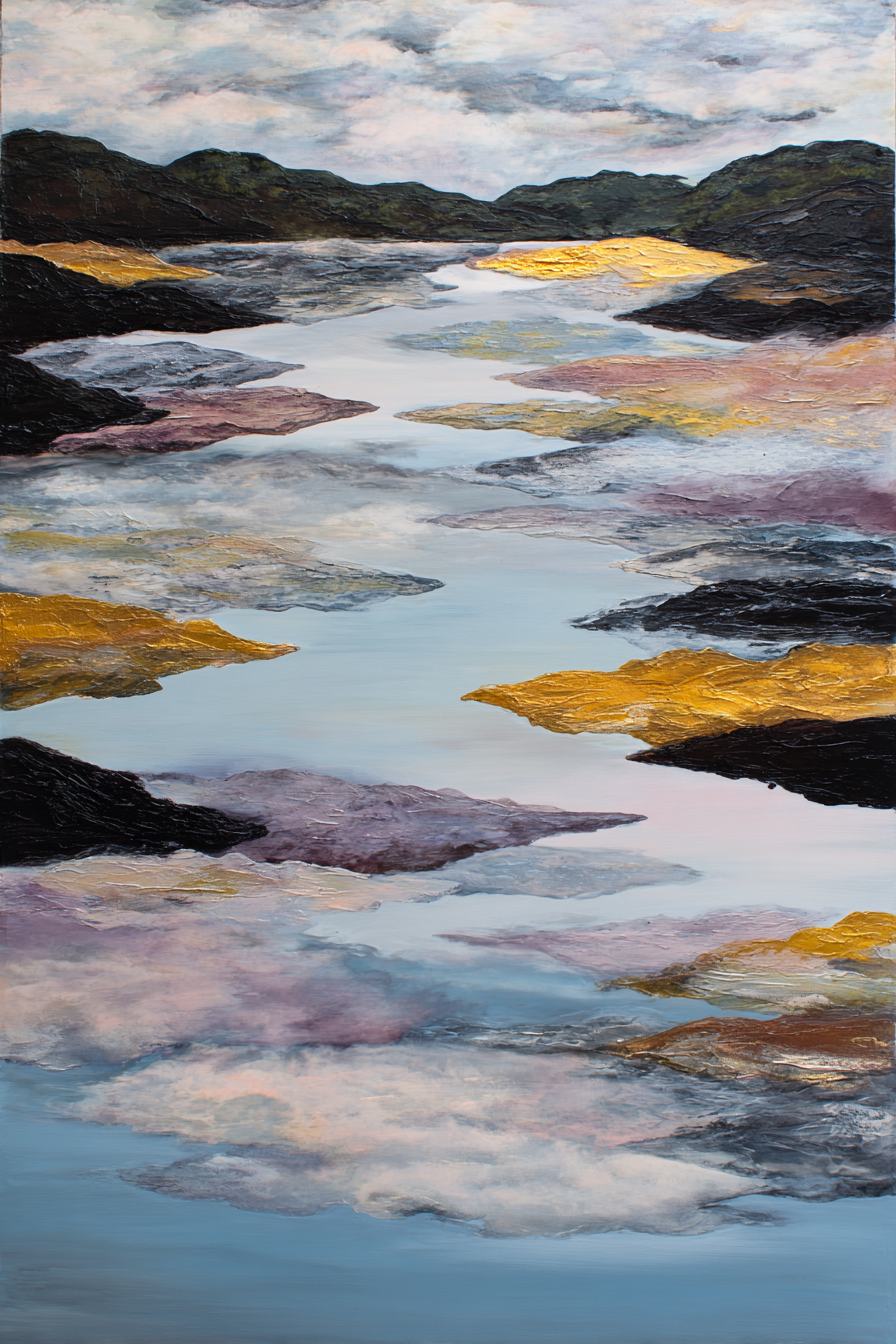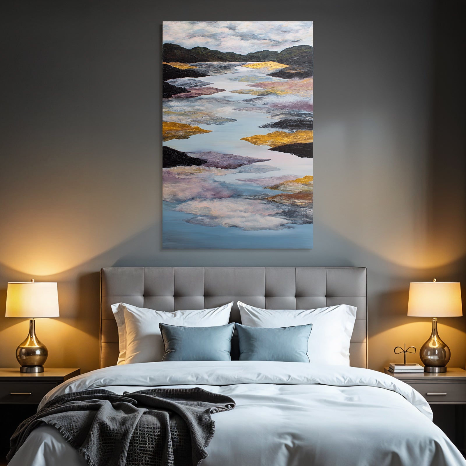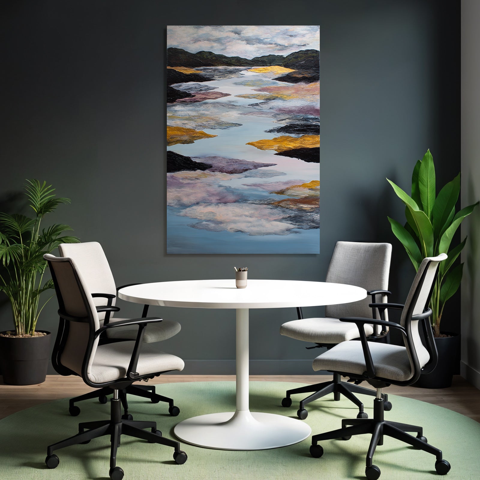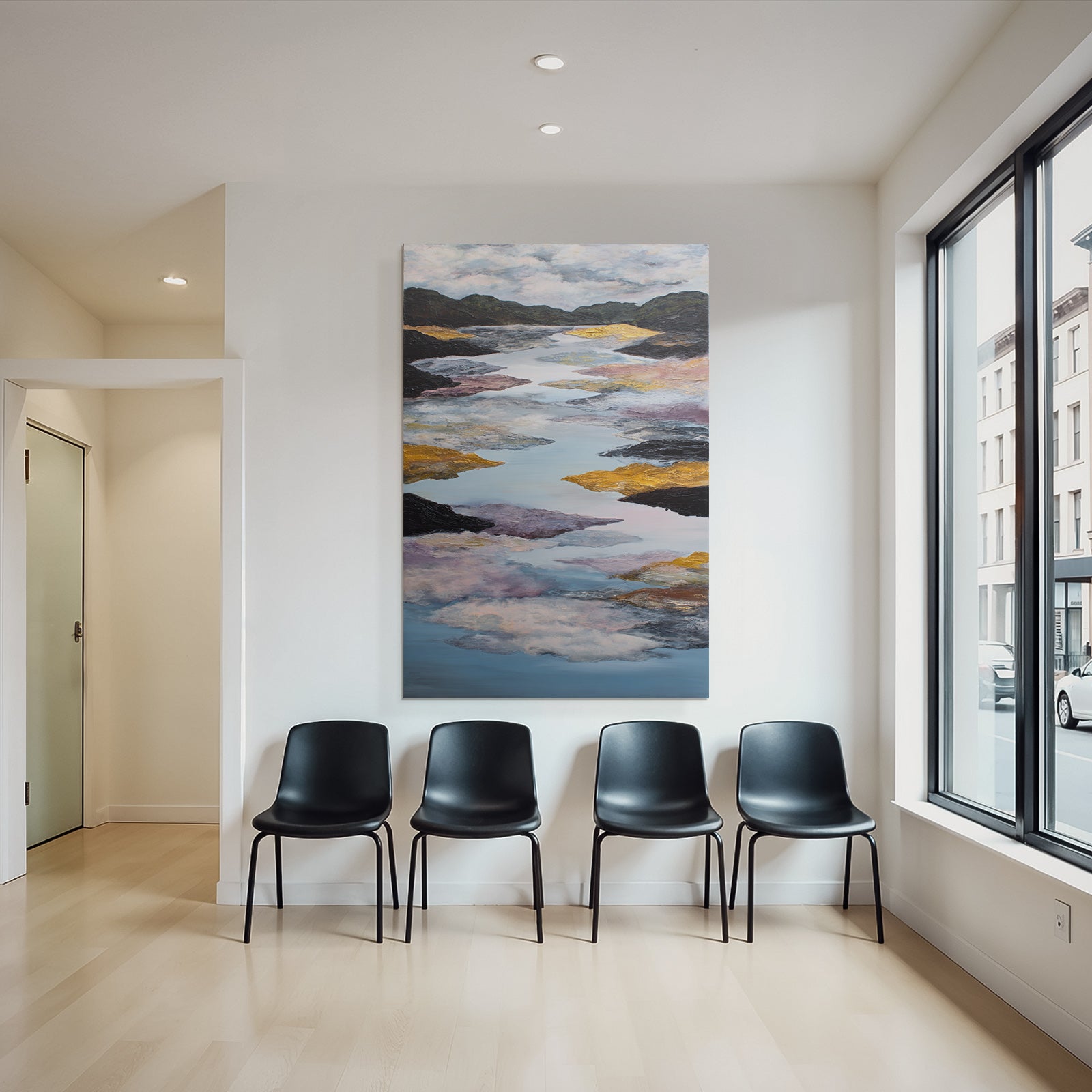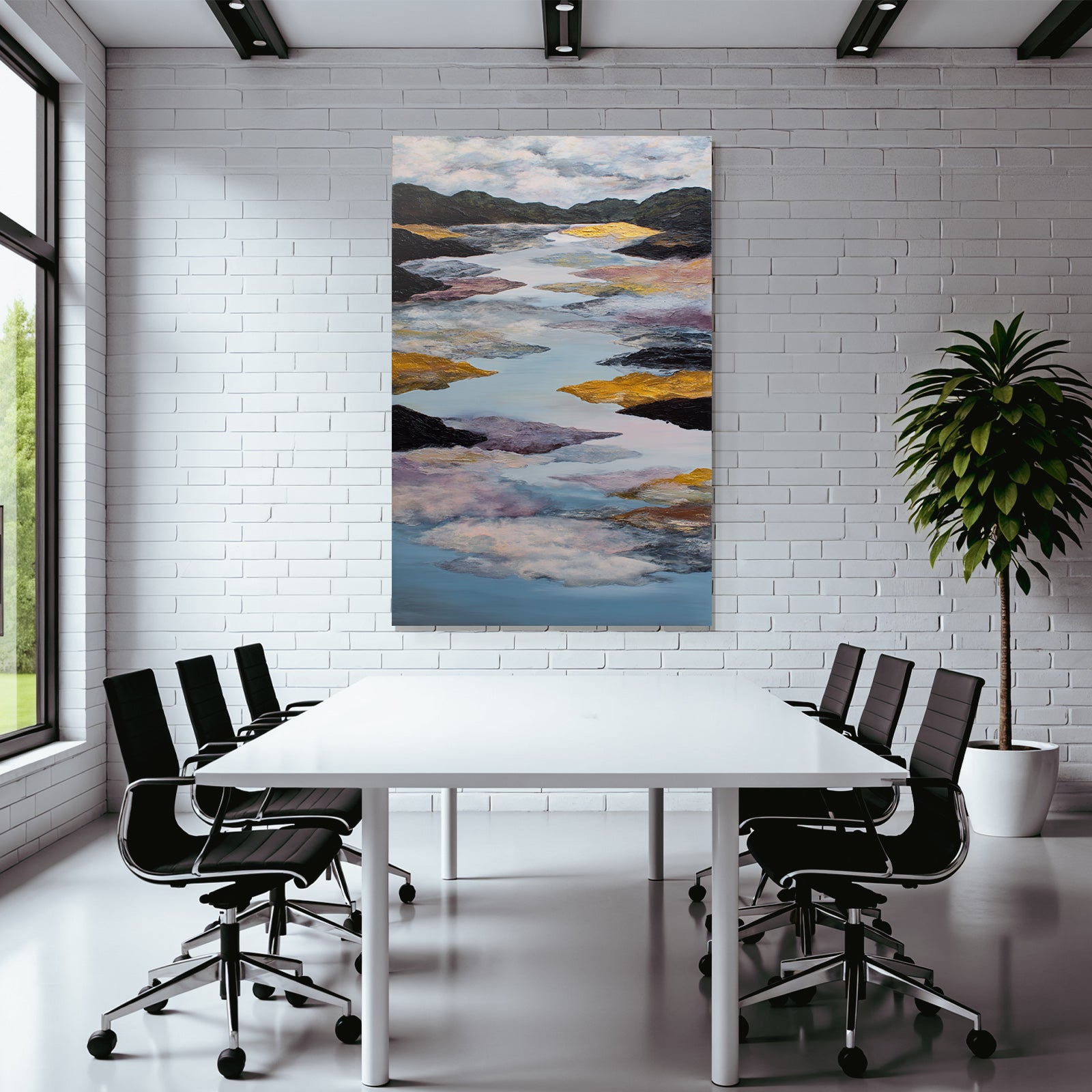 Setz ein Statement: „Yoga Meditation Abstrakte Landschaft Mit Fluss Und Hügeln Serene Atmosphäre Ruhe“ im Stil Yoga und Meditation wird im FameFrame™ zum echten Kunstobjekt an Deiner Wand.