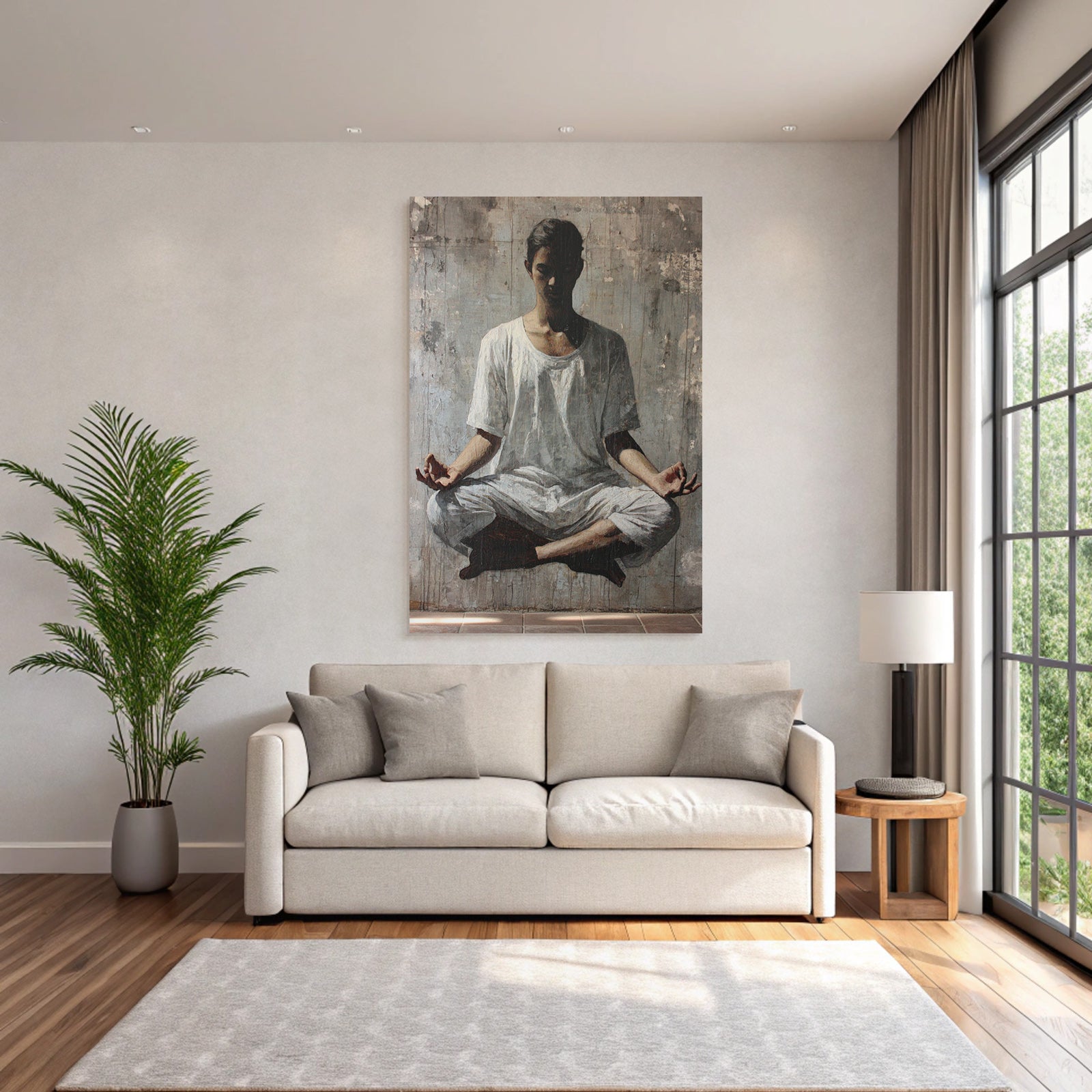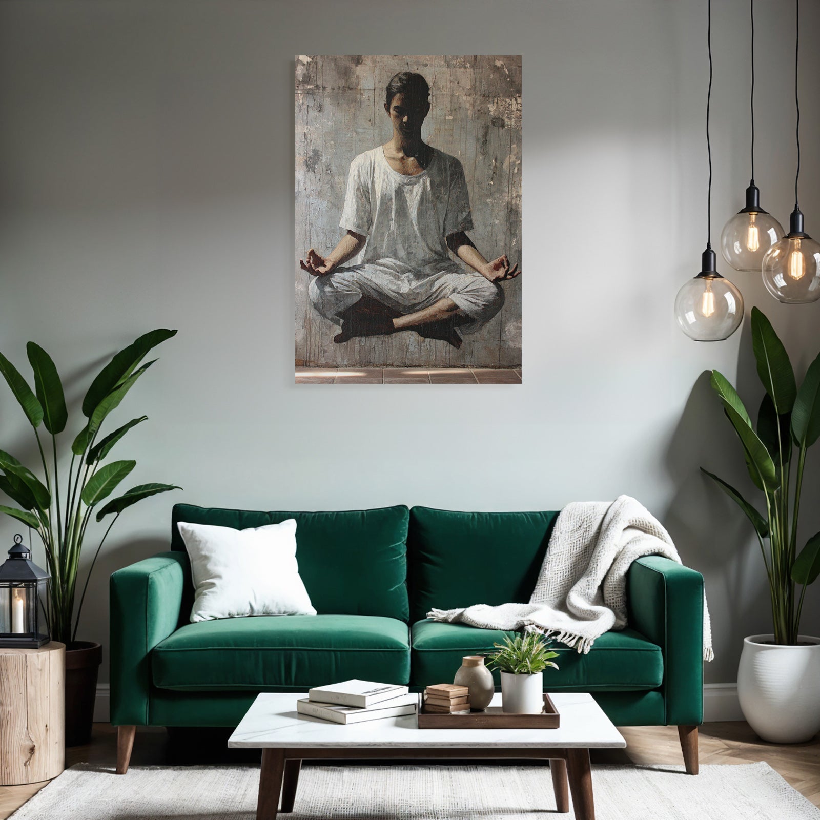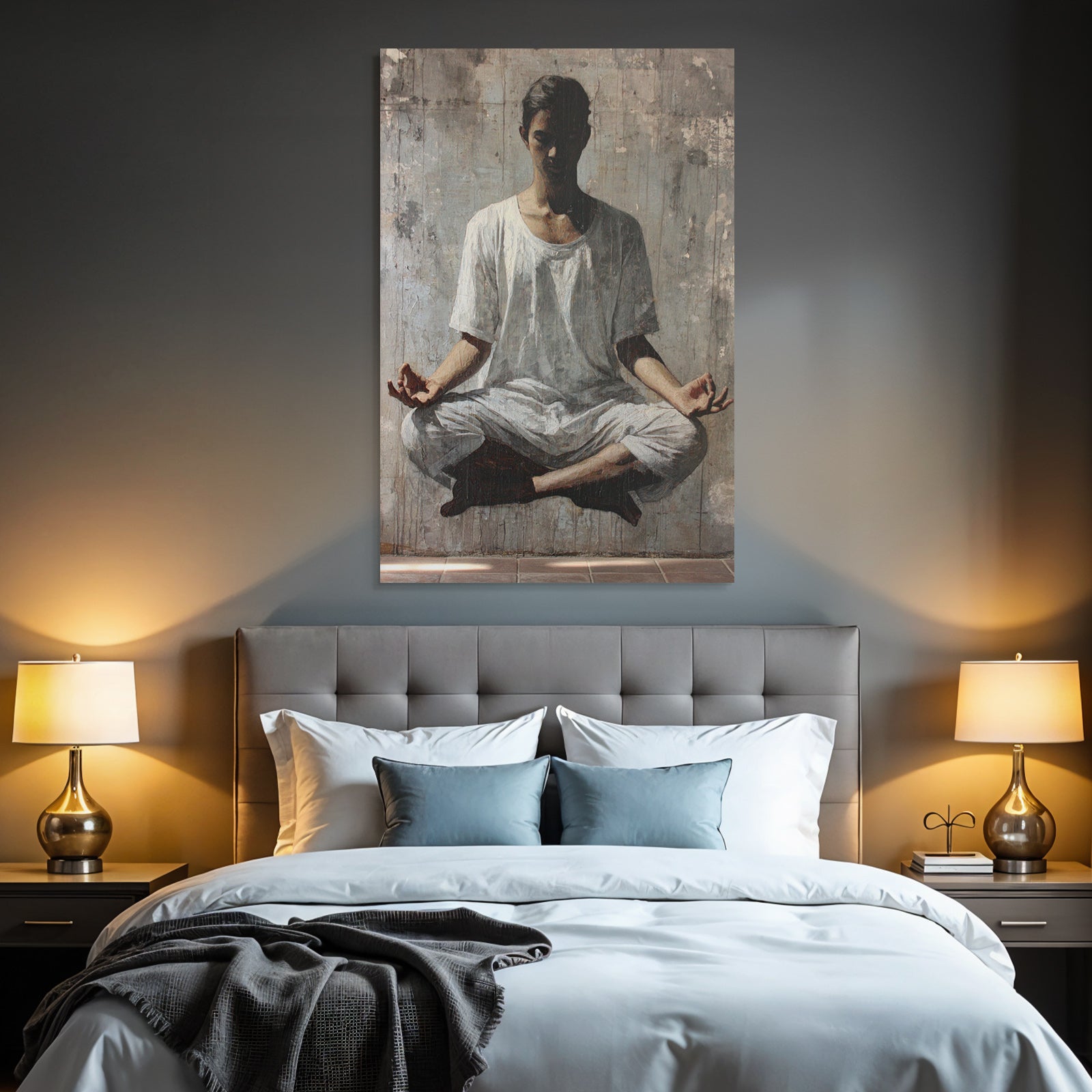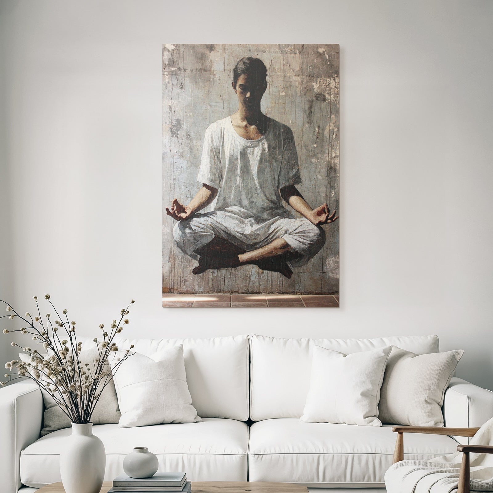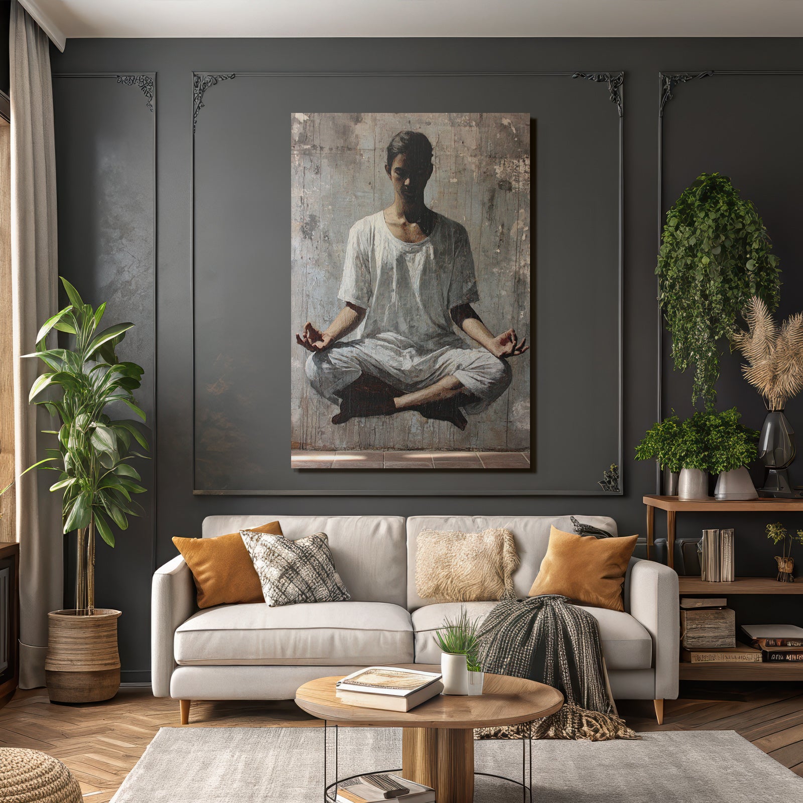 Setze stilvolle Akzente mit Kunst im Look von Yoga und Meditation. Das Werk „Yoga Meditation Meditierender Menschen In Weisser Kleidung Im Schwebenden Zustand“ entfaltet im edlen FameFrame™ seine volle Wirkung.