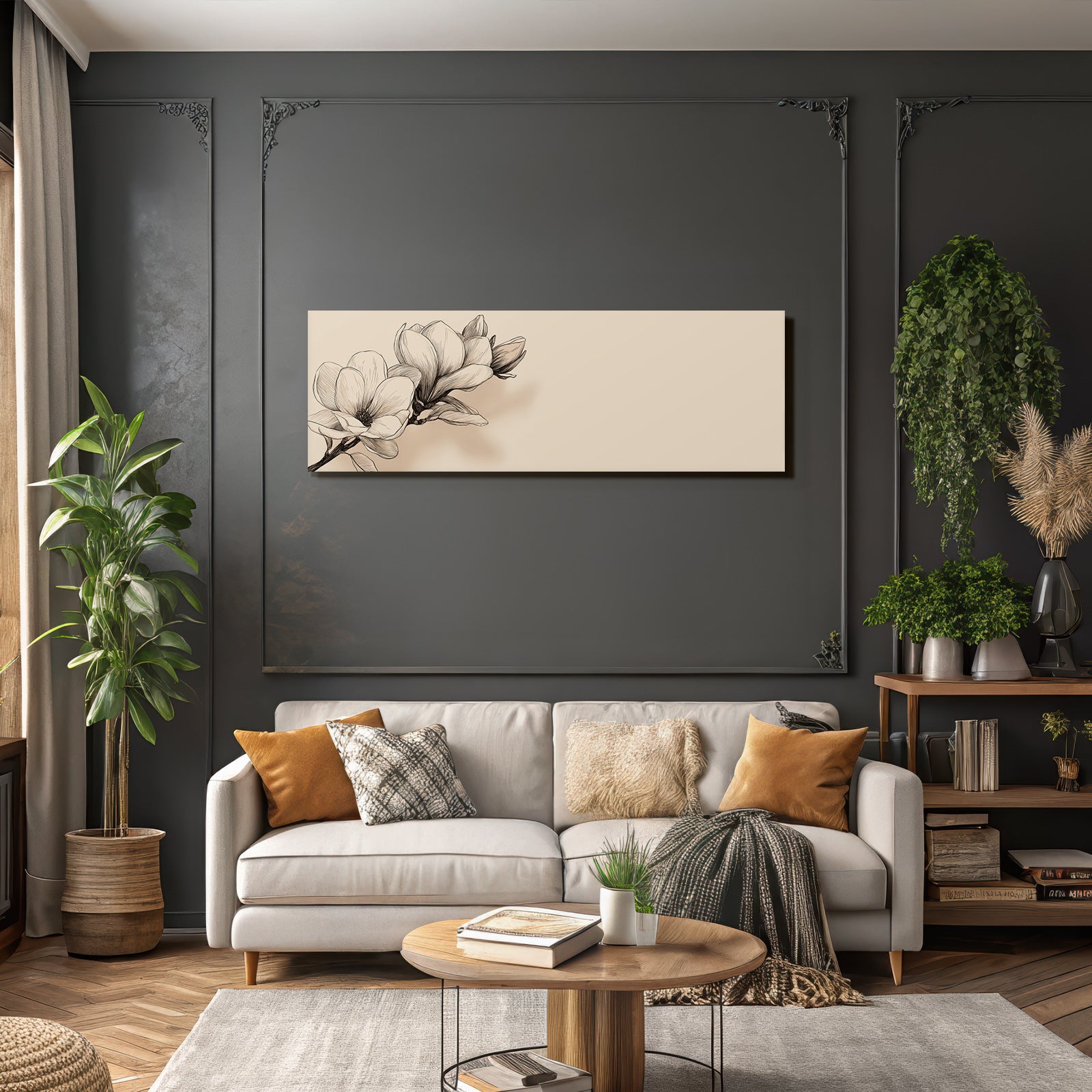 Ob Flur, Wohnraum oder Wartebereich – das Motiv „Magnolienblumen Illustration Botanische Darstellung“ im Stil Illustration und Zeichnung wirkt durch den hochwertigen FameFrame besonders modern.
