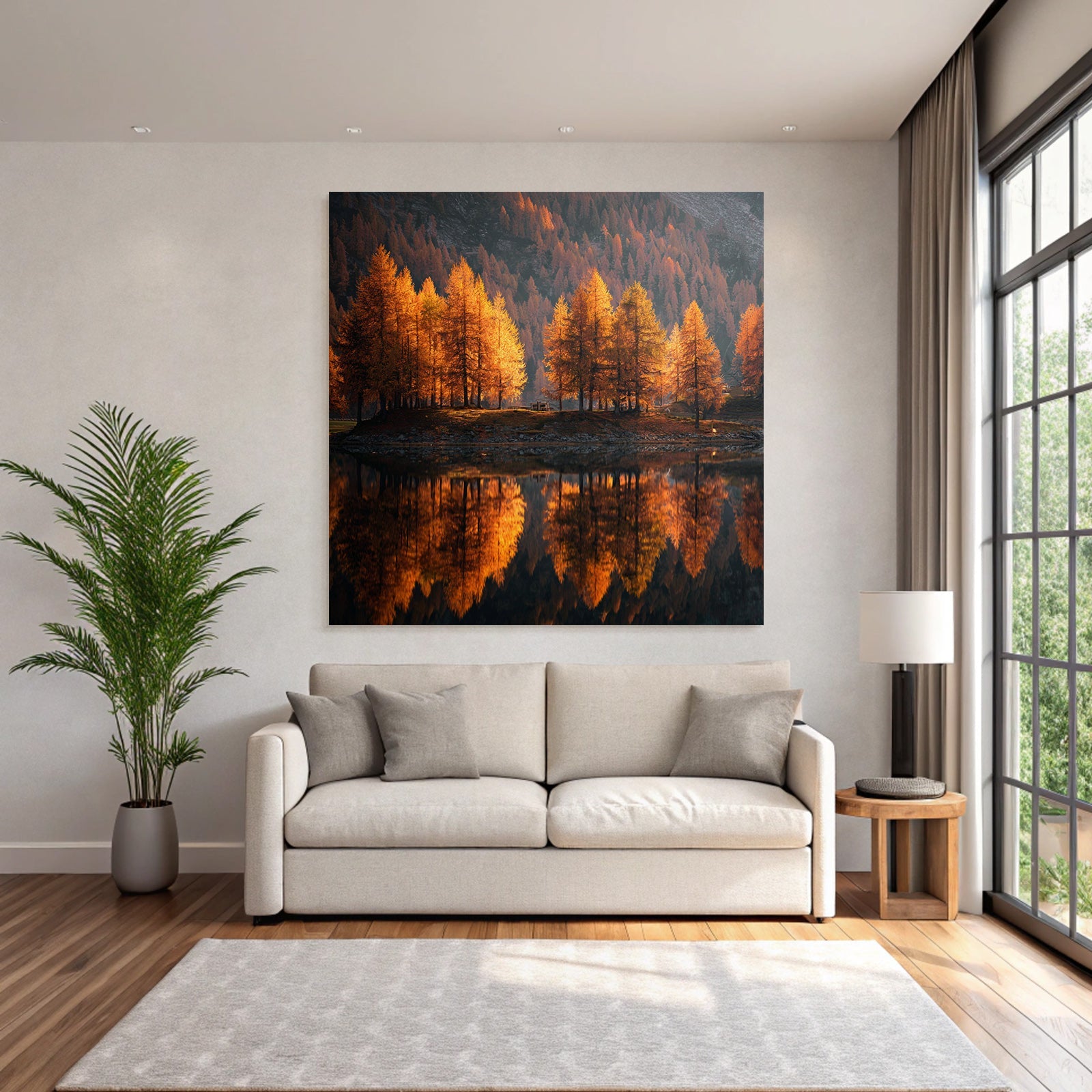 Mach mehr aus Deinem Wohnbereich oder Besprechungszimmer„Ruhige Landschaft Herbstbaumspiegelung Mit Bergen“ im Stil Indian Summer überzeugt als eleganter Textildruck im FameFrame.