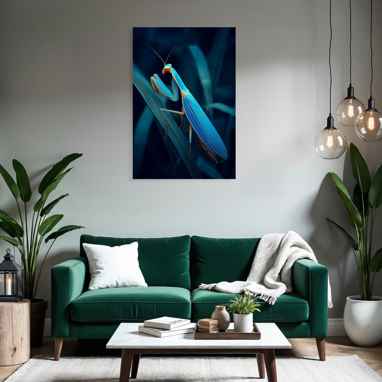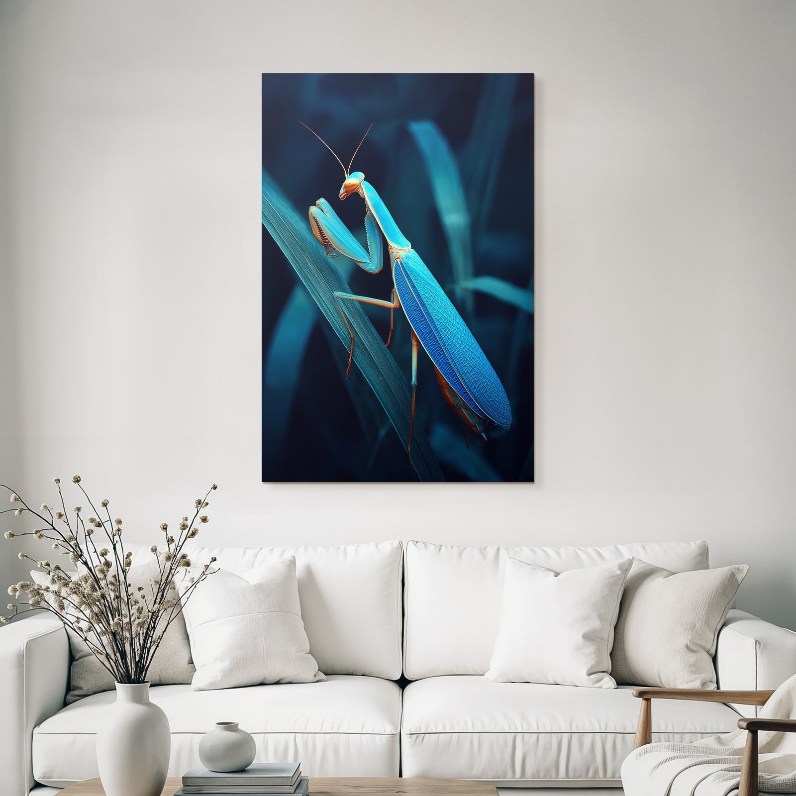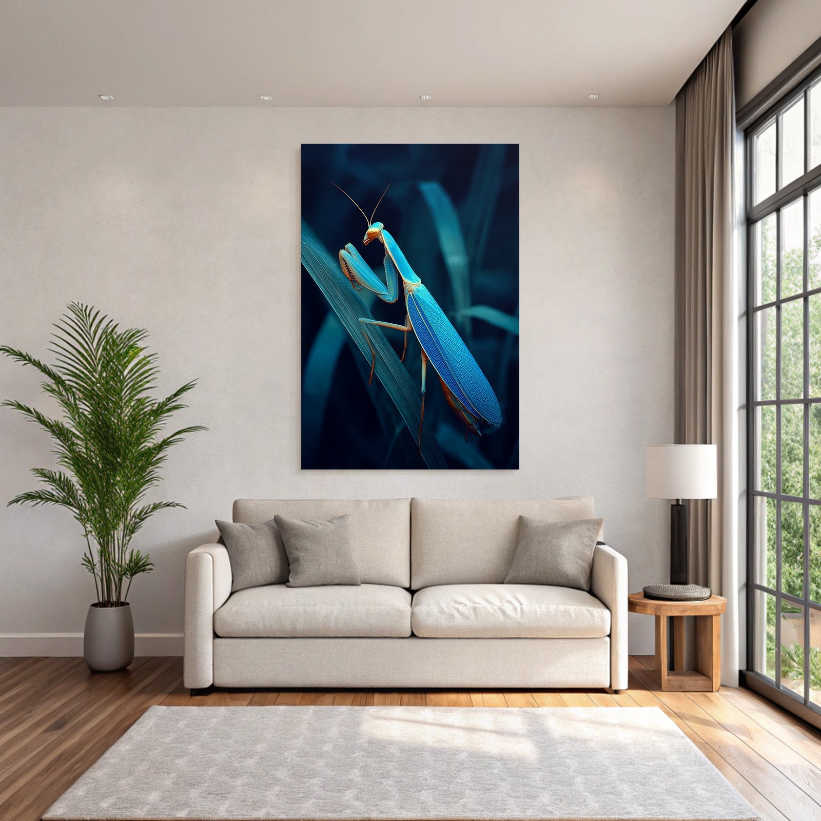 Verwandeln Sie Ihr Schlafzimmer in eine Oase der Ruhe. Das Motiv „Gottesanbeterin Digital Kunstwerk“ im Stil Insekten und Amphibien wirkt im FameFrame besonders harmonisch und beruhigend.