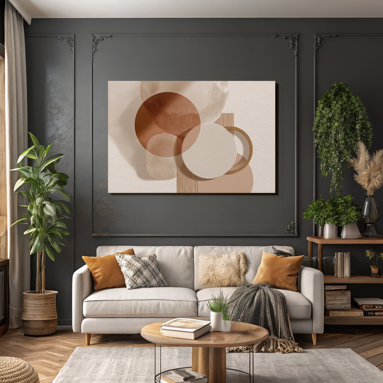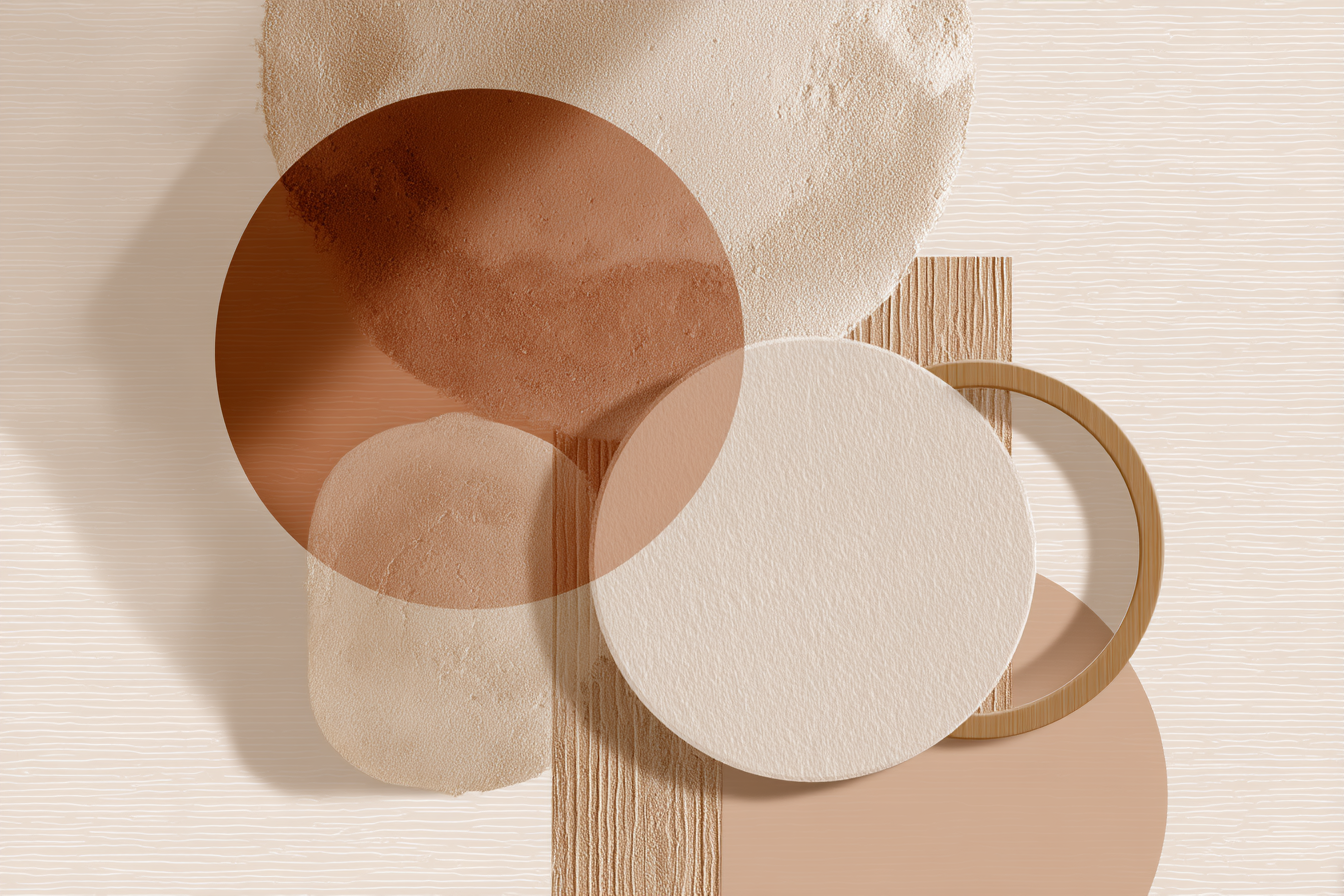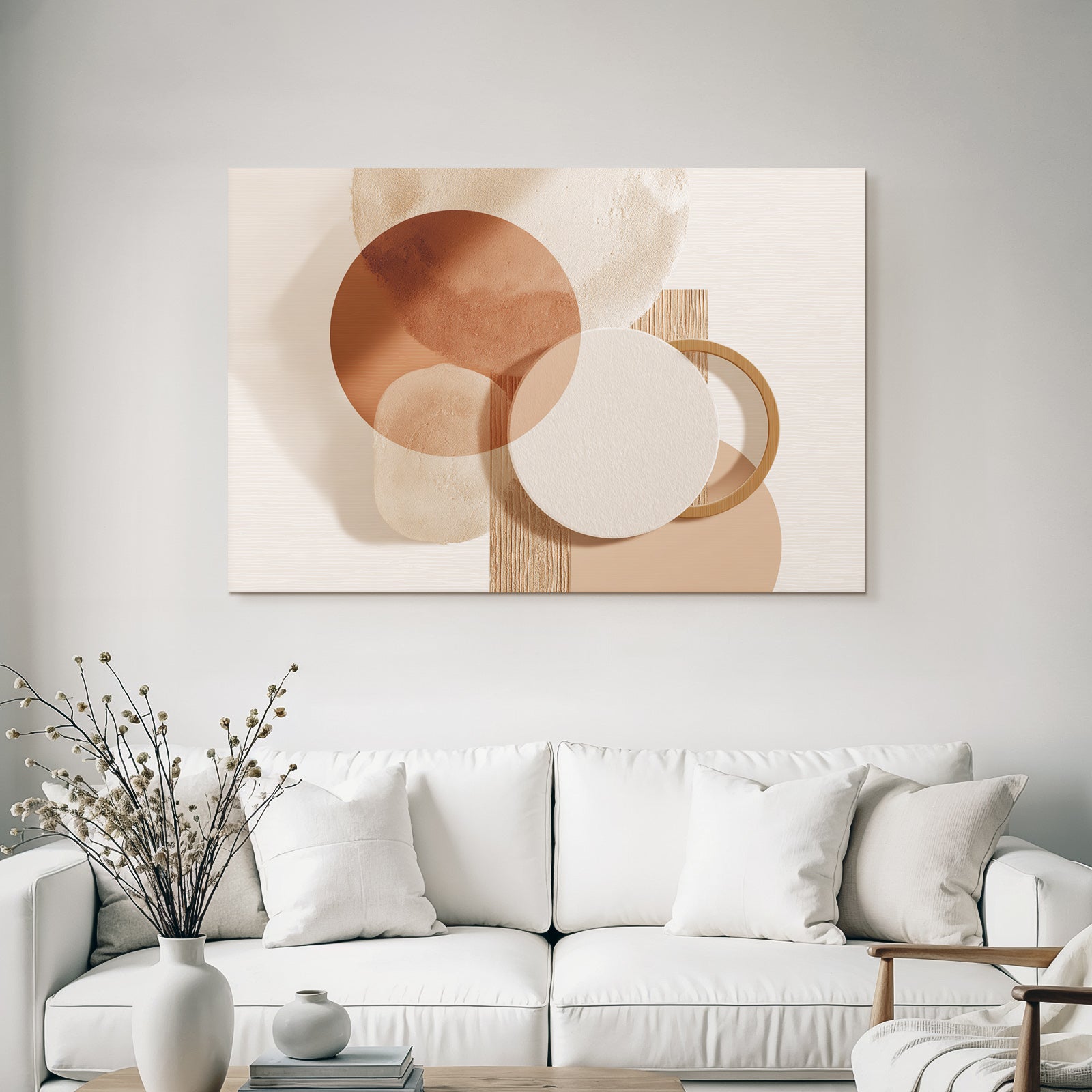 Ein einzigartiges Kunstwerk der Produktlinie FameFrame mit dem Titel „„Abstraktes Design Ueberlappende Kreise Erdtoene““, im Stil Japandi.