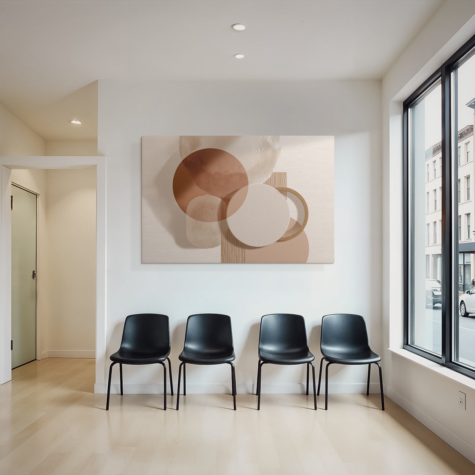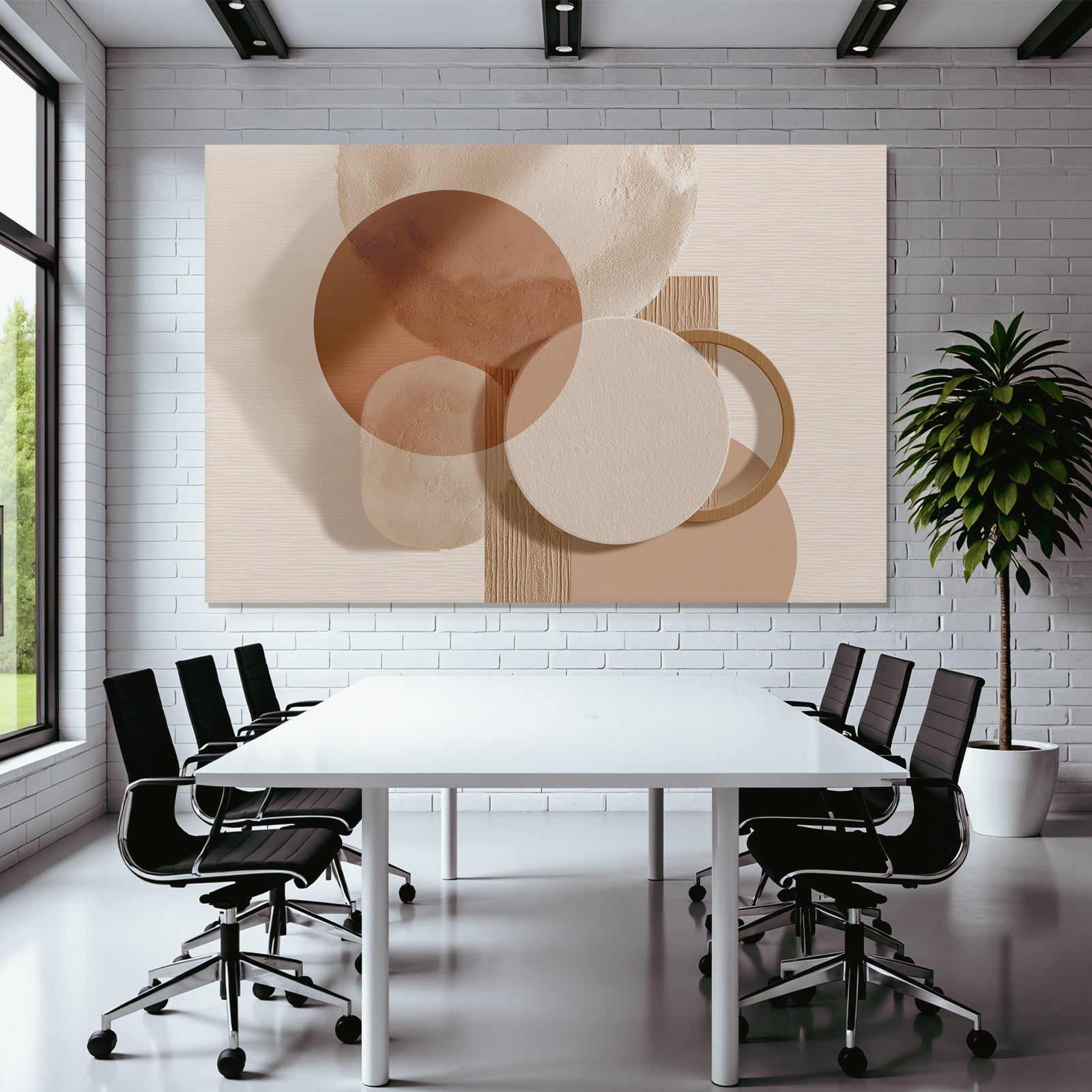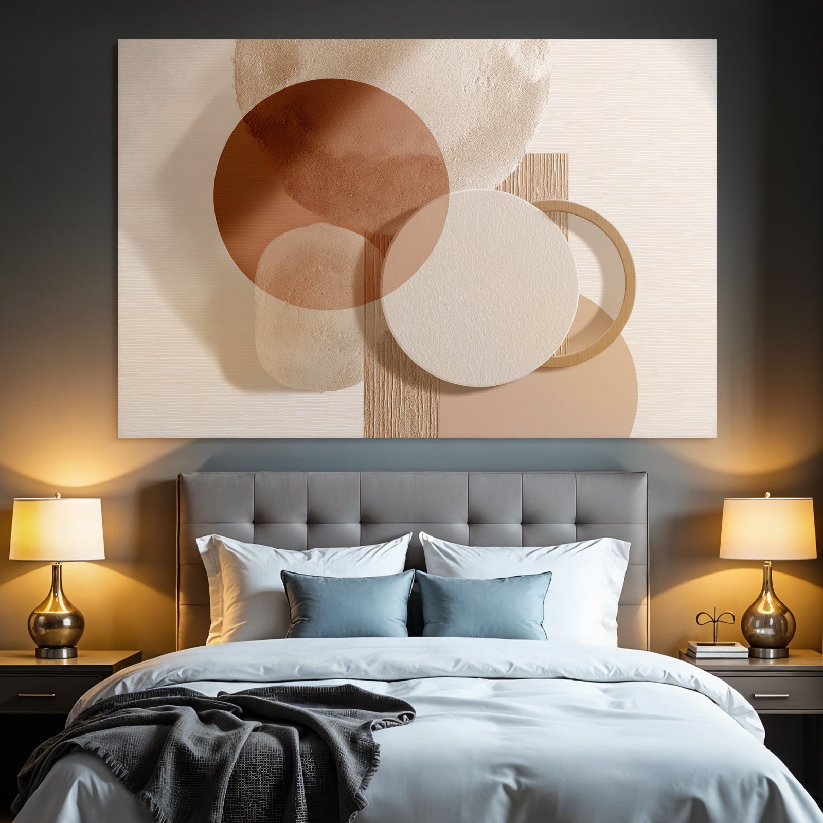 Ein einzigartiges Kunstwerk der Produktlinie FameFrame mit dem Titel „„Abstraktes Design Ueberlappende Kreise Erdtoene““, im Stil Japandi.
