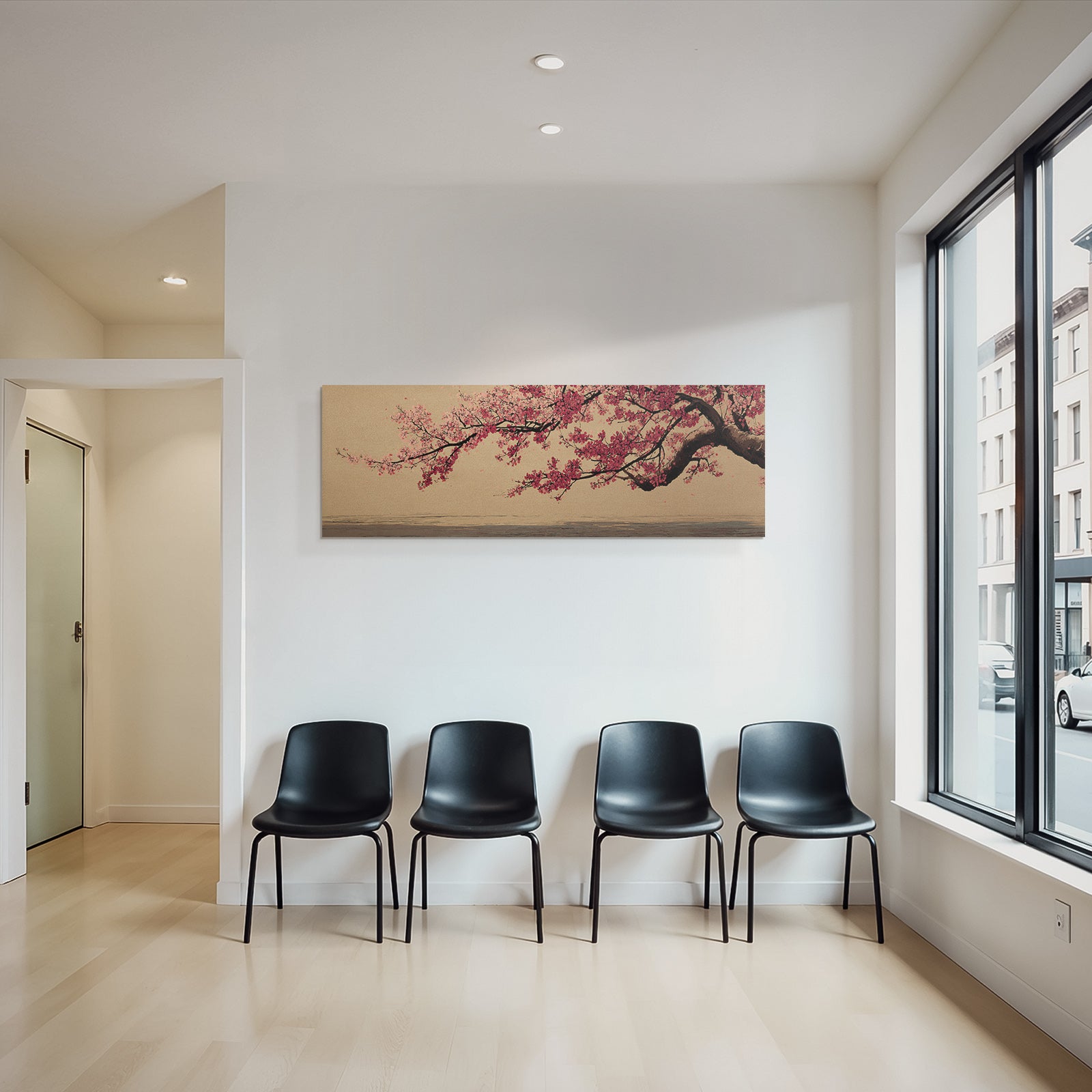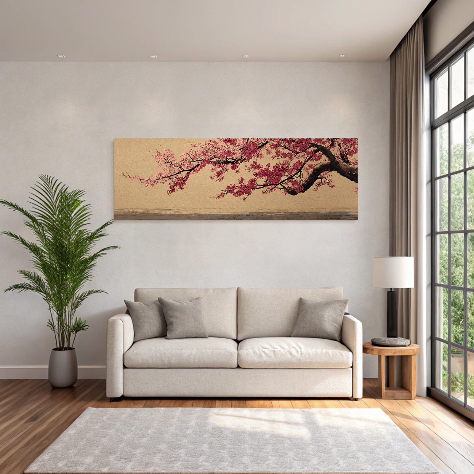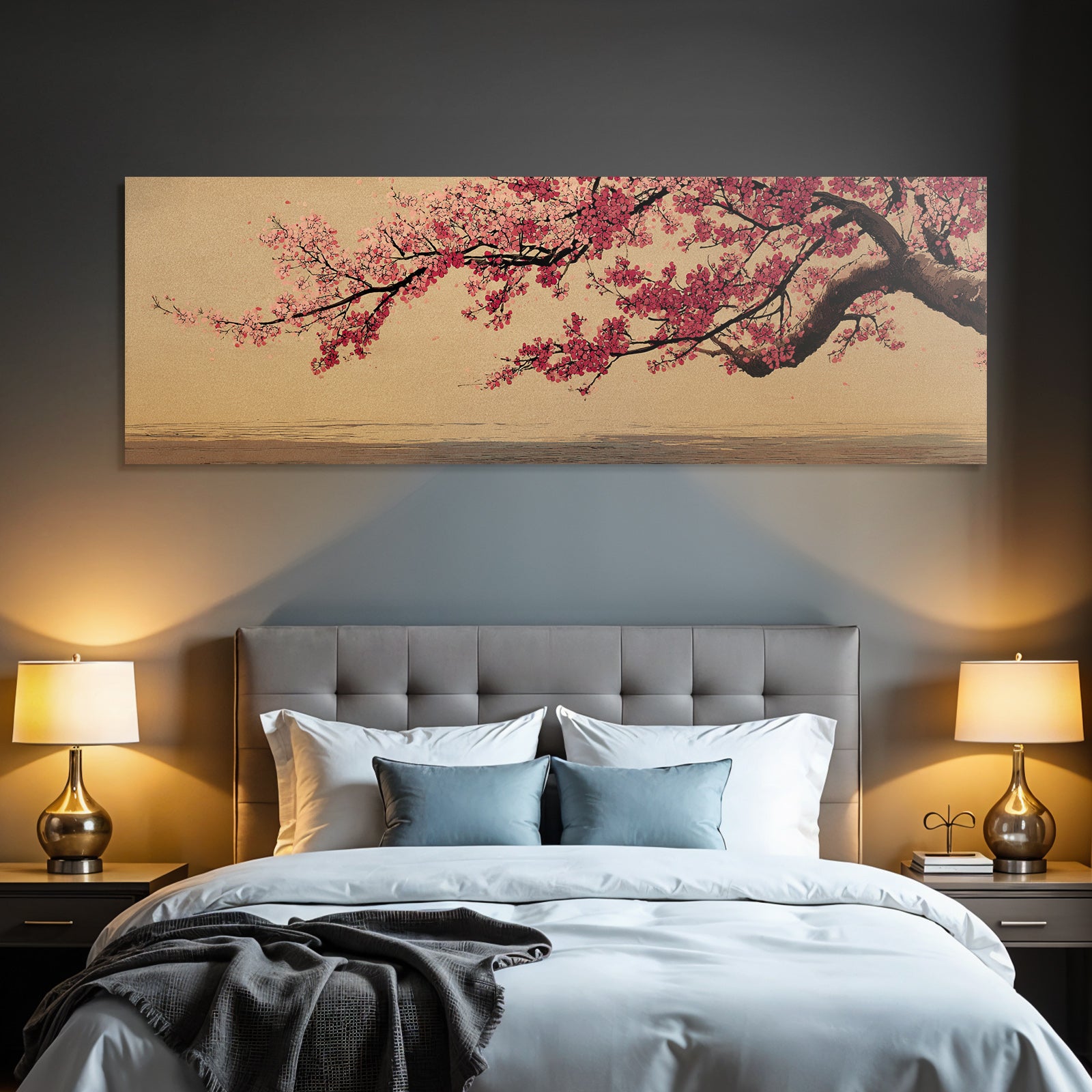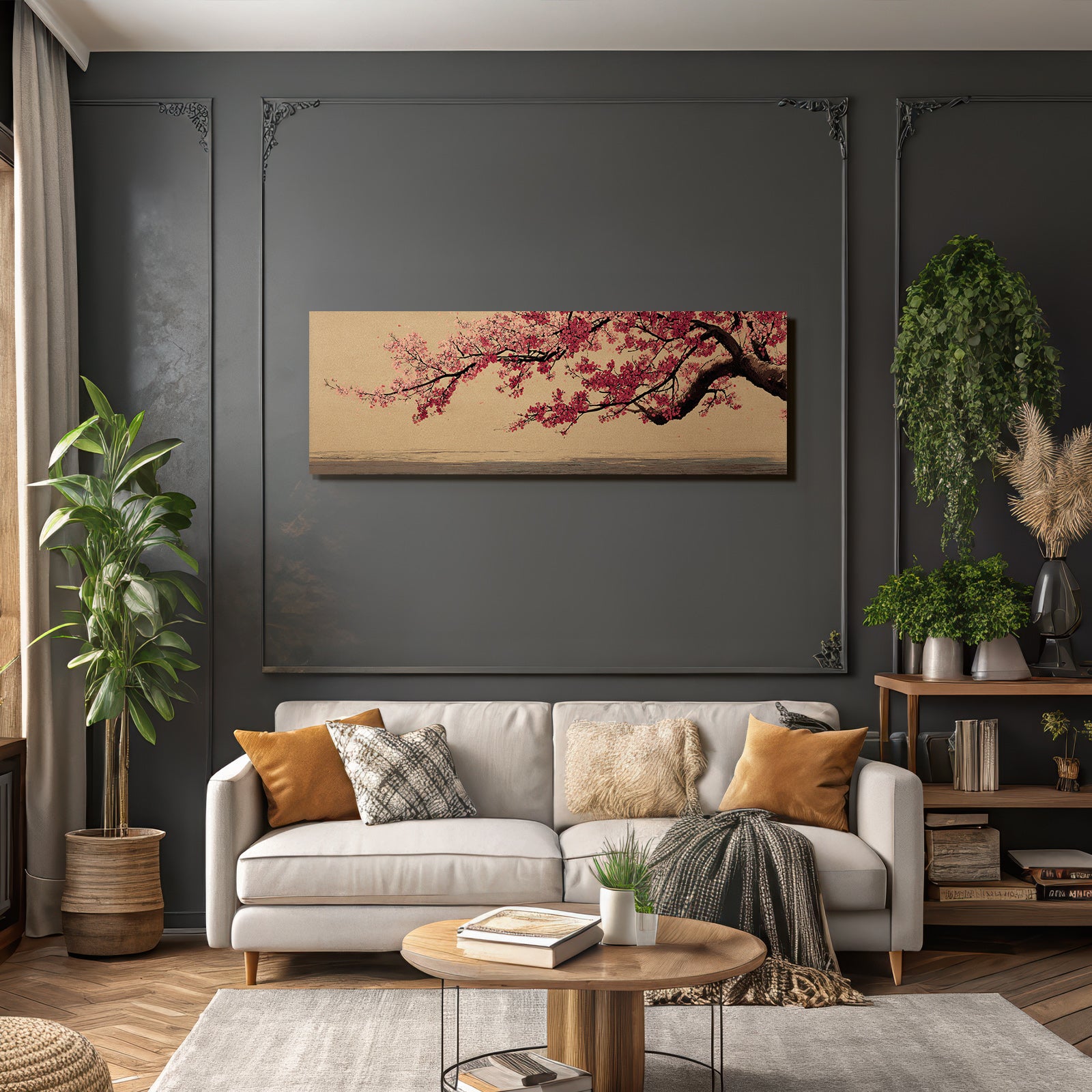 Mit Japanische Zierkirsche-Elementen und klarer Wirkung verleiht „Kirschblüten Zweig Vor Texturiertem Hintergrund“ Deinem Raum Persönlichkeit – eingerahmt im exklusiven FameFrame.