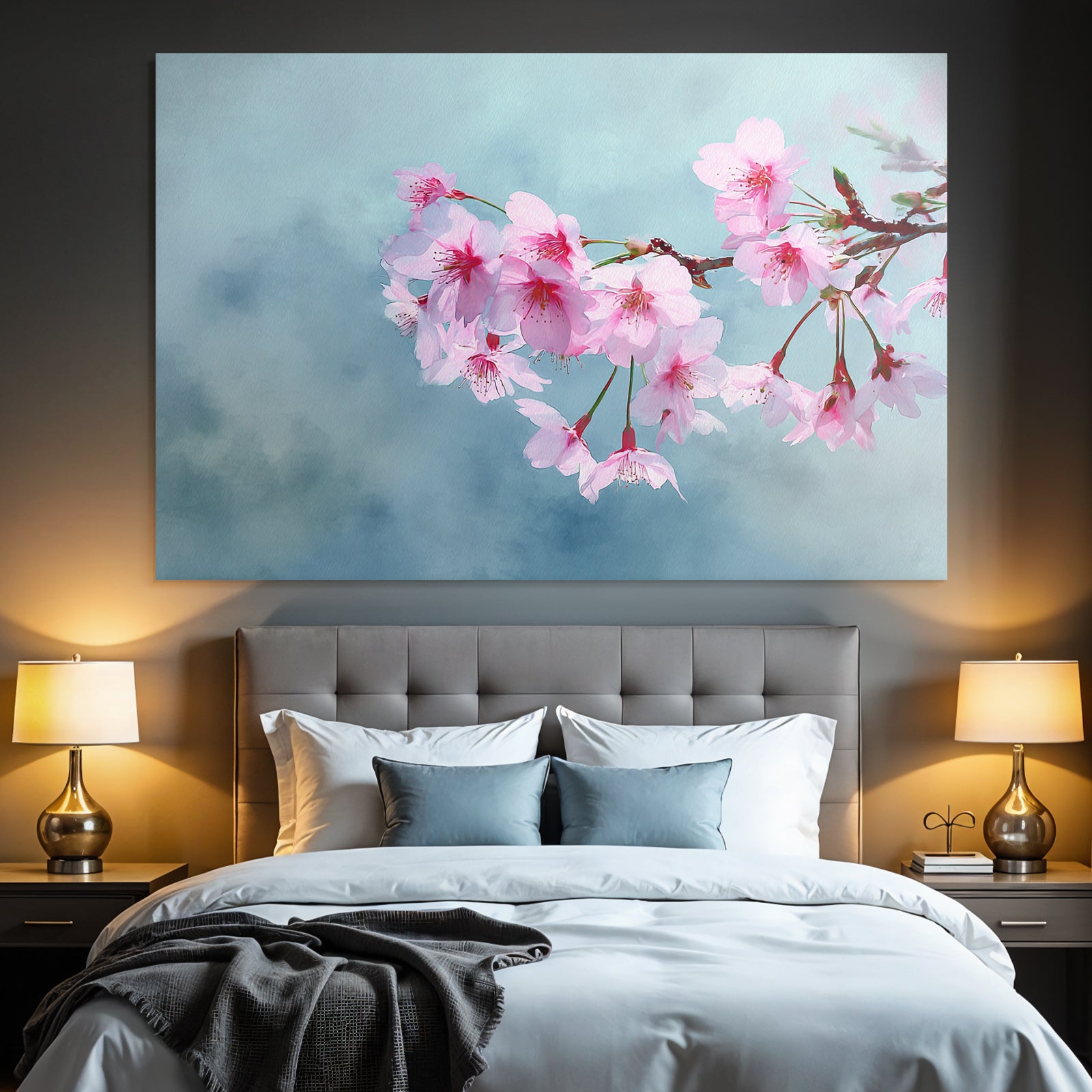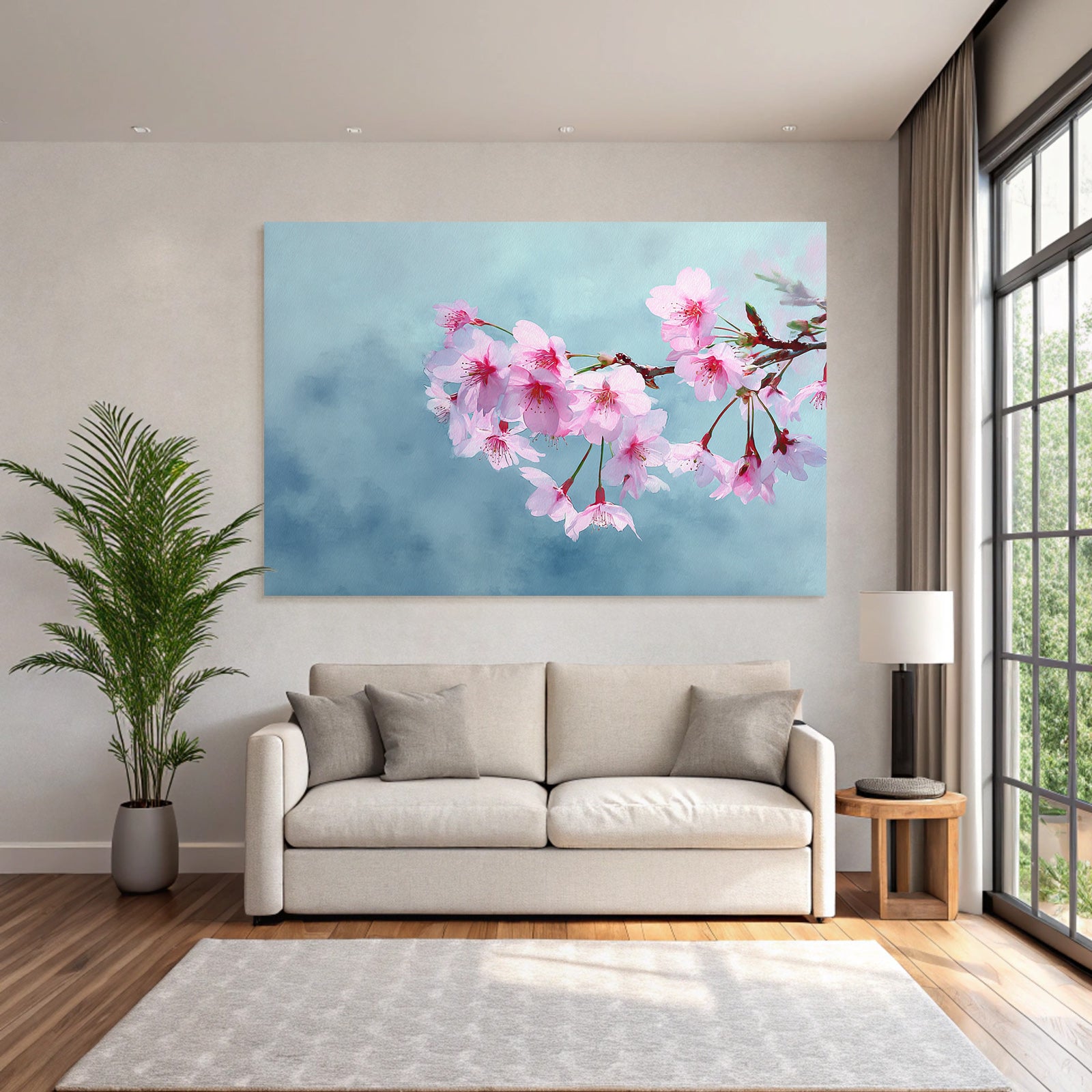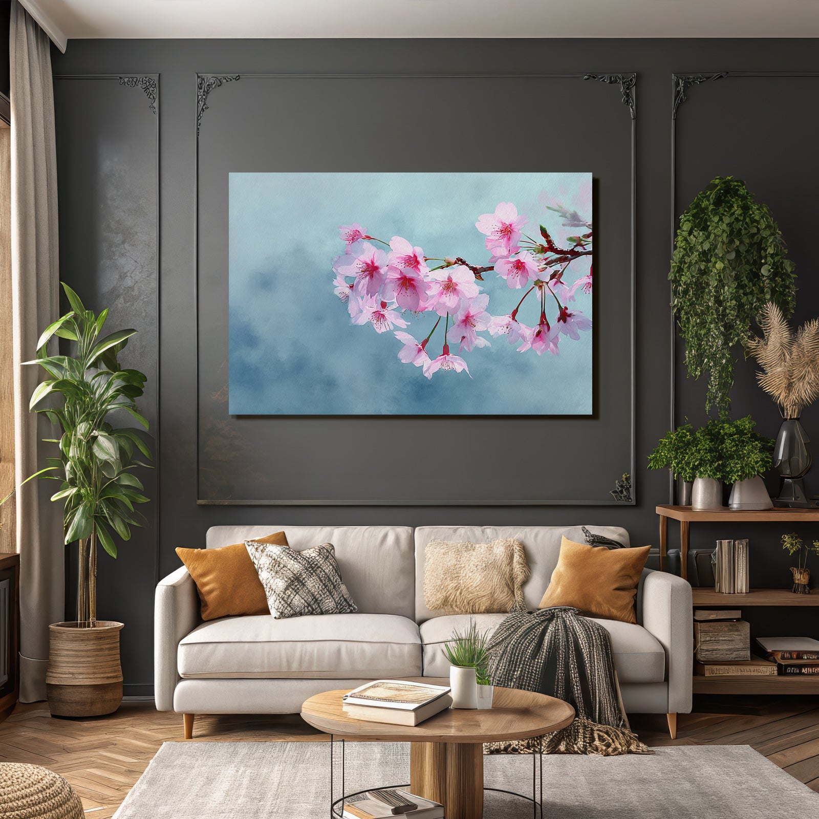 Tauchen Sie ein in die Welt von Japanische Zierkirsche. Das Motiv „Zweig Mit Rosafarbenen Kirschbluten Vor Hellblaüm Hintergrund“ ist ein herausragendes Beispiel dieses Stils, das im FameFrame eine besondere Tiefe erhält.