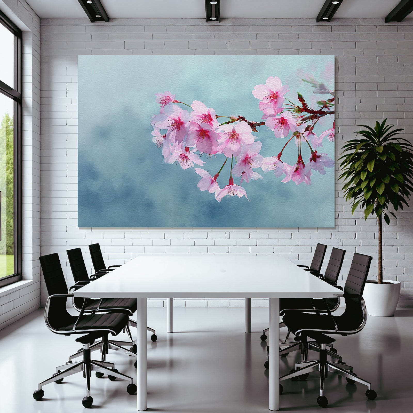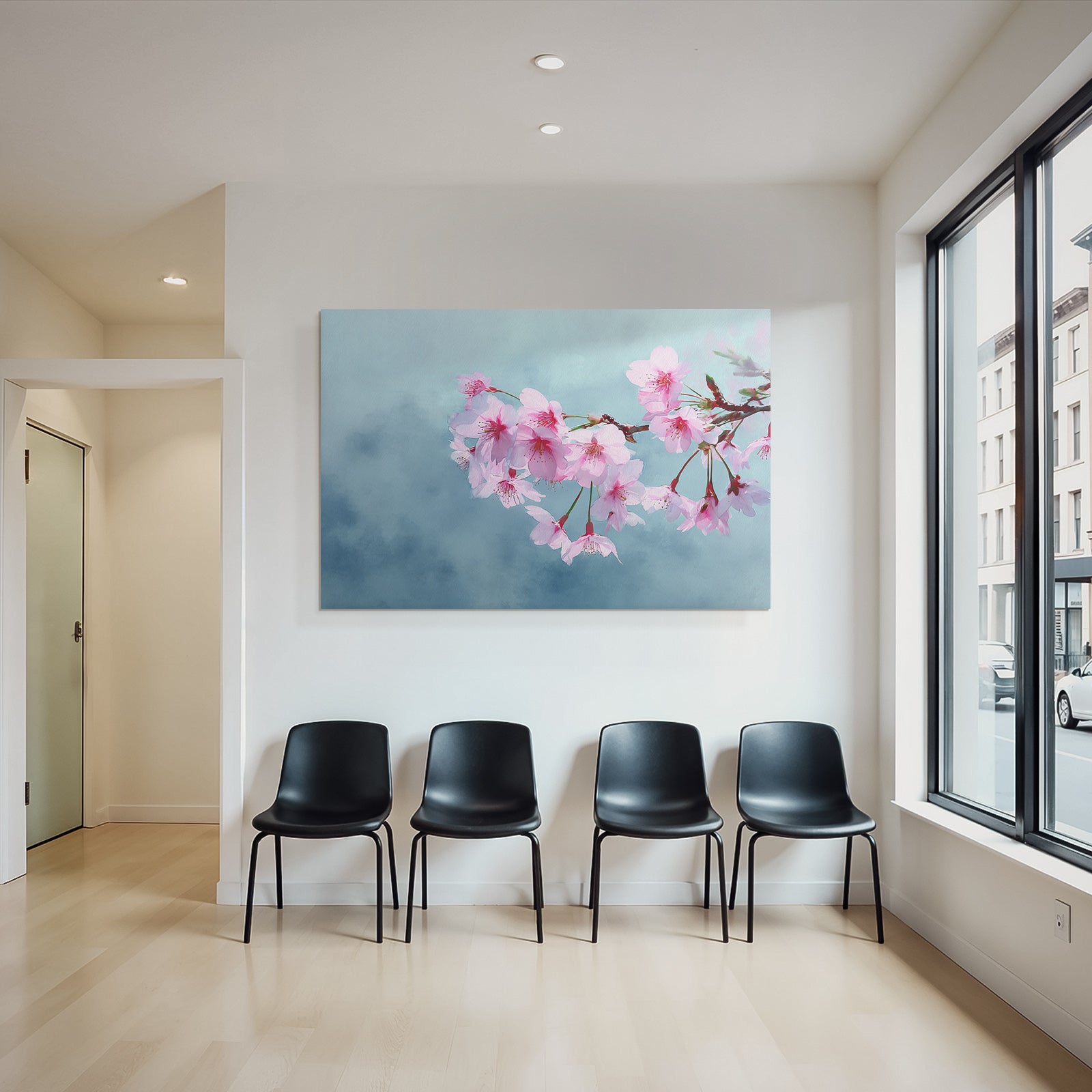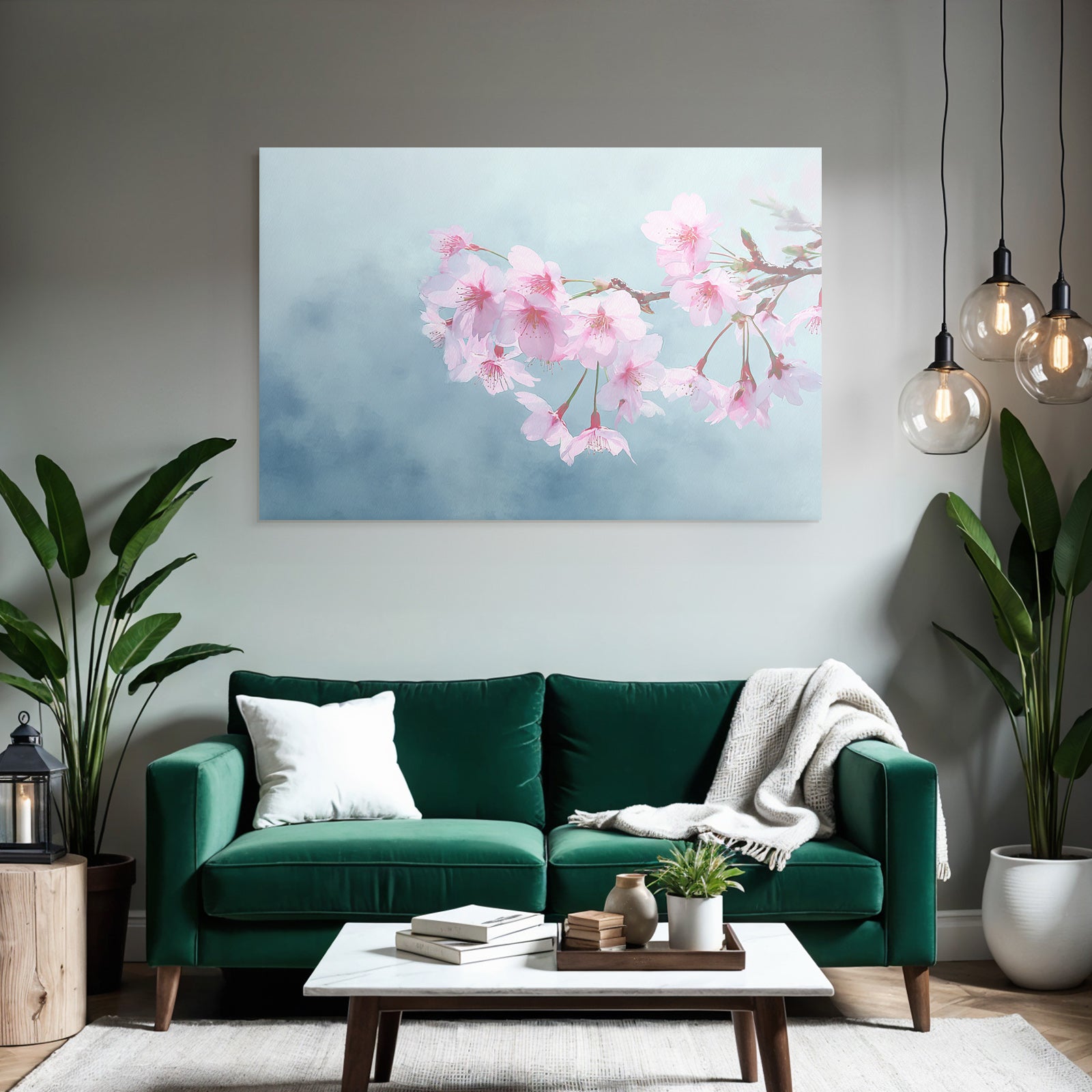 Tauchen Sie ein in die Welt von Japanische Zierkirsche. Das Motiv „Zweig Mit Rosafarbenen Kirschbluten Vor Hellblaüm Hintergrund“ ist ein herausragendes Beispiel dieses Stils, das im FameFrame eine besondere Tiefe erhält.