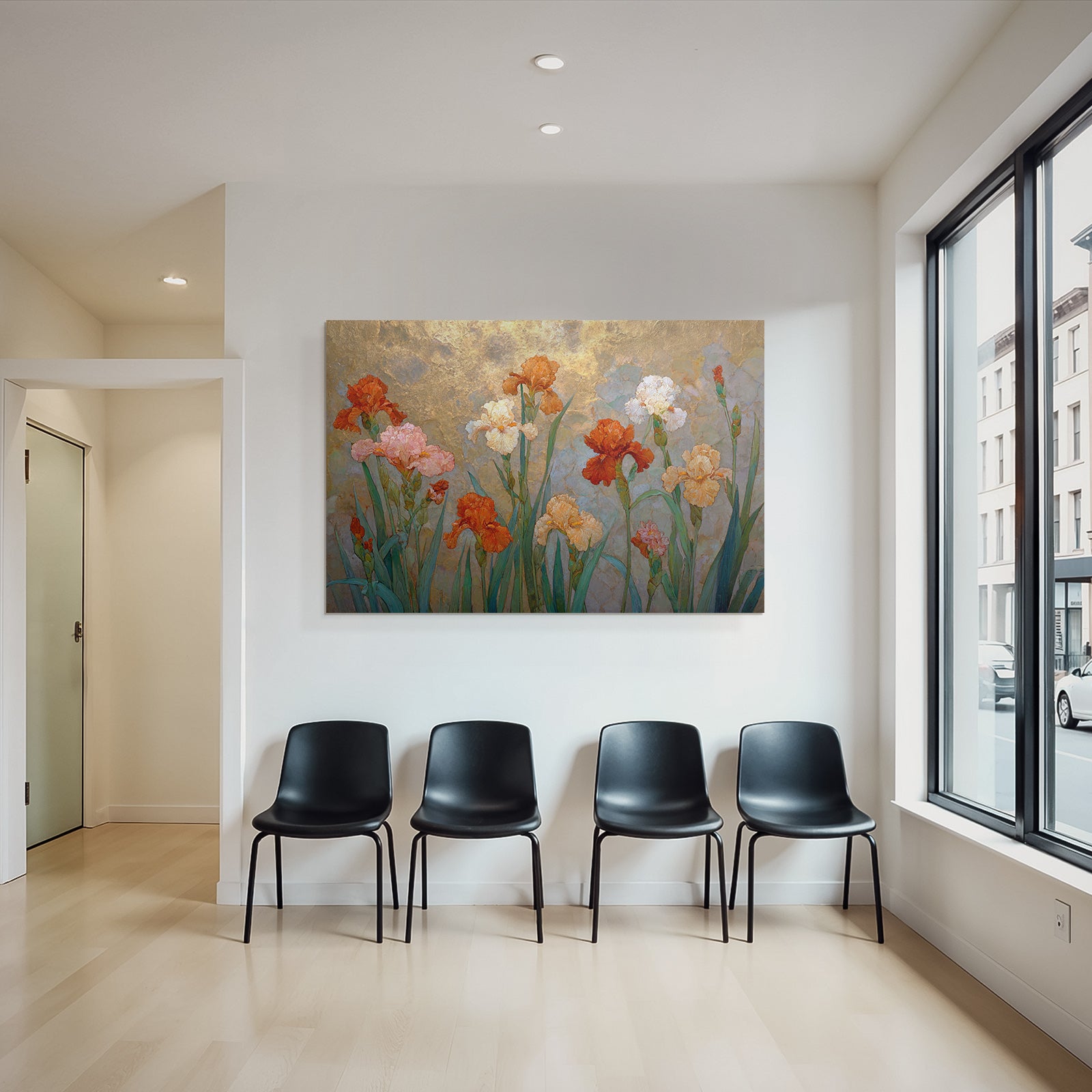 Ob für eine exklusive Boutique, ein modernes Restaurant oder Ihr Esszimmer – „Bunte Iris Auf Goldenem Hintergrund“ im Jugendstil-Design schafft im FameFrame™ ein unvergessliches Ambiente.