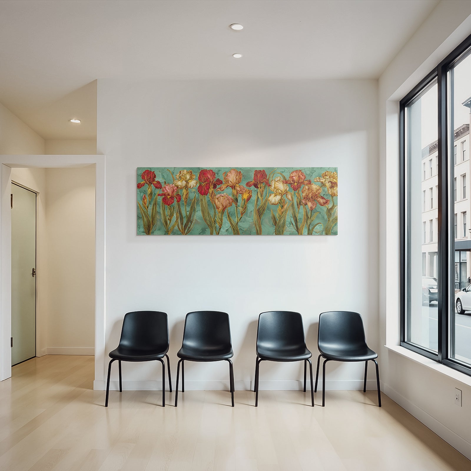 Gestalten Sie Ihr Homeoffice oder Büro inspirierend und modern. „Bunte Irisblüten Auf Grünem Hintergrund“ im Jugendstil-Look sorgt im FameFrame™ für eine kreative Arbeitsatmosphäre.